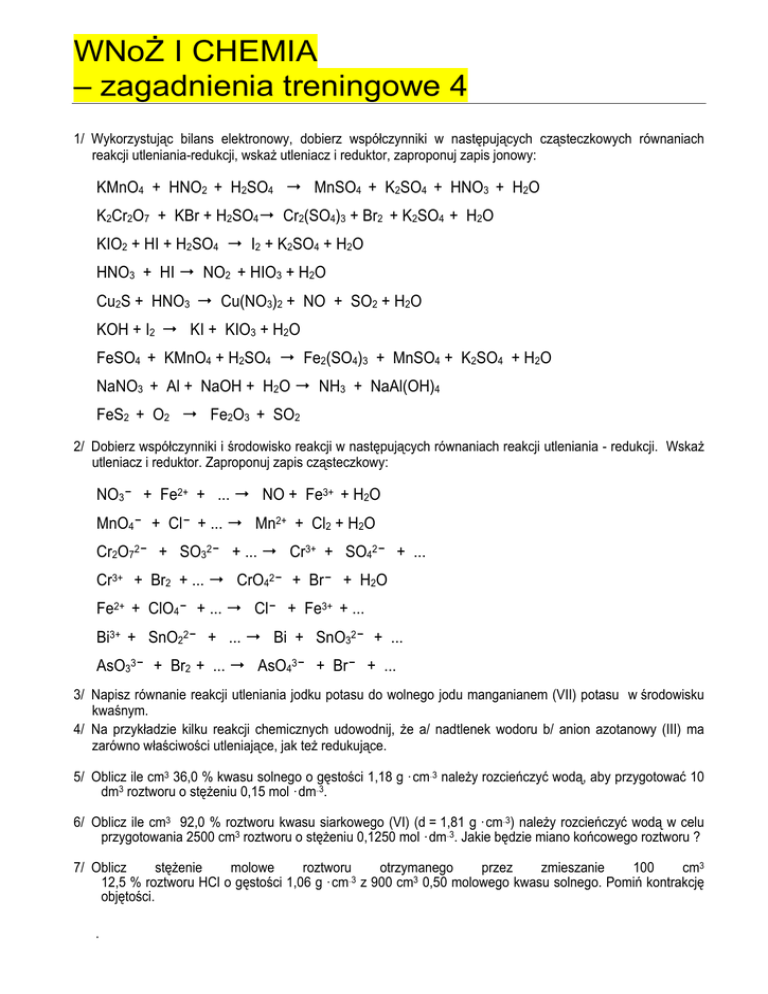 WNoŻ I CHEMIA – zagadnienia treningowe 4 1/ Wykorzystując bilans elektronowy, dobierz współczynniki w następujących cząsteczkowych równaniach reakcji utleniania-redukcji, wskaż utleniacz i reduktor, zaproponuj zapis jonowy: KMnO4 + HNO2 + H2SO4 " MnSO4 + K2SO4 + HNO3 + H2O K2Cr2O7 + KBr + H2SO4" Cr2(SO4)3 + Br2 + K2SO4 + H2O KIO2 + HI + H2SO4 " I2 + K2SO4 + H2O HNO3 + HI " NO2 + HIO3 + H2O Cu2S + HNO3 " Cu(NO3)2 + NO + SO2 + H2O KOH + I2 " KI + KIO3 + H2O FeSO4 + KMnO4 + H2SO4 " Fe2(SO4)3 + MnSO4 + K2SO4 + H2O NaNO3 + Al + NaOH + H2O " NH3 + NaAl(OH)4 FeS2 + O2 " Fe2O3 + SO2 2/ Dobierz współczynniki i środowisko reakcji w następujących równaniach reakcji utleniania - redukcji. Wskaż utleniacz i reduktor. Zaproponuj zapis cząsteczkowy: NO30 + Fe2+ + ... " NO + Fe3+ + H2O MnO40 + Cl0 + ... " Mn2+ + Cl2 + H2O Cr2O720 + SO320 + ... " Cr3+ + SO420 + ... Cr3+ + Br2 + ... " CrO420 + Br0 + H2O Fe2+ + ClO40 + ... " Cl0 + Fe3+ + ... Bi3+ + SnO220 + ... " Bi + SnO320 + ... AsO330 + Br2 + ... " AsO430 + Br0 + ... 3/ Napisz równanie reakcji utleniania jodku potasu do wolnego jodu manganianem (VII) potasu w środowisku kwaśnym. 4/ Na przykładzie kilku reakcji chemicznych udowodnij, że a/ nadtlenek wodoru b/ anion azotanowy (III) ma zarówno właściwości utleniające, jak też redukujące. 5/ Oblicz ile cm3 36,0 % kwasu solnego o gęstości 1,18 g·cm 3 należy rozcieńczyć wodą, aby przygotować 10 dm3 roztworu o stężeniu 0,15 mol·dm 3. − − 6/ Oblicz ile cm3 92,0 % roztworu kwasu siarkowego (VI) (d = 1,81 g·cm 3) należy rozcieńczyć wodą w celu przygotowania 2500 cm3 roztworu o stężeniu 0,1250 mol·dm 3. Jakie będzie miano końcowego roztworu ? − − 7/ Oblicz stężenie molowe roztworu otrzymanego przez zmieszanie 100 cm3 12,5 % roztworu HCl o gęstości 1,06 g·cm 3 z 900 cm3 0,50 molowego kwasu solnego. Pomiń kontrakcję objętości. − .