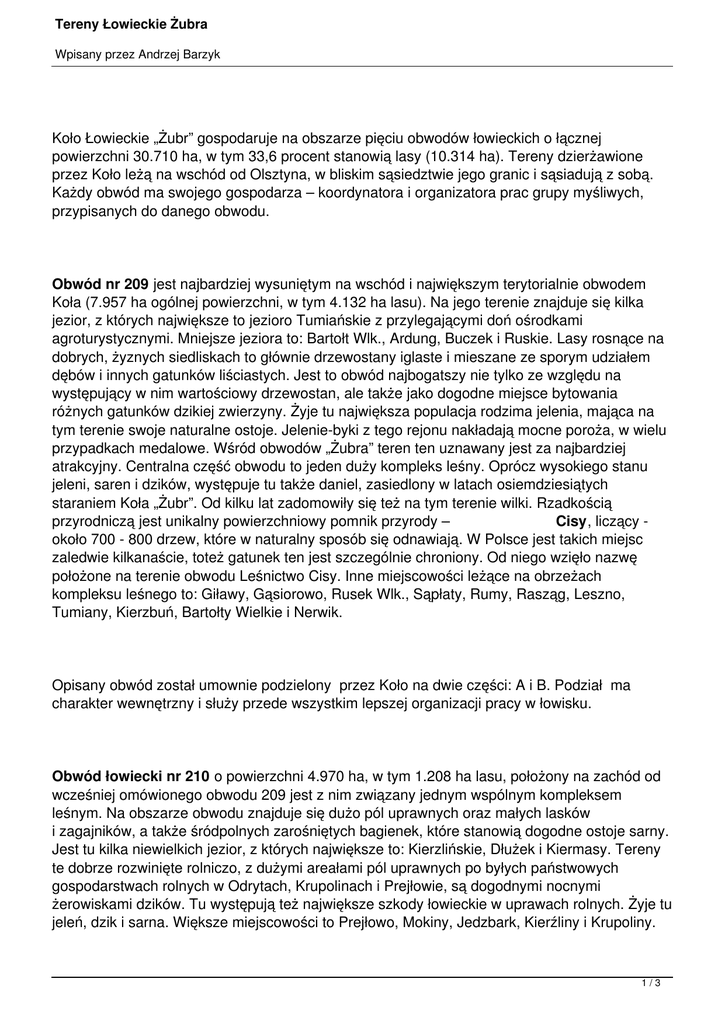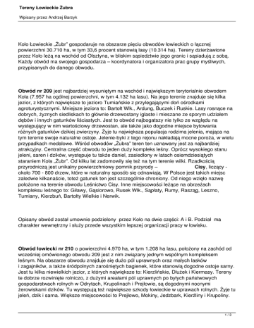 Tereny Łowieckie Żubra Wpisany przez Andrzej Barzyk Koło Łowieckie „Żubr” gospodaruje na obszarze pięciu obwodów łowieckich o łącznej powierzchni 30.710 ha, w tym 33,6 procent stanowią lasy (10.314 ha). Tereny dzierżawione przez Koło leżą na wschód od Olsztyna, w bliskim sąsiedztwie jego granic i sąsiadują z sobą. Każdy obwód ma swojego gospodarza – koordynatora i organizatora prac grupy myśliwych, przypisanych do danego obwodu. Obwód nr 209 jest najbardziej wysuniętym na wschód i największym terytorialnie obwodem Koła (7.957 ha ogólnej powierzchni, w tym 4.132 ha lasu). Na jego terenie znajduje się kilka jezior, z których największe to jezioro Tumiańskie z przylegającymi doń ośrodkami agroturystycznymi. Mniejsze jeziora to: Bartołt Wlk., Ardung, Buczek i Ruskie. Lasy rosnące na dobrych, żyznych siedliskach to głównie drzewostany iglaste i mieszane ze sporym udziałem dębów i innych gatunków liściastych. Jest to obwód najbogatszy nie tylko ze względu na występujący w nim wartościowy drzewostan, ale także jako dogodne miejsce bytowania różnych gatunków dzikiej zwierzyny. Żyje tu największa populacja rodzima jelenia, mająca na tym terenie swoje naturalne ostoje. Jelenie-byki z tego rejonu nakładają mocne poroża, w wielu przypadkach medalowe. Wśród obwodów „Żubra” teren ten uznawany jest za najbardziej atrakcyjny. Centralna część obwodu to jeden duży kompleks leśny. Oprócz wysokiego stanu jeleni, saren i dzików, występuje tu także daniel, zasiedlony w latach osiemdziesiątych staraniem Koła „Żubr”. Od kilku lat zadomowiły się też na tym terenie wilki. Rzadkością przyrodniczą jest unikalny powierzchniowy pomnik przyrody – Cisy, liczący około 700 - 800 drzew, które w naturalny sposób się odnawiają. W Polsce jest takich miejsc zaledwie kilkanaście, toteż gatunek ten jest szczególnie chroniony. Od niego wzięło nazwę położone na terenie obwodu Leśnictwo Cisy. Inne miejscowości leżące na obrzeżach kompleksu leśnego to: Giławy, Gąsiorowo, Rusek Wlk., Sąpłaty, Rumy, Rasząg, Leszno, Tumiany, Kierzbuń, Bartołty Wielkie i Nerwik. Opisany obwód został umownie podzielony przez Koło na dwie części: A i B. Podział ma charakter wewnętrzny i służy przede wszystkim lepszej organizacji pracy w łowisku. Obwód łowiecki nr 210 o powierzchni 4.970 ha, w tym 1.208 ha lasu, położony na zachód od wcześniej omówionego obwodu 209 jest z nim związany jednym wspólnym kompleksem leśnym. Na obszarze obwodu znajduje się dużo pól uprawnych oraz małych lasków i zagajników, a także śródpolnych zarośniętych bagienek, które stanowią dogodne ostoje sarny. Jest tu kilka niewielkich jezior, z których największe to: Kierzlińskie, Dłużek i Kiermasy. Tereny te dobrze rozwinięte rolniczo, z dużymi areałami pól uprawnych po byłych państwowych gospodarstwach rolnych w Odrytach, Krupolinach i Prejłowie, są dogodnymi nocnymi żerowiskami dzików. Tu występują też największe szkody łowieckie w uprawach rolnych. Żyje tu jeleń, dzik i sarna. Większe miejscowości to Prejłowo, Mokiny, Jedzbark, Kierźliny i Krupoliny. 1/3 Tereny Łowieckie Żubra Wpisany przez Andrzej Barzyk Obwód łowiecki nr 211 o powierzchni 6.688 ha, w tym 1.803 ha lasu, położony jest w bezpośrednim sąsiedztwie Olsztyna i rozciąga się na wschód od miasta, aż do granicy z obwodem 210. Teren obwodu jest mocno zróżnicowany. W środkowej części znajduje się niewielki kompleks leśny. Po stronie południowej stanowią go lasy sosnowe, po północnej, w rejonie jeziora Wadąg, siedliska lasu świeżego, mieszanego, z dużym zróżnicowaniem gatunkowym i sporym udziałem dębu. Jest to teren dość dobrze rozwinięty rolniczo, występuje tu największa populacja dzika. Niemała ilość tych zwierząt wędruje do pobliskiego lasu miejskiego Olsztyna, gdzie przebywa zwłaszcza w okresie zimowym. Obwód 211 to teren z najmocniejszą jakościowo sarną, a medalowe trofea członków „Żubra” najczęściej pochodzą z tego właśnie rejonu. Z tego też obwodu pochodzi w przybliżeniu jedna czwarta wszystkich dzików pozyskanych w Kole „Żubr”. Większe miejscowości to: Wójtowo, Łęgajny, Nikielkowo, Kaplityny, Wadąg, Słupy, Orzechowo, a jeziora oprócz sporego jez. Wadąg, to: Umląg, Linowskie i Track. Obwód łowiecki nr 239 zajmuje obszar 3.945 ha, w tym 1.999 ha lasu, stanowiącego w istocie jeden połączony kompleks z wcześniej opisanym lasem obwodu 209. Około 20 procent obszaru obwodu to jeziora, z których największe - Serwent, „obrosło” ośrodkami i domkami rekreacyjnymi. Mniejsze jeziora to: Purdy, Dłużek i Kemno Wielkie i Kemno Małe. Około 30 procent obszaru obwodu to pola uprawne, łąki i pastwiska. Kolejne 50 procent to lasy, przede wszystkim iglaste, z niewielką domieszką drzewostanów liściastych. Gatunkiem dominującym jest tu sosna, a na bardziej żyznych siedliskach świerk (zwłaszcza po wschodniej i południowo-wschodniej stronie). W niektórych miejscach występuje spora ilość gatunków liściastych, przede wszystkim dąb, grab, klon i w mniejszej ilości buk. Obszary leśne obwodu 239 to geograficznie północna część Puszczy Napiwodzko-Ramudzkiej, zajmującej znaczne obszary na południe od tego obwodu. W obwodzie bytują jelenie, sarny i w sporych ilościach dziki. Sporadycznie widywane były daniele, a także wilki. Na drogach leśnych tego obwodu panuje coraz większy ruch. Od wiosny do jesieni „kwitnie” tu turystyka. Lasy obfitujące w grzyby ściągają coraz więcej ludzi penetrujących każdy zakątek terenu. Nie pozostaje to bez wpływu na sytuację dzikiej zwierzyny, która jest coraz częściej niepokojona w swoich ostojach. Niegdyś atrakcyjne rykowiska trwają teraz krótko, najczęściej na obrzeżach lasu. Na terenie obwodu 239 w rejonie jezior Kemno Małe i Kemno Wielkie występuje szereg rzadkich siedlisk związanych z 