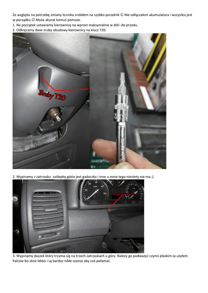 Ze względu na potrzebę zmiany licznika zrobiłem na szybko poradnik  Nie odłączałem akumulatora i wszystko jest w porządku  Może akurat komuś pomoże. 1. Na początek ustawiamy kierownicę na wprost maksymalnie w dół i do przodu. 2. Odkręcamy dwie śruby obudowy kierownicy na klucz T20. 2. Wypinamy z zatrzasku zaślepkę gdzie jest gadaczka i inne u mnie tego niestety nie ma ;) 3. Wypinamy daszek który trzyma się na trzech zatrzaskach u góry. Należy go podważyć czymś płaskim Ja użyłem Palców bo idzie lekko i są bardzo nikłe szanse aby coś połamać. 4. Wyciągamy daszek wraz z obudową kierownicy w stronę drzwi kierowcy mi akurat udało się wyciągnąć w całości jeśli jednak będzie problem to można wypiąć element skóropodobny. Trzyma się na 3 albo 4 zatrzaskach które należy ścisnąć i wyciągnąć. 5. Na dole licznika jest śruba T20 którą należy odkręcić. Po odkręceniu licznik trzyma się tylko na zawiasach u góry. Lekko podnosimy by był dołem do nas i mocniej ciągniemy najpierw z lewej strony. Przy prawej stronie można lekko go ciągnąć w stronę drzwi kierowcy. 6. Zostało odpięcie wtyczek ja obróciłem zegar i miałem lepszy dostęp. Teraz należy nowy licznik ( lub naprawiony jeśli taka była przyczyna ) zamontować w odwrotnej kolejności i gotowe ;) Mam nadzieję że komuś przyda się ten poradnik  Pozdrawiam rom3o