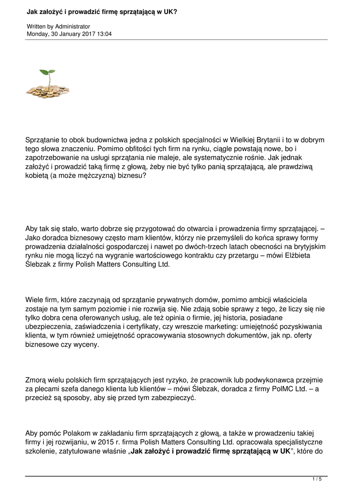Jak założyć i prowadzić firmę sprzątającą w UK? Written by Administrator Monday, 30 January 2017 13:04 Sprzątanie to obok budownictwa jedna z polskich specjalności w Wielkiej Brytanii i to w dobrym tego słowa znaczeniu. Pomimo obfitości tych firm na rynku, ciągle powstają nowe, bo i zapotrzebowanie na usługi sprzątania nie maleje, ale systematycznie rośnie. Jak jednak założyć i prowadzić taką firmę z głową, żeby nie być tylko panią sprzątającą, ale prawdziwą kobietą (a może mężczyzną) biznesu? Aby tak się stało, warto dobrze się przygotować do otwarcia i prowadzenia firmy sprzątającej. – Jako doradca biznesowy często mam klientów, którzy nie przemyśleli do końca sprawy formy prowadzenia działalności gospodarczej i nawet po dwóch-trzech latach obecności na brytyjskim rynku nie mogą liczyć na wygranie wartościowego kontraktu czy przetargu – mówi Elżbieta Ślebzak z firmy Polish Matters Consulting Ltd. Wiele firm, które zaczynają od sprzątanie prywatnych domów, pomimo ambicji właściciela zostaje na tym samym poziomie i nie rozwija się. Nie zdają sobie sprawy z tego, że liczy się nie tylko dobra cena oferowanych usług, ale też opinia o firmie, jej historia, posiadane ubezpieczenia, zaświadczenia i certyfikaty, czy wreszcie marketing: umiejętność pozyskiwania klienta, w tym również umiejętność opracowywania stosownych dokumentów, jak np. oferty biznesowe czy wyceny. Zmorą wielu polskich firm sprzątających jest ryzyko, że pracownik lub podwykonawca przejmie za plecami szefa danego klienta lub klientów – mówi Ślebzak, doradca z firmy PolMC Ltd. – a przecież są sposoby, aby się przed tym zabezpieczyć. Aby pomóc Polakom w zakładaniu firm sprzątających z głową, a także w prowadzeniu takiej firmy i jej rozwijaniu, w 2015 r. firma Polish Matters Consulting Ltd. opracowała specjalistyczne szkolenie, zatytułowane właśnie „Jak założyć i prowadzić firmę sprzątającą w UK”, które do 1/5 Jak założyć i prowadzić firmę sprzątającą w UK? Written by Administrator Monday, 30 January 2017 13:04 tej pory zorganizowała w czterech miastach Anglii: w Manchesterze 30 sierpnia 2015 r., w Nottingham 4 października 2015 r., w Londynie Watford dwa razy - 8 listopada 2015 r. i 17 stycznia 2016 r. oraz w Birmingham 5 grudnia 2015 r. W roku podatkowym 2016-2017 kurs odbędzie się w jeszcze tylko raz - w Manchesterze (M40 1LF), w sobotę 1 kwietnia 2017 r. w godz. 12.00 do 15.15. Pondato kurs dostępny jest w wersji indywidualnej przez Skype w cenie 132 funty (110.00 + VAT) i realizowany jest w dni robocze (od poniedziałku do piątku) w godzinach od 10.00 do 13.00 termin do ustalenia indywidualnie. Oto pełny program szkolenia „Jak założyć i prowadzić firmę sprzątającą w UK”: 1. Wybór formy działalności gospodarczej i rejestracja (sole trader, partnership czy spółka Ltd.) 2. Ubezpieczenia firmy sprzątającej: - obowiązkowe; - dobrowolne (ze szczególnym uwzględnieniem specyfiki firmy sprzątającej). 2/5 Jak założyć i prowadzić firmę sprzątającą w UK? Written by Administrator Monday, 30 January 2017 13:04 3. Certyfikaty przydatne przy pozyskiwaniu klientów: - kursy specjalistyczne; - zaświadczenie o niekaralności. 4. Zatrudnianie pracowników: - na umowę (w tym umowę „zero hours”); - jako podwykonawców; - jak się zabezpieczyć przed „podbieraniem” klientów przez pracowników i podwykonawców; - obowiązki pracodawcy. 5. Oferta firmy sprzątającej: - specjalizacja czy kompleksowość?; - czym konkurować z innymi firmami?; 3/5 Jak założyć i prowadzić firmę sprzątającą w UK? Written by Administrator Monday, 30 January 2017 13:04 - opracowanie cennika usług. - sporządzanie wyceny usługi dla klienta. 6. Pozyskiwanie klientów: - obecność w internecie; - poczta pantoflowa i „testimonials”; - tania i skuteczna reklama (oryginalne pomysły!) - sporządzanie oferty biznesowej dla firmy prywatnej. 7. Start w przetargach i konkursach ofert w sektorze publicznym: - gdzie i jak szukać informacji o przetargach i konkursach ofert; - najczęstsze wymogi przetargowe; - dokumentacja przetargowa i konkursowa. 4/5 Jak założyć i prowadzić firmę sprzątającą w UK? Written by Administrator Monday, 30 January 2017 13:04 Zainteresowanych kursem prosimy o zgłoszenie i podanie: 1. imienia i nazwiska uczestnika 2. miasta 3. numeru telefonu kontaktowego (komórkowego) 4. adresu e-mailowego Zgłoszenia przyjmowane są: - telefonicznie pod numerem stacjonarnym 01670 33 65 44 i od poniedziałku do piątku godzinach od 9.00 do 17.00 - SMS-em wysłanym na numer 077 235 445 62 - e-mailowo: [email protected] Zdjęcia z wcześniejszych kursów firmy Polish Matters Consulting Ltd. oraz opinie uczestników można znaleźć na Fanpage’u firmy na Facebooku – www.facebook.com/PolishMattersConsulti ngLtd 5/5