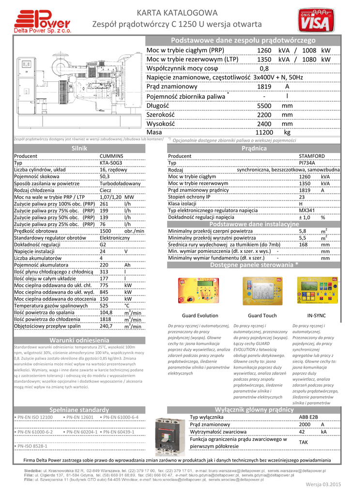 KARTA KATALOGOWA Zespół prądotwórczy C 1250 U wersja otwarta Podstawowe dane zespołu prądotwórczego Moc w trybie ciągłym (PRP) Moc w trybie rezerwowym (LTP) Współczynnik mocy cosϕ Napięcie znamionowe, częstotliwość Prąd znamionowy Pojemność zbiornika paliwa * Długość Szerokość Wysokość Masa Zespół prądotwórczy dostępny jest również w wersji zabudowanej /obudowa lub kontener/ *) Opcjonalnie dostępne zbiorniki paliwa o wiekszej pojemności Silnik Producent Typ Liczba cylindrów, układ Pojemność skokowa Sposób zasilania w powietrze Rodzaj chłodzenia Moc na wale w trybie PRP / LTP Zużycie paliwa przy 100% obc. (PRP) Zużycie paliwa przy 75% obc. (PRP) Zużycie paliwa przy 50% obc. (PRP) Zużycie paliwa przy 25% obc. (PRP) Prędkość obrotowa Standardowy regulator obrotów Dokładność regulacji Napięcie instalacji Liczba akumulatorów Pojemność akumulatora Ilość płynu chłodzącego z chłodnicą Ilość oleju w całym układzie Moc cieplna oddawana do ukł. chł. Moc cieplna oddawana do ukł. wyd. Moc cieplna oddawana do otoczenia Temperatura gazów spalinowych Ilość powietrza do spalania Ilość powietrza do chłodzenia Objętościowy przepływ spalin Prądnica CUMMINS KTA-50G3 16, rzędowy 50,3 Turbodoładowany Ciecz 1,07/1,20 MW 261 l/h 199 l/h 139 l/h 76 l/h 1500 obr./min Elektroniczny G2 24 V 4 220 Ah 313 l 177 l 775 kW 845 kW 150 kW 525 °C 104,8 m3/min 3 1818 m /min 3 240,7 m /min Warunki odniesienia Standardowe warunki odniesienia: temperatura 25°C, wysokość 100m npm, wilgotność 30%, ciśnienie atmosferyczne 100 kPa, współczynnik mocy 0,8. Zużycie paliwa zostało określone dla gęstości 0,85 kg/dm3. Zmiana warunków odniesienia może mieć wpływ na wartości prezentowanych wielkości. Wymiary, waga i inne dane zawarte w karcie technicznej podane są z zastrzeżeniem tolerancji i odnoszą się do modelu z wyposażeniem standardowym; wszelkie opcjonalne i dodatkowe wyposażenie / akcesoria mogą mieć wpływ na zmianę tych wartości. Spełniane standardy • PN-EN ISO 12100 • PN-EN 12601 • PN-EN 61000-6-2 • PN-EN 60204-1 • PN-EN 60439-1 • PN-ISO 8528-1 1260 kVA / 1008 kW 1350 kVA / 1080 kW 0,8 3x400V + N, 50Hz A 1819 l 5500 mm 2200 mm 2400 mm kg 11200 • PN-EN 61000-6-4 Producent STAMFORD Typ PI734A synchroniczna, bezszczotkowa, samowzbudna Rodzaj Moc w trybie ciągłym 1260 kVA Moc w trybie rezerwowym 1350 kVA Prąd znamionowy prądnicy 1819 A Stopień ochrony IP 23 Klasa izolacji H Typ elektronicznego regulatora napięcia MX341 Dokładność regulacji napięcia ± 1,0 % Podstawowe dane instalacyjne Minimalny przekrój czerpni powietrza Minimalny przekrój wyrzutni powietrza Średnica rury wydechowej za tłumikiem (do 7mb) Min. wymiar pomieszczenia (dł. x szer. x wys.) Minimalny wymiar fundamentu (dł. x szer.) - 5,8 5,5 168 m2 m2 mm mm mm Dostępne panele sterowania * Guard Evolution Do pracy ręcznej i automatycznej, przeznaczony do pracy pojedynczej (wyspa). Głowne cechy to: jasna komunikacja poprzez duży wyswietlacz, analiza zdarzeń podczas pracy zespołu prądotwórczego, śledzenie parametrów silnika i parametrów elektrycznych Guard Touch Do pracy ręcznej i automatycznej, przeznaczony do pracy pojedynczej (wyspa). Łączy cechy GUARD EVOLUTION z łatwością obsługi panelu dotykowego. Głowne cechy to: jasna komunikacja poprzez duży wyswietlacz, analiza zdarzeń podczas pracy zespołu prądotwórczego, śledzenie parametrów silnika i parametrów elektrycznych IN-SYNC Do pracy ręcznej i automatycznej. Przeznaczony do pracy pojedynczej, do pracy synchronicznej agregatów lub pracy z siecią. Głowne cechy to: jasna komunikacja poprzez duży wyswietlacz, analiza zdarzeń podczas pracy zespołu prądotwórczego, śledzenie parametrów silnika i parametrów Wyłącznik główny prądnicy Typ wyłącznika Prąd znamionowy Wytrzymałość zwarciowa Funkcja ograniczenia prądu zwarciowego w pierwszym półokresie ABB E2B 2000 A 42 kA TAK Firma Delta Power zastrzega sobie prawo do wprowadzania zmian zarówno w produktach jak i danych technicznych bez wcześniejszego powiadamiania Wersja 03.2015