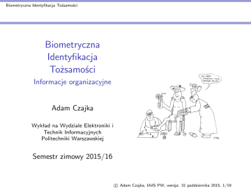 Biometryczna Identyfikacja Tożsamości Biometryczna Identyfikacja Tożsamości Informacje organizacyjne Adam Czajka Wykład na Wydziale Elektroniki i Technik Informacyjnych Politechniki Warszawskiej Semestr zimowy 2015/16 c Adam Czajka, IAiIS PW, wersja: 31 października 2015, 1/19 Biometryczna Identyfikacja Tożsamości Informacje organizacyjne Komunikacja Wykład Laboratorium Prowadzący Warunki zaliczenia Kodeks honorowy Zalecana literatura w języku polskim c Adam Czajka, IAiIS PW, wersja: 31 października 2015, 2/19 Biometryczna Identyfikacja Tożsamości Informacje organizacyjne Komunikacja Informacje organizacyjne Komunikacja Wykład Laboratorium Prowadzący Warunki zaliczenia Kodeks honorowy Zalecana literatura w języku polskim c Adam Czajka, IAiIS PW, wersja: 31 października 2015, 3/19 Biometryczna Identyfikacja Tożsamości Informacje organizacyjne Komunikacja 1. Strona przedmiotu: http://zbum.ia.pw.edu.pl (Dydaktyka – BIT) • • • • • Materiały do wykładu Materiały do laboratorium, w szczególności podział na grupy Tablica informacyjna Aktualny harmonogram zajęć (kalendarz Google) Kontakt do wszystkich prowadzących 2. Ogłoszenia drogą mailową (grupa BIT) 3. Konsultacje do wykładu: poniedziałki 12:00 – 12:30, pok. 558 4. Strona dla studentów WEiTI: http://studia.elka.pw.edu.pl • Oceny cząstkowe i końcowe • Przeglądanie wiadomości z listy mailowej c Adam Czajka, IAiIS PW, wersja: 31 października 2015, 4/19 Biometryczna Identyfikacja Tożsamości Informacje organizacyjne Wykład Informacje organizacyjne Komunikacja Wykład Laboratorium Prowadzący Warunki zaliczenia Kodeks honorowy Zalecana literatura w języku polskim c Adam Czajka, IAiIS PW, wersja: 31 października 2015, 5/19 Biometryczna Identyfikacja Tożsamości Informacje organizacyjne Wykład Tematyka W1. Biometria – znaczenie pojęcia W2. Biometria odcisku palca (2 spotkania) W3. Bezpieczeństwo sensorów odcisku palca (2 spotkania) W4. Biometria tęczówki (2 spotkania) W5. Bezpieczeństwo sensorów tęczówki W6. Biometria głosu W7. Bezpieczeństwo systemów biometrycznych W8. Biometria podpisu odręcznego W9. Biometria twarzy (2 spotkania) W10. Statystyczna ocena działania biometrii c Adam Czajka, IAiIS PW, wersja: 31 października 2015, 6/19 Biometryczna Identyfikacja Tożsamości Informacje organizacyjne Laboratorium Informacje organizacyjne Komunikacja Wykład Laboratorium Prowadzący Warunki zaliczenia Kodeks honorowy Zalecana literatura w języku polskim c Adam Czajka, IAiIS PW, wersja: 31 października 2015, 7/19 Biometryczna Identyfikacja Tożsamości Informacje organizacyjne Laboratorium Tematyka 1. Biometria odcisku palca 2. Testowanie żywotności palca 3. Biometria tęczówki 4. Testowanie żywotności oka 5. Biometria podpisu odręcznego c Adam Czajka, IAiIS PW, wersja: 31 października 2015, 8/19 Biometryczna Identyfikacja Tożsamości Informacje organizacyjne Laboratorium Organizacja zajęć 1. Pięć spotkań, każde po 3 godziny lekcyjne. Terminy: • wtorki (N i P): 0815 – 1045 oraz 1415 – 1645 • czwartki (N): 0815 – 1045 oraz 1115 – 1345 2. Grupy laboratoryjne • grupy maksymalnie dziesięcioosobowe • podział na grupy nastąpi po wypełnieniu skoroszytu z preferencjami • link dostępny na stronie przedmiotu (Dydaktyka – BIT – Materiały do laboratorium) • każdy typuje co najmniej jeden termin (1 – najlepszy, 2, 3, 4 – najmniej preferowany) • termin wypełnienia: 18 października 3. Planowany start: 27 października 4. Miejsce: Laboratorium Biometrii i Uczenia Maszynowego, sala 559 (V piętro, Instytut Automatyki i Inf. Stosowanej) c Adam Czajka, IAiIS PW, wersja: 31 października 2015, 9/19 Biometryczna Identyfikacja Tożsamości Informacje organizacyjne Prowadzący Informacje organizacyjne Komunikacja Wykład Laboratorium Prowadzący Warunki zaliczenia Kodeks honorowy Zalecana literatura w języku polskim c Adam Czajka, IAiIS PW, wersja: 31 października 2015, 10/19 Biometryczna Identyfikacja Tożsamości Informacje organizacyjne Prowadzący Adam Czajka Adiunkt Zespół Biometrii i Uczenia Maszynowego, IAiIS Wykład + laboratorium + prowadzenie przedmiotu Andrzej Pacut Profesor Kierownik Zespołu Biometrii i Uczenia Maszynowego, IAiIS Wykład c Adam Czajka, IAiIS PW, wersja: 31 października 2015, 11/19 Biometryczna Identyfikacja Tożsamości Informacje organizacyjne Prowadzący Joanna Panasiuk Doktorantka Zespół Biometrii i Uczenia Maszynowego, IAiIS Laboratorium Mateusz Trokielewicz Doktorant Zespół Biometrii i Uczenia Maszynowego, IAiIS Laboratorium Paweł Wawrzyński Adiunkt Zespół Biometrii i Uczenia Maszynowego, IAiIS Laboratorium c Adam Czajka, IAiIS PW, wersja: 31 października 2015, 12/19 Biometryczna Identyfikacja Tożsamości Informacje organizacyjne Warunki zaliczenia Informacje organizacyjne Komunikacja Wykład Laboratorium Prowadzący Warunki zaliczenia Kodeks honorowy Zalecana literatura w języku polskim c Adam Czajka, IAiIS PW, wersja: 31 października 2015, 13/19 Biometryczna Identyfikacja Tożsamości Informacje organizacyjne Warunki zaliczenia 1. Wykład • Egzamin pisemny (1 godz.) • Dopuszcza się korzystanie z jednej, własnoręcznie zapisanej kartki A4 • Na egzamin zabieramy dokument tożsamości (ze zdjęciem), nie zabieramy żadnych urządzeń elektronicznych (komórek, kalkulatorów, tabletów, itp.) • Ocena: 0 – 30 pkt. (min. 15 pkt.) • Proponowane terminy egzaminów: • • • • Termin I: 2 lutego (wtorek), godz. 0900 Termin II: 9 lutego (wtorek), godz. 0900 Termin poprawkowy: 12 lutego (piątek), godz. 0900 Termin zgłaszania kolizji z innymi egzaminami (dla większości osób w grupie): 25 stycznia (przedostatni wykład) • Ostateczne terminy egzaminów oraz numery sal zamieszczane będą w kalendarzu przedmiotu (Google) • Każdy może przystąpić do egzaminu we wszystkich terminach; liczy się najlepszy uzyskany wynik c Adam Czajka, IAiIS PW, wersja: 31 października 2015, 