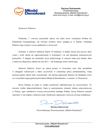 3.07.2009 List Gratulacyjny do nowych Posłów