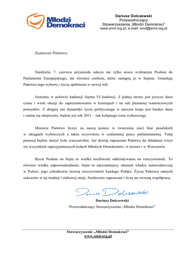 Dariusz Dolczewski Przewodniczący Stowarzyszenia „Młodzi Demokraci” www.smd.org.pl, e-mail: [email protected] Szanowni Państwo, Niedziela, 7. czerwca przyniosła sukces nie tylko nowo wybranym Posłom do Parlamentu Europejskiego, ale równieŜ osobom, które zastąpią je w Sejmie. Gratuluję Państwu tego wyboru i Ŝyczę spełnienia w nowej roli. Jesteśmy w połowie kadencji Sejmu VI kadencji. Z jednej strony jest jeszcze duŜo czasu i wiele okazji do zaprezentowania w komisjach i na sali plenarnej wartościowych pomysłów. Z drugiej zaś dynamika Ŝycia politycznego w naszym kraju jest bardzo duŜa i zanim się obejrzymy, będzie juŜ rok 2011 – rok kolejnego testu wyborczego. MoŜecie Państwo liczyć na naszą pomoc w tworzeniu sieci biur poselskich w okręgach wyborczych a takŜe oczywiście w codziennej pracy parlamentarnej. Tutaj pomocą będzie słuŜyć koło warszawskie. JuŜ dzisiaj zapraszam Państwa do składania wizyt we wszystkich zaprzyjaźnionych kołach Młodych Demokratów, w terenie i w Warszawie. Bycie Posłem na Sejm to wielka moŜliwość oddziaływania na rzeczywistość. To równieŜ wielka odpowiedzialność, Sejm to najwaŜniejszy element władzy ustawodawczej w Polsce, jego członkowie tworzą rzeczywistość kaŜdego Polaka. śyczę Państwu samych sukcesów w tej trudnej i ciekawej misji. Serdecznie zapraszam i liczę na owocną współpracę. Dariusz Dolczewski Przewodniczący Stowarzyszenia „Młodzi Demokraci” Stowarzyszenie „Młodzi Demokraci” www.smd.org.pl