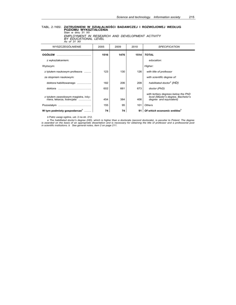 215 Science and technology. Information society TABL. 2 /165/. ZATRUDNIENI W DZIAŁALNOŚCI BADAWCZEJ I ROZWOJOWEJ WEDŁUG POZIOMU WYKSZTAŁCENIA Stan w dniu 31 XII EMPLOYMENT IN RESEARCH AND DEVELOPMENT ACTIVITY BY EDUCATIONAL LEVEL As of 31 XII WYSZCZEGÓLNIENIE 2005 OGÓŁEM ............................................ 2009 1516 2010 1476 SPECIFICATION 1514 TOTAL z wykształceniem: education: Wyższym: Higher: z tytułem naukowym profesora ......... 123 130 126 ze stopniem naukowym: with title of professor with scientific degree of: doktora habilitowanego .................. 182 206 208 habilitated doctora (HD) doktora .......................................... 602 661 673 doctor (PhD) z tytułem zawodowym magistra, inżyniera, lekarza, licencjata ................ 454 384 Pozostałym .......................................... 155 95 74 74 b W tym podmioty gospodarcze ......... 406 with tertiary degrees below the PhD level (Master’s degree, Bachelor’s degree and equivalent) 101 Others 91 Of which economic entities b b Patrz uwagi ogólne, ust. 2 na str. 212. a The habilitated doctor’s degree (HD), which is higher than a doctorate (second doctorate), is peculiar to Poland. The degree is awarded on the basis of an appropriate dissertation and is necessary for obtaining the title of professor and a professorial post in scientific institutions. b See general notes, item 2 on page 211.