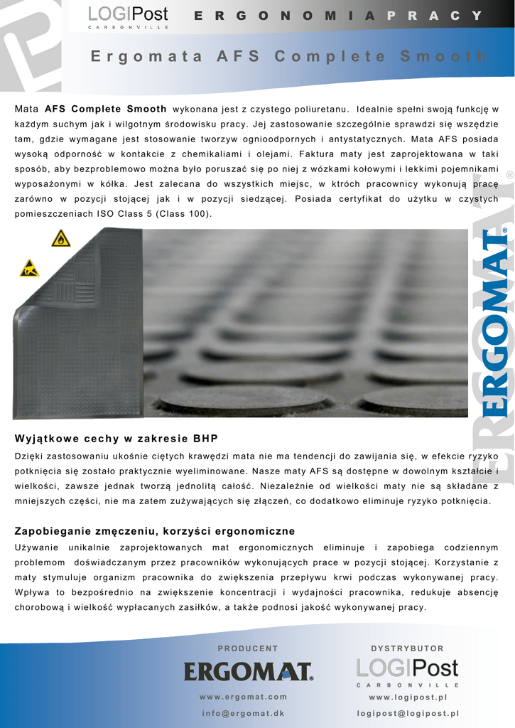 E R G O N O M I A Ergomata AFS P R A C Y Complete Smooth Mata AFS Complet e Smooth w yk o n an a j es t z c z ys t eg o p o l iur et a nu . I d ea l n ie s pełni s woją funk cję w k a żd ym s uc h ym j ak i wi l g ot n ym ś r o d o wis k u prac y. J ej zas t os o wa n i e s zc ze g ó ln i e s pra wd zi s i ę ws zę d zi e tam , g d zi e w ym a g an e j es t s tos o wa n ie t wor z yw o g ni o od p or n yc h i an t ys t a t yc zn yc h. M at a AF S p os i ad a w ys ok ą o d p orn oś ć w k on tak c i e z c hem ik a l iam i i o l ej am i . Fak t u ra m at y j es t za p r oj ek to wa n a w tak i s pos ó b, ab y b e zp r ob l e m owo m o żn a b ył o p or us zać s i ę po n iej z wó zk am i k oł o w ym i i l ek k im i p oj em nik am i w yp o s a żo n ym i w k ółk a. J es t za l ec a na do ws z ys tk ic h m iej s c , w k tróc h p rac o wn ic y w yk on uj ą prac ę za r ó wn o w p o z yc j i s toj ąc ej j ak i w po z y c j i s i e d ząc ej . P os i a d a c er t yf ik at d o u ż ytk u w c z ys t yc h pom i es zc ze n i ac h I SO Cl as s 5 ( C l as s 1 00) . W yjątkow e cechy w zakresie BHP D zi ęk i za s tos o wa n iu u k oś ni e c i ęt yc h k r a węd zi m at a n i e m a t e nd e n c j i d o za wi j an i a s i ę, w ef ek c i e r yz yk o po tk ni ęc i a s i ę zo s t a ło pr ak t yc zn i e w ye l im i no wa n e. N as ze m at y AF S s ą d os t ę pn e w d o wo l n ym k s zt a łc ie i wi e lk oś c i , za ws ze j e d nak t wo r zą j e d no l i tą c a łoś ć . N ie za l e żn i e o d wi e lk oś c i m at y n i e s ą s k ł ad a ne z m niej s z yc h c zę ś c i, n i e m a za tem zu ż ywa j ąc yc h s i ę zł ą c ze ń , c o d od atk o wo e l im in uj e r yz yk o p otk n ięc i a. Zapobieganie zmęczeniu, korzyści ergonomiczne U ż ywa n i e pro b l em om u nik a l n ie za pr oj ek to wa n yc h m at er g on om ic zn yc h e lim i nuj e i za p o b i eg a c od zi e n n ym doś wi a dc za n ym pr ze z pr ac o wn i k ów w yk o nuj ąc yc h pra c e w p o z yc j i s t oj ąc ej . K or z ys t a n i e z m at y s t ym ul uj e or ga n i zm pr ac o wn ik a d o z wi ęk s zen i a pr ze p ł ywu k rwi p o dc za s w yk o n ywa n ej pr ac y. W pł ywa t o b e zp oś r e d n io n a z wi ęk s ze ni e k onc e ntr ac j i i w yd a j n o ś c i pr ac o wn ik a, r ed u k uj e a bs enc j ę c hor o b o wą i wi elk oś ć w yp ł a c a n yc h za s i łk ó w, a t ak że po d nos i j ak oś ć w yk on ywa n ej pr ac y. PRODUCENT DYSTRYBUTOR www.ergomat.com www.logipost.pl [email protected] [email protected] Parametr y techniczne standardow ej maty ERGOMAT AFS Complete Smooth Materiał: piankowy poliuretan Kolor: antracyt Waga: 2 200 g +/- 50g Długość (bez ukośnie ciętych krawędzi): 91 cm +/- 1% Szerokość (bez krawędzi): 60 cm +/- 1% Grubość: 11 mm Właściwośći termiczne Właściwości ergonomiczne zostaną zachowane przy: Minimalnej temperaturze użytkowania: 0 °C Maksymalnej temperaturze użytkowania: 80 °C Maksymalna Wytrzymałość termiczna: 120 °C Odporność na ogień: Cfl-S1 (B) Gęstość: 390 kg/m³ Twardość: 15 - 22 Sh A Obciążenie zużycia średniego= 5 N: 540 mm³ Wytrzymałość na rozciąganie: 1.3 Mpa Wydłużenie przy zerwaniu: 230 % Wytzrzymałość na rozerwanie: 2.5 N / mm Opór elektryczny (po przyłożeniu do punktu powierzchni % 50 RH): 1 x 109 Ω - 5 x 109 Ω Podatna na promienie UV Odporna na hydrolizę Użytkowanie w pomieszczeniach czystych: ISO Class 5 (100) Solidnie w ykończona całości mat y zapobiega twor zeniu się wystr zępień i wypustków Produkt nie zaw iera silikonu ani lateksu / wykonany z naj wyższej klasy surowca Mata zaprojektowana i wykonana w specialnej technologii, zachow uje sw oje w łaściw ości , w szczególności właściwości sprężyste pr zez cały okres użytkowania (g warancji) Posiada w łaściw ości anty - statyczne Dostępne modele mat 5 LETNIA GWARANCJA W szystkie produkty firm y Ergomat podlegają warunkowej gwarancji jeśli tylko użytk owano je zgodnie z przeznaczeniem*, nawet przez 24 godziny na dobę, 7 dni w tygodniu. Gwarancja nie obejmuje zniszczeń mechanicznych spowodowanych przeciągnięciem przez matę lub jej obciążeniem zbyt dużym i ciężarami. Gwarancja nie ma zastosowania także w przypadku przeciągnięcia lub przejazdu przez matę wszelkiego rodzaju wózk ów paletowych, palet, skrzyń, wózków widłowych itp. Gwarancja dotycząca uszkodzeń wynik ając ych z reakcji maty na roztwory chemiczne, oleje, ciecze lub inne substancje aktywne ma różne zastosowanie, w zależności od rodzaju użytk owanej maty. W celu właściwego doboru maty dedyk owanej konkretnym warunkom należy skonsultować się z dystrybutorem lub osobą reprezentującą firmę Ergomat. Dopasowanie rodzaju maty zależy od charakterystyk i otoczenia w Państwa firmie oraz od spec yfiki miejsca, w którym mata będzie wykorzystywana. Okres gwaranc yjny rozpoczyna się z dniem nabycia produktu. Produkt podlegając y gwarancji w efekcie odpowiednio uzasadnionej i zatwierdzonej przez firmę Ergomat akcji gwaranc yjnej zostanie wymieniony na nowy. Gwarancja nie pokrywa kosztów bezpośrednich i pośrednich użytkownika a tak że nie zapewnia zwrotu pieniędzy. * Poprzez użytkowanie zgodne z przeznaczeniem rozumie się korzystanie z maty przez użytkownika pozostającego w pozycji stojącej, poruszanie się po niej w odpowiednim obuwiu pracowniczym, w otoczeniu, w którym temperatura powietrza nie przekracza 25 º C, a wilgotność powietrza 80%.