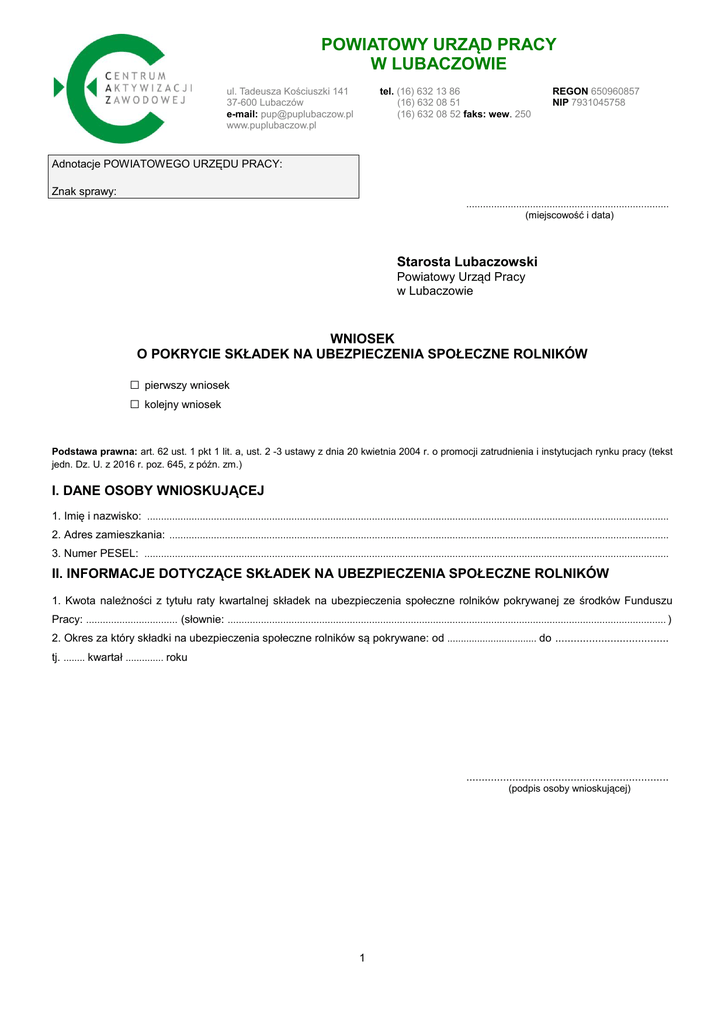 POWIATOWY URZĄD PRACY W LUBACZOWIE ul. Tadeusza Kościuszki 141 37-600 Lubaczów e-mail: [email protected] www.puplubaczow.pl tel. (16) 632 13 86 (16) 632 08 51 (16) 632 08 52 faks: wew. 250 REGON 650960857 NIP 7931045758 Adnotacje POWIATOWEGO URZĘDU PRACY: Znak sprawy: ......................................................................... (miejscowość i data) Starosta Lubaczowski Powiatowy Urząd Pracy w Lubaczowie WNIOSEK O POKRYCIE SKŁADEK NA UBEZPIECZENIA SPOŁECZNE ROLNIKÓW □ pierwszy wniosek □ kolejny wniosek Podstawa prawna: art. 62 ust. 1 pkt 1 lit. a, ust. 2 -3 ustawy z dnia 20 kwietnia 2004 r. o promocji zatrudnienia i instytucjach rynku pracy (tekst jedn. Dz. U. z 2016 r. poz. 645, z późn. zm.) I. DANE OSOBY WNIOSKUJĄCEJ 1. Imię i nazwisko: ............................................................................................................................................................................................ 2. Adres zamieszkania: .................................................................................................................................................................................... 3. Numer PESEL: ............................................................................................................................................................................................. II. INFORMACJE DOTYCZĄCE SKŁADEK NA UBEZPIECZENIA SPOŁECZNE ROLNIKÓW 1. Kwota należności z tytułu raty kwartalnej składek na ubezpieczenia społeczne rolników pokrywanej ze środków Funduszu Pracy: ................................. (słownie: .............................................................................................................................................................. ) 2. Okres za który składki na ubezpieczenia społeczne rolników są pokrywane: od ................................. do ..................................... tj. ........ kwartał .............. roku .................................................................. (podpis osoby wnioskującej) 1 Załączniki: 1. Świadectwo pracy potwierdzające, że osoba wnioskująca, w okresie 18 miesięcy poprzedzających dzień zgłoszenia niniejszego wniosku pozostawała w stosunku pracy lub stosunku służbowym i osiągała wynagrodzenie stanowiące podstawę wymiaru składek na ubezpieczenia społeczne i Fundusz Pracy, wynoszące co najmniej minimalne wynagrodzenie za pracę przez okres 365 dni, i stosunek ten został rozwiązany z przyczyn dotyczących zakładu pracy. 2. Decyzja o podleganiu ubezpieczeniu społecznemu rolników. 3. Decyzja w sprawie podatku rolnego. 4. Polecenie przelewu (blankiet wpłaty) kwoty należności z tytułu poszczególnych rat kwartalnych ubezpieczenia społecznego rolników. 5. Oświadczenie osoby wnioskującej w sprawie własności gospodarstwa rolnego powyżej 2 ha przeliczeniowych lub ilości członków gospodarstwa domowego niemających stałych pozarolniczych źródeł dochodu. (Oświadczenie składa osoba wnioskująca będąca właścicielem gospodarstwa rolnego o pow. 2 ha przeliczeniowych jednakże podlegająca ubezpieczeniu społecznemu rolników jako rolnik, którego gospodarstwo obejmuje obszar użytków rolnych poniżej 2 ha przeliczeniowych lub osoba wnioskująca posiadająca gospodarstwo rolne powyżej 5 ha przeliczeniowych). UWAGA! Do kolejnego wniosku o pokrycie składek na ubezpieczenia społeczne rolników, osoba wnioskująca zobowiązana jest dołączyć: 1. Załącznik Nr 4. 2. Oświadczenie o braku zaistnienia przesłanek mających wpływ na stan faktyczny od dnia złożenia pierwszego wniosku o pokrycie składek na ubezpieczenia społeczne rolników. Adnotacje POWIATOWEGO URZĘDU PRACY: Wniosek kompletny: □ TAK □ NIE .................................................................................................................. data i podpis pracownika weryfikującego wniosek 2 .................................................................. miejscowość i data ................................................................... imię i nazwisko .......................................................................... adres zamieszkania .......................................................................... Numer PESEL OŚWIADCZENIE Świadomy odpowiedzialności karnej za złożenie fałszywego oświadczenia (art. 233 Kodeksu karnego), oświadczam: I. □ dotyczy / □ nie dotyczy osoby wnioskującej * Jestem właścicielem gospodarstwa rolnego o powierzchni powyżej 2 ha przeliczeniowych tj. ......................, jednakże w związku z wydzierżawieniem części tego gospodarstwa, na podstawie przepisów ustawy z dnia 20 grudnia 1990 r. o ubezpieczeniu społecznym rolników (tekst jedn. Dz. U. z 2008 r, Nr 50, poz. 291, z późn. zm.) podlegam ubezpieczeniu społecznemu rolników na wniosek, jako rolnik, którego gospodarstwo obejmuje obszar użytków rolnych o powierzchni .......................1 1 Oświadczenie składa osoba wnioskująca będąca właścicielem gospodarstwa rolnego o pow. 2 ha przeliczeniowych jednakże podlegająca ubezpieczeniu społecznemu rolników jako rolnik, którego gospodarstwo obejmuje obszar użytków rolnych poniżej 2 ha przeliczeniowy II. □ dotyczy / □ nie dotyczy osoby wnioskującej * W skład mojego gospodarstwa domowego wraz ze mną wchodzi ............. członków niemających stałych pozarolniczych źródeł 2 dochodu. 2 Oświadczenie składa osoba wnioskująca posiadająca gospodarstwo rolne powyżej 5 ha przeliczeniowych. III. □ dotyczy / □ nie dotyczy osoby wnioskującej * Od dnia złożenia pierwszego wniosku o pokrycie składek na ubezpieczenia społeczne rolników □ nie zaistniały / □ zaistniały * jakiekolwiek przesłanki mające wpływ na zmianę stanu faktycznego udokumentowanego dokumentami 3 dołączonymi do pierwszego wniosku. 3 Oświadczenie składa wyłącznie osoba wnioskująca, która składa kolejny wnios