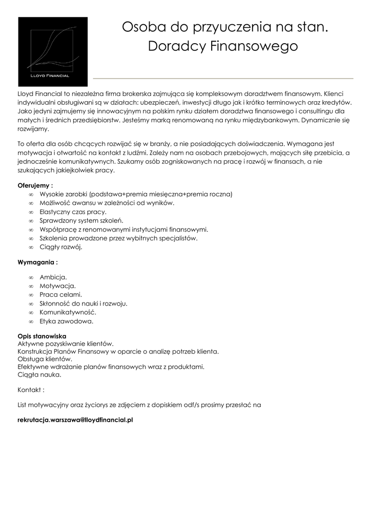 Osoba do przyuczenia na stan. Doradcy Finansowego Lloyd Financial to niezaleŜna firma brokerska zajmująca się kompleksowym doradztwem finansowym. Klienci indywidualni obsługiwani są w działach: ubezpieczeń, inwestycji długo jak i krótko terminowych oraz kredytów. Jako jedyni zajmujemy się innowacyjnym na polskim rynku działem doradztwa finansowego i consultingu dla małych i średnich przedsiębiorstw. Jesteśmy marką renomowaną na rynku międzybankowym. Dynamicznie się rozwijamy. To oferta dla osób chcących rozwijać się w branŜy, a nie posiadających doświadczenia. Wymagana jest motywacja i otwartość na kontakt z ludźmi. ZaleŜy nam na osobach przebojowych, mających siłę przebicia, a jednocześnie komunikatywnych. Szukamy osób zogniskowanych na pracę i rozwój w finansach, a nie szukających jakiejkolwiek pracy. Oferujemy : • Wysokie zarobki (podstawa+premia miesięczna+premia roczna) • MoŜliwość awansu w zaleŜności od wyników. • Elastyczny czas pracy. • Sprawdzony system szkoleń. • Współpracę z renomowanymi instytucjami finansowymi. • Szkolenia prowadzone przez wybitnych specjalistów. • Ciągły rozwój. Wymagania : • • • • • • Ambicja. Motywacja. Praca celami. Skłonność do nauki i rozwoju. Komunikatywność. Etyka zawodowa. Opis stanowiska Aktywne pozyskiwanie klientów. Konstrukcja Planów Finansowy w oparcie o analizę potrzeb klienta. Obsługa klientów. Efektywne wdraŜanie planów finansowych wraz z produktami. Ciągła nauka. Kontakt : List motywacyjny oraz Ŝyciorys ze zdjęciem z dopiskiem odf/s prosimy przesłać na [email protected]