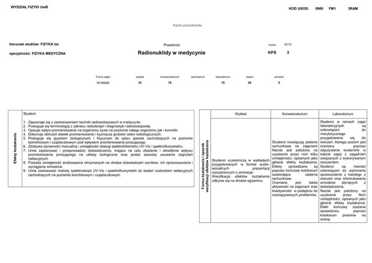 WYDZIAŁ FIZYKI UwB KOD USOS: 0900 FM1 3RAM Karta przedmiotu kierunek studiów: FIZYKA Ist. specjalność: FIZYKA MEDYCZNA Przedmiot moduł ECTS Radionuklidy w medycynie KPS 3 Formy zajęć wykład konwersatorium WYMIAR 15 15 seminarium 8. 9. Forma kształcenia i sposób weryfikacji efektów kształcenia Efekty kształcenia 6. 7. Zapoznaje się z zastosowaniem technik radioizotopowych w medycynie. Posługuje się terminologią z zakresu radioterapii i diagnostyki radioizotopowej. Opisuje wpływ promieniowania na organizmy żywe na poziomie całego organizmu jak i komórki. Dokonuje obliczeń dawek promieniowania i wyznacza grubość osłon radiologicznych. Posługuje się językiem biologicznym i fizycznym do opisu zjawisk zachodzących na poziomie komórkowym i cząsteczkowym pod wpływem promieniowania jonizującego. Zdobywa sprawność manualną i umiejętność obsługi spektrofotometru UV-Vis i spektrofluorymetru. Umie zaplanować i przeprowadzić doświadczenia, mające na celu zbadanie i określenie wpływu promieniowania jonizującego na układy biologiczne oraz podać sposoby usuwania zagrożeń radiacyjnych. Posiada umiejętność analizowania otrzymanych na drodze doświadczeń wyników, ich opracowywania i wyciągania wniosków. Umie zastosować metody spektroskopii UV-Vis i spektrofluorymetrii do badań uszkodzeń radiacyjnych zachodzących na poziomie komórkowym i cząsteczkowym. razem semestr 15 45 5 Wykład Student: 1. 2. 3. 4. 5. laboratorium Studenci uczestniczą w wykładach przygotowanych w formie audiowizualnych prezentacji rozszerzonych o animacje. Weryfikacja efektów kształcenia odbywa się na drodze egzaminu. Konwersatorium Studenci rozwiązują zadania rachunkowe na zajęciach Nacisk jest położony na uzyskanie przez nich kilku umiejętności, opisanych jako główne efekty kształcenia. Efekty sprawdzane są poprzez końcowe kolokwium zawierające zadania rachunkowe. Oceniana jest także aktywność na zajęciach oraz kreatywność w podejściu do rozwiązywanych problemów. Laboratorium Studenci w ramach zajęć laboratoryjnych są zobowiązani do merytorycznego przygotowania się do ćwiczeń, którego poziom jest oceniany poprzez odpytywanie studentów w trakcie zajęć z zagadnień związanych z wykonywanym ćwiczeniem. Studenci są również zobowiązani do wykonania sprawozdania z każdego z ćwiczeń oraz sformułowania wniosków płynących z doświadczenia. Nacisk jest położony na uzyskanie przez Nich umiejętności, opisanych jako główne efekty kształcenia. Efekt końcowy zostanie sprawdzony poprzez kolokwium pisemne na ocenę. TREŚCI KSZTAŁCENIA Wykład 1.Podstawy zastosowania techniki radioizotopowej w medycynie. Radioaktywne izotopy naturalne i sztuczne. Rodzaje rozpadów promieniotwórczych. Prawo rozpadu promieniotwórczego. Aktywność promieniotwórcza i jej jednostki. Metody otrzymania i charakterystyka izotopów promieniotwórczych stosowanych w medycynie. Radionuklidy i radiofarmaceutyki. Kryteria jakości radiofarmaceutyków. Detekcja promieniowania jonizującego: metody jonizacyjne, scyntylacyjne i autoradiografii. Toksykologia radionuklidów. 2.Diagnostyka radioizotopowa w medycynie in vitro. Oznaczenie ilości substancji metoda rozcieńczania izotopów, metody radioimmunologiczne, analiza aktywacyjna. 3.Diagnostyka radioizotopowa in vivo. Mechanizmy transportu i akumulacji radiofarmaceutyków w komórkach : aktywny transport, wtórny aktywny transport, dyfuzja, fagocytoza, antygen-przeciwcialo, ligandreceptor. Technika obrazowania: technika planarna, technika tomografii emisyjnej pojedynczego fotonu (SPECT), Pozytonowa tomografia emisyjna (PET). Charakterystyka RN stosowany w PET i SPECT. 4.Radioterapia. Podstawy radioterapii – oddziaływanie promieniowania jonizującego z materią. Biologiczne działanie promieniowania jonizującego. Uszkodzenia radiacyjne na różnych poziomach organizacji (komórki, tkanki, organy, cały organizm). Promienioczułość tkanek. PrawoBergonie-Tribondeau. Narządy krytyczne. Wczesne i późne efekty napromieniania. Efekty stochastyczne i deterministyczne. Radioliza wody. Bezpośrednie i pośrednie efekty promieniowania jonizującego. Utlenienie lipidów, białek, uszkodzenia kwasów nukleinowych. Efekt tlenowy. Cykl komórkowy i śmierć mitotyczna. Śmierć apoptyczna i nekrotyczna. 5. Dozymetria. Jednostki dozymetryczne. Dawki i moc dawki. 6. Techniki radioterapii: a) wiązki zewnętrzne – teleradioterapia b) źródła śródtkankowe – brachyterapii c) źródła otwarte (podanie radioizotopu) – terapia radioizotopowa. Charakterystyka RN stosowanych w różnych technikach radioterapii. Radioterapia konwencjonalna Radioterapia hadronowa Terapia protonowa. Terapia wychwytu neutronów (BNCT) Konwersatorium 1. Izotopy. Określanie pierwiastków powstających podczas rozpadu promieniotwórczego według reguły Soddy’ego-Fajansa. 2. Charakterystyka źródeł promieniotwórczych. Prawo rozpadu promieniotwórczego, aktywność, stała rozpadu, okres połowicznego rozpadu. 3. Wyznaczanie aktywności radionuklidów i aktywności właściwej substancji. 4.Oznaczenie ilości substancji metoda rozcieńczania izotopów. 5. Obliczanie dawek promieniowania: dawka pochłonięta, równoważnik dawki, dawka efektywna i ekspozycyjna. Moc dawki pochłoniętej. Dawki graniczne. Energia promieniowania. 6. Osłony przed promieniowaniem, wyznaczanie grubości osłon, krotność osłabienia. 7. Wyznaczanie promienia przestrzeni nadzorowanej, kontrolowanej oraz strefy awaryjnej. 8. Kolokwium. Laboratorium 1. Pomiar stężenia glutationu zredukowanego (GSH) w erytrocytach poddanych działaniu promieniowania γ. 2. Wyznaczanie stężenia methemoglobiny (MetHb) w erytrocytach poddanych działaniu promieniowania γ. 3. Wpływ promieniowania γ na stopień peroksydacji lipidów w błonie komórkowej erytrocytów. 4. Badanie wpływu promieniowania γ na proces utleniania lipidów liposomów metodą spektrofotometrycz