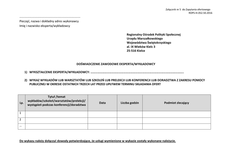 Załącznik nr 5 do Zapytania ofertowego ROPS-III.052.50.2016 ......................................................................... Pieczęć, nazwa i dokładny adres wykonawcy Imię i nazwisko eksperta/wykładowcy Regionalny Ośrodek Polityki Społecznej Urzędu Marszałkowskiego Województwa Świętokrzyskiego al. IX Wieków Kielc 3 25-516 Kielce DOŚWIADCZENIE ZAWODOWE EKSPERTA/WYKŁADOWCY 1) WYKSZTAŁCENIE EKSPERTA/WYKŁADOWCY: ……………………………………………………………………………………………………….. 2) WYKAZ WYKŁADÓW LUB WARSZTATÓW LUB SZKOLEŃ LUB PRELEKCJI LUB KONFERENCJI LUB DORADZTWA Z ZAKRESU POMOCY PUBLICZNEJ W OKRESIE OSTATNICH TRZECH LAT PRZED UPŁYWEM TERMINU SKŁADANIA OFERT Lp. Tytuł /temat wykładów/szkoleń/warsztatów/prelekcji/ wystąpień podczas konferencji/doradztwa Data Liczba godzin Podmiot zlecający 1 2 … Do wykazu należy dołączyć dowody potwierdzające, że usługi wymienione w wykazie zostały wykonane należycie. 3) WYKAZ PUBLIKACJI LUB RAPORTÓW Z BADAŃ LUB OPINII LUB EKSPERTYZ Z ZAKRESU POMOCY PUBLICZNEJ W OKRESIE OSTATNICH TRZECH LAT PRZED UPŁYWEM TERMINU SKŁADANIA OFERT Lp. Tytuł publikacji/raportu z badań/opinii/ekspertyzy Data Podmiot zlecający 1 2 ........................................... Miejscowość, data ................................................................ Podpis oferenta