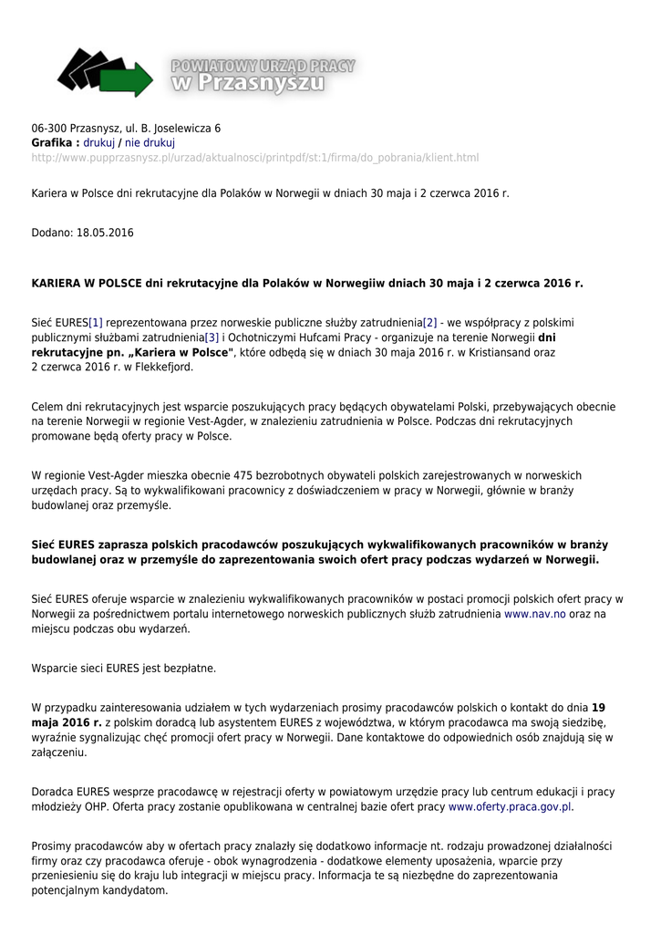 06-300 Przasnysz, ul. B. Joselewicza 6 Grafika : drukuj / nie drukuj http://www.pupprzasnysz.pl/urzad/aktualnosci/printpdf/st:1/firma/do_pobrania/klient.html Kariera w Polsce dni rekrutacyjne dla Polaków w Norwegii w dniach 30 maja i 2 czerwca 2016 r. Dodano: 18.05.2016 KARIERA W POLSCE dni rekrutacyjne dla Polaków w Norwegiiw dniach 30 maja i 2 czerwca 2016 r. Sieć EURES[1] reprezentowana przez norweskie publiczne służby zatrudnienia[2] - we współpracy z polskimi publicznymi służbami zatrudnienia[3] i Ochotniczymi Hufcami Pracy - organizuje na terenie Norwegii dni rekrutacyjne pn. „Kariera w Polsce", które odbędą się w dniach 30 maja 2016 r. w Kristiansand oraz 2 czerwca 2016 r. w Flekkefjord. Celem dni rekrutacyjnych jest wsparcie poszukujących pracy będących obywatelami Polski, przebywających obecnie na terenie Norwegii w regionie Vest-Agder, w znalezieniu zatrudnienia w Polsce. Podczas dni rekrutacyjnych promowane będą oferty pracy w Polsce. W regionie Vest-Agder mieszka obecnie 475 bezrobotnych obywateli polskich zarejestrowanych w norweskich urzędach pracy. Są to wykwalifikowani pracownicy z doświadczeniem w pracy w Norwegii, głównie w branży budowlanej oraz przemyśle. Sieć EURES zaprasza polskich pracodawców poszukujących wykwalifikowanych pracowników w branży budowlanej oraz w przemyśle do zaprezentowania swoich ofert pracy podczas wydarzeń w Norwegii. Sieć EURES oferuje wsparcie w znalezieniu wykwalifikowanych pracowników w postaci promocji polskich ofert pracy w Norwegii za pośrednictwem portalu internetowego norweskich publicznych służb zatrudnienia www.nav.no oraz na miejscu podczas obu wydarzeń. Wsparcie sieci EURES jest bezpłatne. W przypadku zainteresowania udziałem w tych wydarzeniach prosimy pracodawców polskich o kontakt do dnia 19 maja 2016 r. z polskim doradcą lub asystentem EURES z województwa, w którym pracodawca ma swoją siedzibę, wyraźnie sygnalizując chęć promocji ofert pracy w Norwegii. Dane kontaktowe do odpowiednich osób znajdują się w załączeniu. Doradca EURES wesprze pracodawcę w rejestracji oferty w powiatowym urzędzie pracy lub centrum edukacji i pracy młodzieży OHP. Oferta pracy zostanie opublikowana w centralnej bazie ofert pracy www.oferty.praca.gov.pl. Prosimy pracodawców aby w ofertach pracy znalazły się dodatkowo informacje nt. rodzaju prowadzonej działalności firmy oraz czy pracodawca oferuje - obok wynagrodzenia - dodatkowe elementy uposażenia, wparcie przy przeniesieniu się do kraju lub integracji w miejscu pracy. Informacja te są niezbędne do zaprezentowania potencjalnym kandydatom. Zapraszamy do udziału w wydarzeniach. [1] Sieć EURES (Europejskie Służby Zatrudnienia) to sieć współpracy Komisji Europejskiej, administracji publicznych na szczeblu centralnym, publicznych służb zatrudnienia oraz innych wyznaczonych podmiotów krajowych, regionalnych i lokalnych z państw członkowskich UE/EOG. [2] Norweskie publiczne służby zatrudnienia reprezentuje organizacja pod nazwą NAV (Arbeids- og Velferdsforvaltningen). [3] Polskie publiczne służby zatrudnienia reprezentuje Ministerstwo Rodziny, Pracy i Polityki Społecznej wojewódzkie i powiatowe urzędy pracy Zobacz wszystkie wiadomości