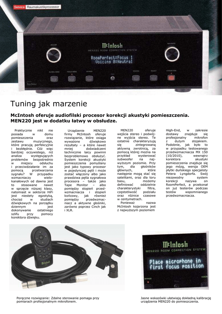 Tuning jak marzenie McIntosh oferuje audiofilski procesor korekcji akustyki pomieszczenia. MEN220 jest w dodatku łatwy w obsłudze. Praktycznie nikt nie posiada w domu pomieszczenia oraz zestawu muzycznego, które pracują perfekcyjnie i bezbłędnie. CóŜ więc bardziej oczywistego, niŜ analiza występujących problemów bezpośrednio w miejscu odsłuchu i przeciwdziałanie im za pomocą przetwarzania sygnału? W przypadku wzmacniaczy wielokanałowych od dawna jest to stosowane nawet w sprzęcie niŜszej klasy, natomiast w sektorze HiFi jest niestety egzotyką, chociaŜ w studiach dźwiękowych na porządku dziennym jest dokonywanie ostatniego szlifu przy pomocy korektora dźwięku. Urządzenie MEN220 firmy McIntosh oferuje rozwiązanie, które osiąga wywaŜone dźwiękowo rezultaty – a które nawet mniej doświadczeni technicznie laicy powinni bezproblemowo obsłuŜyć. System korekcji akustyki pomieszczenia pomyślany jest jako typowy procesor w pojedynczej pętli i moŜe zostać włączony albo jako prawdziwa pętla sygnałowa procesora – takŜe jako Tape Monitor – albo pomiędzy stopień przedwzmacniacza i stopień końcowy, jak równieŜ pomiędzy przedwzmacniacz a aktywne głośniki, zarówno poprzez Cinch jak i XLR. Poręczne rozwiązanie: Zdalne sterowanie pomaga przy pomiarach profesjonalnym mikrofonem. MEN220 oferuje wejścia stereo i podwójne wyjścia stereo. Te ostatnie charakteryzują się zintegrowaną aktywną zwrotnicą, za pomocą której moŜna na przykład wysterować subwoofer na najwyŜszym poziomie. Przy tym, dla głośników głównych, które następnie mogą stać się satelitami, oraz dla toru basu, moŜemy definiować oddzielnie charakterystyki filtra, częstotliwość podziału oraz róŜnice czasowe w centymetrach. PoniewaŜ nazwa McIntosh kojarzona jest z najwyŜszym poziomem High-End, w zakresie dostawy znajduje się profesjonalny mikrofon z duŜym stojakiem. Podobnie, jak było to w przypadku testowanego przedwzmacniacza MX 150 (10/2010), wewnątrz korektora akustyki pomieszczenia znajduje się jego mózg, wersja OEM płytki duńskiego specjalisty Petera Lyngdorfa. Swój niezawodny system korekcji nazywa on RoomPerfect, a przekonał on juŜ testerów podczas testów wspomnianego przedwzmacniacza. Jasne wskazówki ułatwiają dokładną kalibrację urządzenia MEN220 do pomieszczenia. Złącza Cyfrowo wpływać moŜna dziś na wiele rzeczy, największa sztuka polega jednak na tym, aby dokładnie zanalizować, które parametry i jak bardzo, albo – co właściwie jeszcze waŜniejsze – jak niewiele przykręcić. Geniusz tkwi nie tyle w samej korekcji, co w analizie akustyki. I wydaje się, Ŝe właśnie to opanował doskonale Peter Lyngdorf. Najpierw pozycjonuje się mikrofon w najuwaŜniejszym punkcie odsłuchowym. Po szeregu tonów pomiarowych, przypominających dźwięki burzy na organach, system Ŝąda pomiarów dalszych punktów pomieszczenia, potrzebnych do analizy. Powinno się przy tym oddalać mikrofon od punktu odsłuchowego we wszystkich trzech wymiarach, aby stopniowo określić istotne parametry pomieszczenia. Odbywa się to krok po kroku, zgodnie z krótkimi, jasnymi wskazówkami (w języku angielskim) na wyświetlaczu. Co kaŜdy pomiar RoomPerfect podaje informację o stanie analizy. Gniazda do zdalnego włączania oraz do integracji w systemy zdalnego sterowania. Wejścia Cinch lub XLR – moŜna je łatwo wybrać w menu. Tu podłącza się mikrofon. Do dyspozycji mamy ponad pięciometrowy przewód XLR. Podwójne wyjścia stereo moŜna wykorzystać w rozwiązaniach aktywnych oraz do podłączenia subwoofera. Teraz pojawiają się dwa tryby podstawowe, zoptymalizowany na strefie najlepszego odsłuchu (Focus) lub skorygowany miękko dla większej części pomieszczenia odsłuchowego (Global). MoŜna dokonać pomiaru większej ilości punktów strefy najlepszego odsłuchu. Na nie nakładane są profilowane tryby częstotliwości zwane „Voicing”. Zaprogramowanych jest siedem trybów Voicing od Neutral (liniowy) po Loudness (bas i tony wysokie). Przy pomocy programu komputerowego moŜna definiować własne tryby Voicing i wprowadzać je przez interfejs szeregowy. Podczas testów praktycznych okazało się, Ŝe dźwięk nie brzmiał jak korygowany cyfrowo. Przy aktywnym systemie RoomPerfect scena dźwiękowa była pełniejsza, lekkie niedoskonałości dźwięku podstawowego w pomieszczeniu odsłuchowym zaniknęły, a przy tym nie odnosiło się wraŜenia zagęszczenia dźwięku. Spadek dynamiki, stanowiący częsty problem prostych korektorów dźwięku, nie był zauwaŜalny. Przy bezpośrednim przełączaniu brakowało moŜe trochę przydechu, co jednak skompensowane zostało lekko przez równowagę i subtelność korygowanej sceny dźwiękowej. W kaŜdej chwili moŜna dodać dalsze punkty odsłuchowe (Focus) i ponownie je anulować. MEN220 nie lubi ostrych korekcji, nie ma tu wyrównywania charakterystyki za kaŜdą cenę. DuŜe problemy z pomieszczeniem odsłuchowym powinny zostać wstępnie rozwiązane akustycznie. Jeśli jednak mimo to trzeba dokonać korekcji braku równowagi, jak równieŜ dźwiękowych tendencji pomieszczenia odsłuchowego oraz systemu muzycznego, MEN220 jest w swoim Ŝywiole. Zawsze zdumiewające było, jak dyskretnie i subtelnie działał procesor. Dopiero po ponownym przełączeniu na bypass po długim odsłuchu zauwaŜało się, jak dobrze działa MEN220.