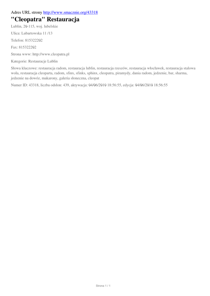 "Cleopatra" Restauracja, Lublin, Lubartowska 11 /13