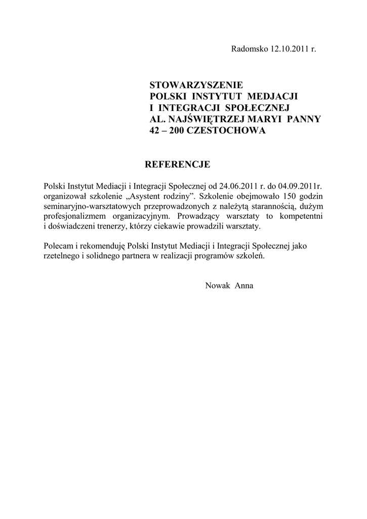 Radomsko 12.10.2011 r. STOWARZYSZENIE POLSKI INSTYTUT MEDJACJI I INTEGRACJI SPOŁECZNEJ AL. NAJŚWIĘTRZEJ MARYI PANNY 42 – 200 CZESTOCHOWA REFERENCJE Polski Instytut Mediacji i Integracji Społecznej od 24.06.2011 r. do 04.09.2011r. organizował szkolenie „Asystent rodziny”. Szkolenie obejmowało 150 godzin seminaryjno-warsztatowych przeprowadzonych z należytą starannością, dużym profesjonalizmem organizacyjnym. Prowadzący warsztaty to kompetentni i doświadczeni trenerzy, którzy ciekawie prowadzili warsztaty. Polecam i rekomenduję Polski Instytut Mediacji i Integracji Społecznej jako rzetelnego i solidnego partnera w realizacji programów szkoleń. Nowak Anna