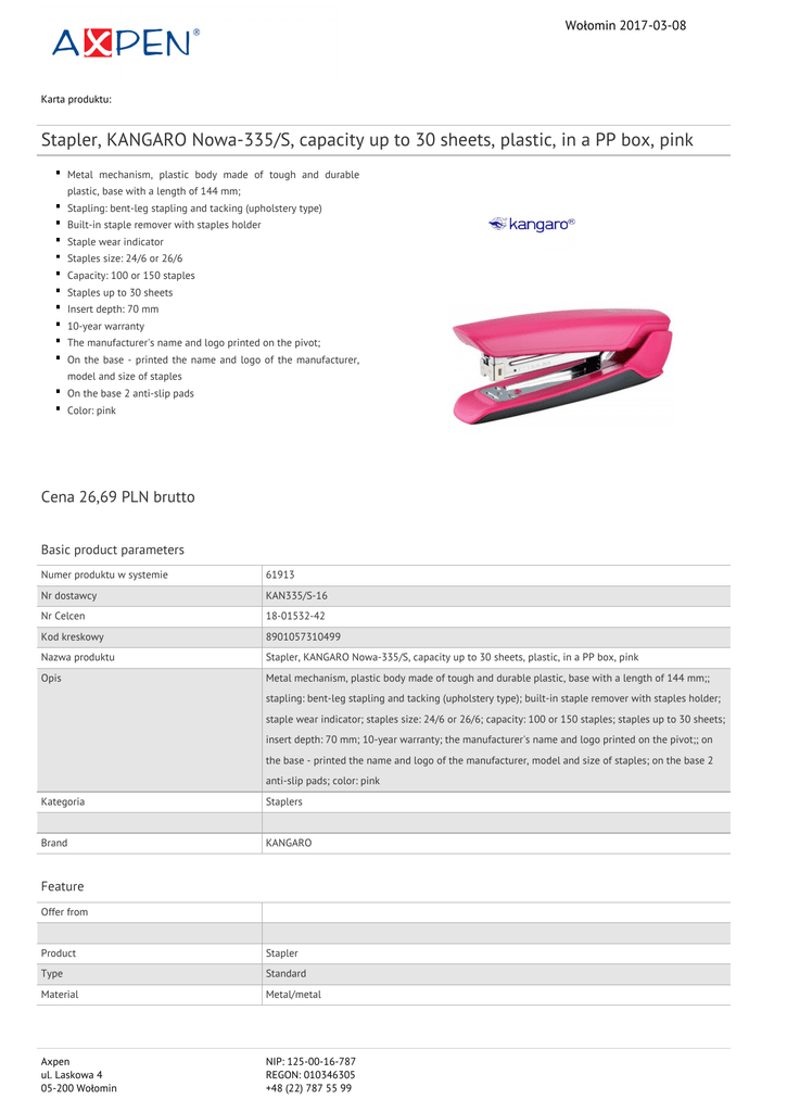 Wołomin 2017-03-08 Karta produktu: Stapler, KANGARO Nowa-335/S, capacity up to 30 sheets, plastic, in a PP box, pink Metal mechanism, plastic body made of tough and durable plastic, base with a length of 144 mm; Stapling: bent-leg stapling and tacking (upholstery type) Built-in staple remover with staples holder Staple wear indicator Staples size: 24/6 or 26/6 Capacity: 100 or 150 staples Staples up to 30 sheets Insert depth: 70 mm 10-year warranty The manufacturer's name and logo printed on the pivot; On the base - printed the name and logo of the manufacturer, model and size of staples On the base 2 anti-slip pads Color: pink Cena 26,69 PLN brutto Basic product parameters Numer produktu w systemie 61913 Nr dostawcy KAN335/S-16 Nr Celcen 18-01532-42 Kod kreskowy 8901057310499 Nazwa produktu Stapler, KANGARO Nowa-335/S, capacity up to 30 sheets, plastic, in a PP box, pink Opis Metal mechanism, plastic body made of tough and durable plastic, base with a length of 144 mm;; stapling: bent-leg stapling and tacking (upholstery type); built-in staple remover with staples holder; staple wear indicator; staples size: 24/6 or 26/6; capacity: 100 or 150 staples; staples up to 30 sheets; insert depth: 70 mm; 10-year warranty; the manufacturer's name and logo printed on the pivot;; on the base - printed the name and logo of the manufacturer, model and size of staples; on the base 2 anti-slip pads; color: pink Kategoria Staplers Brand KANGARO Feature Offer from Product Stapler Type Standard Material Metal/metal Axpen ul. Laskowa 4 05-200 Wołomin NIP: 125-00-16-787 REGON: 010346305 +48 (22) 787 55 99 Wołomin 2017-03-08 Karta katalogowa produktu cd. Stapler, KANGARO Nowa-335/S, capacity up to 30 sheets, plastic, in a PP box, pink Procurement vocabulary CPV 30197320-5 Zszywacze Certifications Warranty 10 Hit Standard New product New Dimensions Internal depth (mm) 70 Colour Colour Pink Pozostałe zdjęcia produktu Serdecznie zapraszamy do współpracy Axpen zespół. Axpen ul. Laskowa 4 05-200 Wołomin NIP: 125-00-16-787 REGON: 010346305 +48 (22) 787 55 99