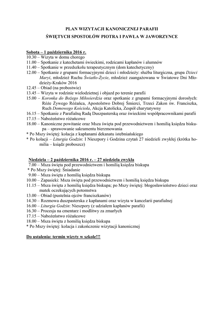 PLAN WIZYTACJI KANONICZNEJ PARAFII ŚWIĘTYCH SPOSTOŁÓW PIOTRA I PAWŁA W JAWORZYNCE Sobota – 1 października 2016 r. 10.30 – Wizyta w domu chorego 11.00 – Spotkanie z katechetami świeckimi, rodzicami kapłanów i alumnów 11.40 – Spotkanie w przedszkolu terapeutycznym (dom katechetyczny) 12.00 – Spotkanie z grupami formacyjnymi dzieci i młodzieży: służba liturgiczna, grupa Dzieci Maryi, młodzież Ruchu Światło-Życie, młodzież zaangażowana w Światowe Dni Młodzieży-Kraków 2016 12.45 – Obiad (na probostwie) 13.45 – Wizyta w rodzinie wielodzietnej i objazd po terenie parafii 15.00 – Koronka do Bożego Miłosierdzia oraz spotkanie z grupami formacyjnymi dorosłych: Róże Żywego Różańca, Apostolstwo Dobrej Śmierci, Trzeci Zakon św. Franciszka, Ruch Domowego Kościoła, Akcja Katolicka, Zespół charytatywny 16.15 – Spotkanie z Parafialną Radą Duszpasterską oraz świeckimi współpracownikami parafii 17.15 – Nabożeństwo różańcowe 18.00 – Kanoniczne powitanie oraz Msza święta pod przewodnictwem i homilią księdza biskupa – sprawowanie sakramentu bierzmowania * Po Mszy świętej: kolacja z kapłanami dekanatu istebniańskiego * Po kolacji – Liturgia Godzin: I Nieszpory i Godzina czytań 27 niedzieli zwykłej (krótka homilia – ksiądz proboszcz) Niedziela – 2 października 2016 r. – 27 niedziela zwykła 7.00 – Msza święta pod przewodnictwem i homilią księdza biskupa * Po Mszy świętej: Śniadanie 9.00 – Msza święta z homilią księdza biskupa 10.00 – Zapasieki: Msza święta pod przewodnictwem i homilią księdza biskupa 11.15 – Msza święta z homilią księdza biskupa; po Mszy świętej: błogosławieństwo dzieci oraz matek oczekujących potomstwa 13.00 – Obiad (pustelnia ojców franciszkanów) 14.30 – Rozmowa duszpasterska z kapłanami oraz wizyta w kancelarii parafialnej 16.00 – Liturgia Godzin: Nieszpory (z udziałem kapłanów parafii) 16.30 – Procesja na cmentarz i modlitwy za zmarłych 17.15 – Nabożeństwo różańcowe 18.00 – Msza święta z homilią księdza biskupa * Po Mszy świętej: kolacja i zakończenie wizytacji kanonicznej Do ustalenia: termin wizyty w szkole!!!