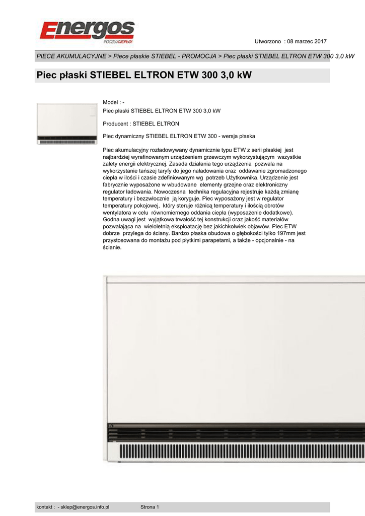 Utworzono : 08 marzec 2017 PIECE AKUMULACYJNE > Piece płaskie STIEBEL - PROMOCJA > Piec płaski STIEBEL ELTRON ETW 300 3,0 kW Piec płaski STIEBEL ELTRON ETW 300 3,0 kW Model : Piec płaski STIEBEL ELTRON ETW 300 3,0 kW Producent : STIEBEL ELTRON Piec dynamiczny STIEBEL ELTRON ETW 300 - wersja płaska Piec akumulacyjny rozładowywany dynamicznie typu ETW z serii płaskiej jest najbardziej wyrafinowanym urządzeniem grzewczym wykorzystującym wszystkie zalety energii elektrycznej. Zasada działania tego urządzenia pozwala na wykorzystanie tańszej taryfy do jego naładowania oraz oddawanie zgromadzonego ciepła w ilości i czasie zdefiniowanym wg potrzeb Użytkownika. Urządzenie jest fabrycznie wyposażone w wbudowane elementy grzejne oraz elektroniczny regulator ładowania. Nowoczesna technika regulacyjna rejestruje każdą zmianę temperatury i bezzwłocznie ją koryguje. Piec wyposażony jest w regulator temperatury pokojowej, który steruje różnicą temperatury i ilością obrotów wentylatora w celu równomiernego oddania ciepła (wyposażenie dodatkowe). Godna uwagi jest wyjątkowa trwałość tej konstrukcji oraz jakość materiałów pozwalająca na wieloletnią eksploatację bez jakichkolwiek objawów. Piec ETW dobrze przylega do ściany. Bardzo płaska obudowa o głębokości tylko 197mm jest przystosowana do montażu pod płytkimi parapetami, a także - opcjonalnie - na ścianie. kontakt : - [email protected] Strona 1 Utworzono : 08 marzec 2017 PIECE AKUMULACYJNE > Piece płaskie STIEBEL - PROMOCJA > Piec płaski STIEBEL ELTRON ETW 300 3,0 kW Piec płaski STIEBEL ELTRON ETW 300 3,0 kW ETW to piec z wbudowanymi elementami grzejnymi i elektronicznym regulatorem ładowania. ETW to seria płaska, z dynamicznym rozładowaniem (dmuchawa). Wyposażony w wielowarstwową, izolacyjnę - thermosolid. Specjalny rdzeń pieca akumulacyjnego. Rurkowe elementy grzejne z odpornej na wysoką temperaturę stali szlachetnej, z przyłączami wtykowymi. Optyczny wskaźnik usterki (LED) informujący o uszkodzeniu lub nie podłączeniu czujnika rdzenia lub regulatora ładowania. Bardzo cicho pracująca dmuchawa. Rozładowanie poprzez montowany na ścianie bądź wbudowany w piec regulator temperatury pomieszczenia. Urządzenie emaliowane na kolor biały. Główne atuty: � Seria płaska ma zastosowanie pod płytkimi parapetami � W typoszeregu aż 7 modeli pieca o zróżnicowanych mocach kontakt : - [email protected] Strona 2 Utworzono : 08 marzec 2017 PIECE AKUMULACYJNE > Piece płaskie STIEBEL - PROMOCJA > Piec płaski STIEBEL ELTRON ETW 300 3,0 kW Piec płaski STIEBEL ELTRON ETW 300 3,0 kW � Zwiększone bezpieczeństwo użytkowania dzięki zastosowaniu ogranicznika temperatury bezpieczeństwa wymagającego odblokowania � Uniwersalny regulator ładowania (prąd stały / prąd zmienny) � Możliwość przestawiania systemu sterowania prądem zmiennym � Bardzo cicho pracująca dmuchawa � Efektywna izolacja "thermosolid" oparta na absolutnie nieszkodliwych surowcach mineralnych � Filtr przeciwkurzowy � Fabrycznie zamontowane i okablowane elementy grzejne (grzałki) � Optyczny wskaźnik usterki (LED) Moc: 3,0 kW Wymiary: wys. x szer. x gł. [mm]� 546 x 1061 x 197 Waga: 169 kg Kolor: obudowa biel , kratka wylotu powietrza brąz metalik Dobierz sterownik temperatury Masz wątpliwości? Chcesz wiedzieć więcej? Czekamy na Twoje pytania. Napisz lub zadzwoń. kontakt : - [email protected] Strona 3 Utworzono : 08 marzec 2017 PIECE AKUMULACYJNE > Piece płaskie STIEBEL - PROMOCJA > Piec płaski STIEBEL ELTRON ETW 300 3,0 kW Piec płaski STIEBEL ELTRON ETW 300 3,0 kW kontakt : - [email protected] Strona 4 Utworzono : 08 marzec 2017 PIECE AKUMULACYJNE > Piece płaskie STIEBEL - PROMOCJA > Piec płaski STIEBEL ELTRON ETW 300 3,0 kW Piec płaski STIEBEL ELTRON ETW 300 3,0 kW Cena : 4.145,10 zł Brutto ( 3.370,00 zł Netto) Cena promocyjna : 3.150,00 zł Brutto ( 2.560,98 zł Netto) kontakt : - [email protected] Strona 5 Utworzono : 08 marzec 2017 PIECE AKUMULACYJNE > Piece płaskie STIEBEL - PROMOCJA > Piec płaski STIEBEL ELTRON ETW 300 3,0 kW Piec płaski STIEBEL ELTRON ETW 300 3,0 kW Dostępność: Produkt dostępny w naszym sklepie od 07 wrzesień 2014 kontakt : - [email protected] Strona 6