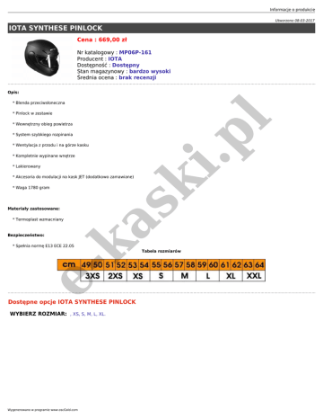 Informacje o produkcie Utworzono 08-03-2017 IOTA SYNTHESE PINLOCK Cena : 669,00 zł Nr katalogowy : MP06P-161 Producent : IOTA Dostępność : Dostępny Stan magazynowy : bardzo wysoki Średnia ocena : brak recenzji Opis: * Blenda przeciwsłoneczna l * Pinlock w zestawie i.p * Wewnętrzny obieg powietrza * System szybkiego rozpinania * Wentylacja z przodu i na górze kasku * Kompletnie wypinane wnętrze * Lakierowany * Waga 1780 gram Materiały zastosowane: Bezpieczeństwo: ka * Termoplast wzmacniany sk * Akcesoria do modulacji na kask JET (dodatkowo zamawiane) * Spełnia normę E13 ECE 22.05 e- Tabela rozmiarów Dostępne opcje IOTA SYNTHESE PINLOCK WYBIERZ ROZMIAR: , XS, S, M, L, XL. Wygenerowano w programie www.oscGold.com