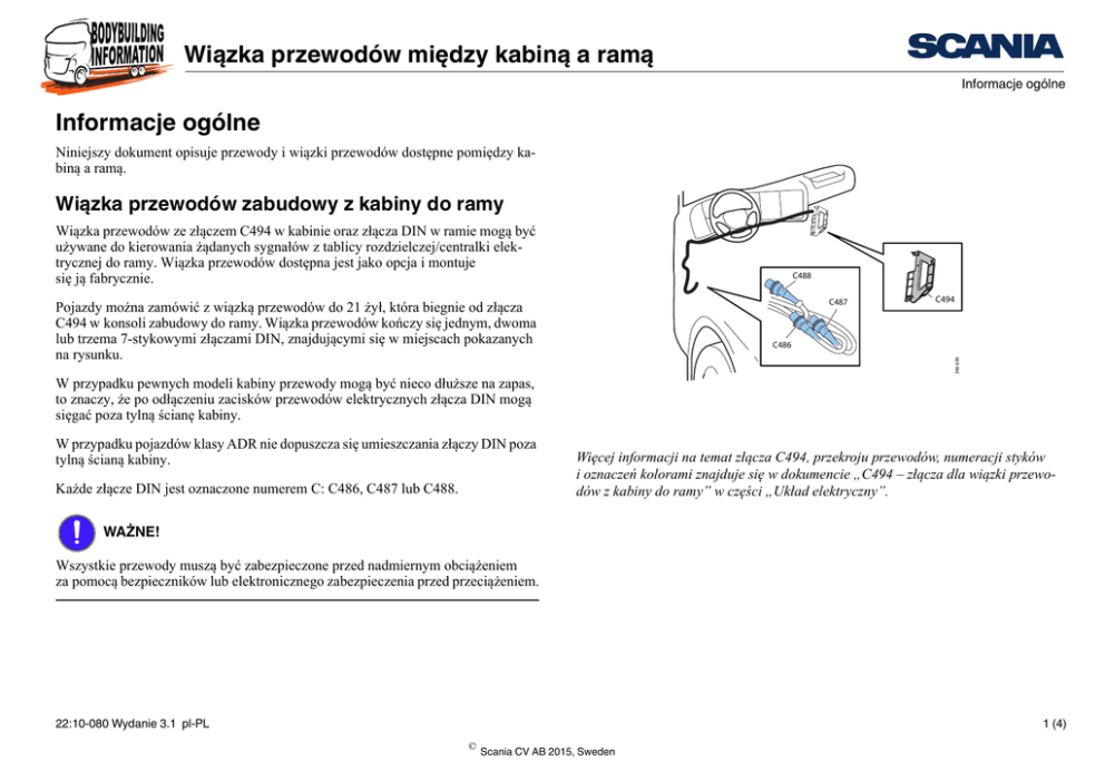 Wiązka przewodów między kabiną a ramą Informacje ogólne Informacje ogólne Niniejszy dokument opisuje przewody i wiązki przewodów dostępne pomiędzy kabiną a ramą. Wiązka przewodów zabudowy z kabiny do ramy Wiązka przewodów ze złączem C494 w kabinie oraz złącza DIN w ramie mogą być używane do kierowania żądanych sygnałów z tablicy rozdzielczej/centralki elektrycznej do ramy. Wiązka przewodów dostępna jest jako opcja i montuje się ją fabrycznie. C488 C487 Pojazdy można zamówić z wiązką przewodów do 21 żył, która biegnie od złącza C494 w konsoli zabudowy do ramy. Wiązka przewodów kończy się jednym, dwoma lub trzema 7-stykowymi złączami DIN, znajdującymi się w miejscach pokazanych na rysunku. C494 346 696 C486 W przypadku pewnych modeli kabiny przewody mogą być nieco dłuższe na zapas, to znaczy, że po odłączeniu zacisków przewodów elektrycznych złącza DIN mogą sięgać poza tylną ścianę kabiny. W przypadku pojazdów klasy ADR nie dopuszcza się umieszczania złączy DIN poza tylną ścianą kabiny. Każde złącze DIN jest oznaczone numerem C: C486, C487 lub C488. Więcej informacji na temat złącza C494, przekroju przewodów, numeracji styków i oznaczeń kolorami znajduje się w dokumencie „C494 – złącza dla wiązki przewodów z kabiny do ramy” w części „Układ elektryczny”. WAŻNE! Wszystkie przewody muszą być zabezpieczone przed nadmiernym obciążeniem za pomocą bezpieczników lub elektronicznego zabezpieczenia przed przeciążeniem. 22:10-080 Wydanie 3.1 pl-PL 1 (4) © Scania CV AB 2015, Sweden Wiązka przewodów między kabiną a ramą Informacje ogólne Przykład podłączenia zasilania +24 V i podłączenia do masy +24 V Przykład połączenia z kabiny do ramy. +24 V (pozycja 1), połączenie masowe (pozycja 2). 1 17 2 Informacje dotyczące części oraz miejsc wykonywania połączeń 3 Mont. przez producenta nadwozia Mont. przez producenta nadwozia C259 3 Włącznik 4 Przewód elektryczny 5 6 7 8 Mont. przez producenta nadwozia Przekrój poprzeczny przewodu minimum 0,75 mm² Mont. przez producenta nadwozia Urządzenie zabudowy Montowane fabrycznie Dalsze połączenie wybranej funk- Mont. przez producenta nadwozia cji Urządzenie zabudowy Montowane fabrycznie Wiązka przewodów zabudowy z Przekrój przewodu 1,5–2,5 mm² kabiny do ramy Dostarczana fabrycznie 22:10-080 Wydanie 3.1 pl-PL 42 C259 5 C494 1 - 10 11 - 16 6 C494 27 8 C486 C487 344 956 1 +24 V i bezpiecznik 2 Połączenie do masy C488 2 (4) © Scania CV AB 2015, Sweden Wiązka przewodów między kabiną a ramą Informacje ogólne Wiązka przewodów nadwozia w ramie wraz ze skrzynką połączeniową Przedłużacze dla podłączenia do złączy DIN C486, C487 i C488 w ramie są dostępne jako opcja dla wszystkich pojazdów. Posiadają one specyfikację ADR, są dostępne w wersjach o długości 2, 8 i 12 m oraz nie są zakończone złączami. Wiązka przewodów ma takie samo oznaczenie, kolory i przekroje poprzeczne żył jak wiązki przewodów zabudowy z kabiny do ramy, a jej zakończenia nie mają obudowy końcówki przewodu. Więcej informacji na temat złącza C494, przekroju przewodów, numeracji styków i oznaczeń kolorami znajduje się w dokumencie „C494 – złącza dla wiązki przewodów z kabiny do ramy” w części „Układ elektryczny”. W celu zapewnienia prawidłowej konfiguracji styków dla złączy, końcówki przewodów oznaczono. Skrzynka połączeniowa zaklasyfikowana do ADR jest również dostarczana wówczas, gdy pojazd jest zamówiony z przedłużającą wiązką przewodów. WAŻNE! • Przewody do i ze skrzynki przyłączeniowej muszą być także przystosowane dla pojazdów ADR. • Jako punkt podłączenia należy wykorzystywać wyłącznie podłączenie masowe w skrzynce przyłączeniowej (płyta masowa w śrubie mocującej). Wiązka przewodów i skrzynka połączeniowa są dostarczone w kabinie i nie są podłączone. Jeśli kabina jest wyposażona w leżankę, wiązki przewodów poprowadzone są pod nią. W innym przypadku znajdują się z przodu fotela pasażera. 22:10-080 Wydanie 3.1 pl-PL 3 (4) © Scania CV AB 2015, Sweden Wiązka przewodów między kabiną a ramą Warunki dla podwozia Warunki dla podwozia Data produkcji pojazdu Miejsce produkcji Södertälje Zwolle Angers São Bernardo do Campo Numer seryjny podwozia 2014-11-17 2105883 5371386 9192404 2015-02-02 3872427 - Przygotowanie fabryczne Opcja Alternatywa Wiązka przewodów zabudowy z kabiny do ramy 7-stykowa 7+7-stykowa 7+7+7-stykowa Wiązka przewodów zabudowy w ramie 2m 8m 12 m 22:10-080 Wydanie 3.1 pl-PL Kod wersji 2411B 2411E 2411F 3023A 3023D 3023C 4 (4) © Scania CV AB 2015, Sweden