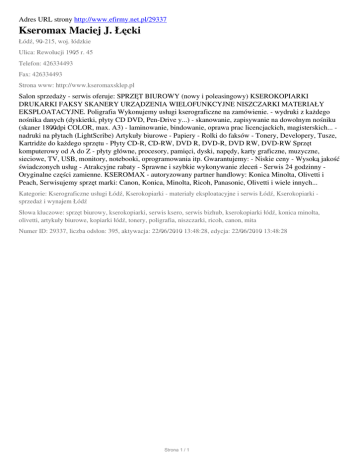 Adres URL strony http://www.efirmy.net.pl/29337 Kseromax Maciej J. Łęcki Łódź, 90-215, woj. łódzkie Ulica: Rewolucji 1905 r. 45 Telefon: 426334493 Fax: 426334493 Strona www: http://www.kseromaxsklep.pl Salon sprzedaży - serwis oferuje: SPRZĘT BIUROWY (nowy i poleasingowy) KSEROKOPIARKI DRUKARKI FAKSY SKANERY URZĄDZENIA WIELOFUNKCYJNE NISZCZARKI MATERIAŁY EKSPLOATACYJNE. Poligrafia Wykonujemy usługi kserograficzne na zamówienie. - wydruki z każdego nośnika danych (dyskietki, płyty CD DVD, Pen-Drive y...) - skanowanie, zapisywanie na dowolnym nośniku (skaner 1800dpi COLOR, max. A3) - laminowanie, bindowanie, oprawa prac licencjackich, magisterskich... nadruki na płytach (LightScribe) Artykuły biurowe - Papiery - Rolki do faksów - Tonery, Developery, Tusze, Kartridże do każdego sprzętu - Płyty CD-R, CD-RW, DVD R, DVD-R, DVD RW, DVD-RW Sprzęt komputerowy od A do Z - płyty główne, procesory, pamięci, dyski, napędy, karty graficzne, muzyczne, sieciowe, TV, USB, monitory, notebooki, oprogramowania itp. Gwarantujemy: - Niskie ceny - Wysoką jakość świadczonych usług - Atrakcyjne rabaty - Sprawne i szybkie wykonywanie zleceń - Serwis 24 godzinny Oryginalne części zamienne. KSEROMAX - autoryzowany partner handlowy: Konica Minolta, Olivetti i Peach, Serwisujemy sprzęt marki: Canon, Konica, Minolta, Ricoh, Panasonic, Olivetti i wiele innych... Kategorie: Kserograficzne usługi Łódź, Kserokopiarki - materiały eksploatacyjne i serwis Łódź, Kserokopiarki sprzedaż i wynajem Łódź Słowa kluczowe: sprzęt biurowy, kserokopiarki, serwis ksero, serwis bizhub, kserokopiarki łódź, konica minolta, olivetti, artykuły biurowe, kopiarki łódź, tonery, poligrafia, niszczarki, ricoh, canon, mita Numer ID: 29337, liczba odsłon: 395, aktywacja: 22/06/2010 13:48:28, edycja: 22/06/2010 13:48:28 Strona 1 / 1