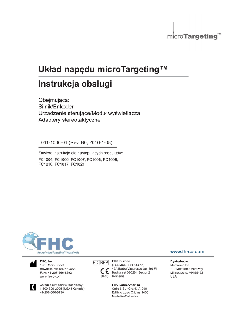 Układ napędu microTargeting™ Instrukcja obsługi Obejmująca: Silnik/Enkoder Urządzenie sterujące/Moduł wyświetlacza Adaptery stereotaktyczne L011-1006-01 (Rev. B0, 2016-1-08) Zawiera instrukcje dla następujących produktów: FC1004, FC1006, FC1007, FC1008, FC1009, FC1010, FC1017, FC1021 www.fh-co.com FHC, Inc. 1201 Main Street Bowdoin, ME 04287 USA Faks +1-207-666-8292 www.fh-co.com Całodobowy serwis techniczny: 1-800-326-2905 (USA i Kanada) +1-207-666-8190 FHC Europe (TERMOBIT PROD srl) 42A Barbu Vacarescu Str, 3rd Fl Bucharest 020281 Sector 2 Romania FHC Latin America Calle 6 Sur Cra 43 A-200 Edifi cio Lugo Oficina 1406 L011-1007-02 (Rev C0, 2016-1-21) Medellín-Colombia Dystrybutor: Medtronic Inc 710 Medtronic Parkway Minneapolis, MN 55432 USA 1 2 Instrukcja obsługi układu napędu microTargeting™ Spis treści Ostrzeżenia i środki ostrożności, symbole Przechowywanie, czyszczenie Sterylizacja Konserwacja i kalibracja Montaż i kontrola Osprzęt silnika/enkodera: Sterylne obłożenie Osprzęt silnika/enkodera: Montaż obłożonego urządzenia Osprzęt silnika/enkodera: Urządzenie sterujące/Moduł wyświetlacza Montaż układu napędu na systemie stereotaktycznym Przygotowanie 40-centymetrowego doprowadzenia sygnału do implantacji Elementy układu napędu microTargeting™ Konfi guracje ramy do pojedynczej elektrody i wiązki elektrod Procedura instalacji rurki wprowadzającej pojedynczą elektrodę Procedura instalacji rurki wprowadzającej wiązkę elektrod Adaptery do ramy Adapter Radionics CRW™ Adapter do systemu stereotaktycznego Leksell (Leksell Stereotactic System® Adapter) Adapter wyrównujący Radionics (Radionics Offsetting Adapter) Adapter wyrównujący Leksell (Leksell Offsetting Adapter) Adapter Leibinger RM™ Adapter Leibinger ZD™ Adapter BrainLAB®/Micromar NeuroMate Adapter Laitinen Stereoguide™ Adapter Gwarancja i serwis, Utylizacja na koniec cyklu życia produktu L011-1006-01 (Rev. B0, 2016-1-08) 4 5 6 7 7-10 11-12 13-14 14-15 16 17-18 19 20 21-27 28-35 36-44 36 37 38 39 40 41 42 43 44 45 3 Układ napędu microTargeting™, Akcesoria i adaptery stereotaktyczne Wskazania do stosowania: Układ napędu microTargeting™ przeznaczony jest do stosowania z dostępnymi na rynku systemami stereotaktycznymi w zabiegach neurochirurgicznych, które wymagają dokładnego umieszczenia mikroelektrod, elektrod stymulujących oraz innych instrumentów w mózgu i systemie nerwowym. Przeciwwskazania: Należy postępować zgodnie z ogólnie przyjętymi zasadami stanowiącymi o stosowności zabiegu neurochirurgicznego obejmującego implantację elektrod, instrumentów lub urządzeń. Ostrzeżenia OSTRZEŻENIE: W przypadku zauważenia jakiegokolwiek błędu lub nieprawidłowego działania, należy natychmiast zaprzestać używania urządzenia napędowego i ocenić potencjalny wpływ na bezpieczeństwo pacjenta zanim ponownie będzie się go w pełni używało. OSTRZEŻENIE: Przed użyciem, układ napędu microTargeting™ powinien być w pełni zmontowany, oraz należy sprawdzić jego prawidłowe działanie w celu upewnienia się, że wszystkie części odpowiednio funkcjonują. Nieprawidłowe podłączenie sprzętu może prowadzić do obrażeń u pacjenta. OSTRZEŻENIE: Przed rozpoczęciem procedury zawsze należy się upewnić, że przyciski i wkręty dociskowe są szczelne, w szczególności te mocujące adapter ramy. Adapter stereotaktyczny musi być bezpiecznie osadzony w mocowaniu ramy tak, żeby układ napędu nie mógł się ruszać lub obracać. Środki ostrożności UWAGA: Osprzęt silnika i enkodera układu napędu microTargeting™ został specjalnie zaprojektowany do zastosowania z układem napędu microTargeting™. Stosowanie z innymi elementami lub systemami nie jest dozwolone i może być przyczyną usterek mechanicznych lub uszkodzeń ciała. UWAGA: Prawo federalne USA pozwala na sprzedaż niniejszego wyrobu przez lub na zlecenie lekarza. UWAGA: Warunki dopuszczenia do stosowania zakładają, że układy napędu microTargeting™ i ich części są poddawane kontroli oraz ponownej kalibracji po każdym setnym użyciu lub co roku sprawdzane fabrycznie. UWAGA: Nie stosować niezatwierdzonych adapterów systemu stereotaktycznego, rurek prowadzących i innych urządzeń medycznych lub elektronicznych z układem napędu microTargeting™. UWAGA: Należy zachować wyjątkową ostrożność przy obsłudze układ napędu oraz osprzętu jego silnika i enkodera. Elementy te mogą ulec uszkodzeniu w przypadku użycia nadmiernej siły lub niewłaściwej obsługi. UWAGA: Układ napędu i związane z nim rurki prowadzące nie są MRI kompatybilne. UWAGA: Do przykręcania wkrętów dociskowych należy używać tylko przeznaczonego do tego narzędzia na wyposażeniu. Przyciski należy dopasowywać tylko ręcznie. Zbyt ścisłe dopasowanie może spowodować uszkodzenie układu napędu oraz negatywnie wpłynąć na wyznaczanie celu. Legenda znaków W odniesieniu do symbolu “Tylko na zlecenie lekarza”; do zastosowania tylko w przypadku odbiorców w USA OSTRZEŻENIE/Uwaga: należy zapoznać się z dokumentacją Należy zapoznać się z instrukcją obsługi Rx only Tylko na zlecenie lekarza. Uwaga- Prawo federalne (USA) zezwala na sprzedaż tego urządzenia tylko przez lekarza lub na jego zlecenie. j Numer katalogowy Dokręcić ręcznie l Numer partii Producent n Numer seryjny Instrukcje utylizacji na koniec życia Numer telefonu 4 Sprzęt typu BF (elektrycznie odizolowany od pacjenta) o Symbol cofnięcia do tyłu Zdalne sterowanie Symbol przesunięcia do przodu Wspomaganie lub urządzenie wyświetlające Autoryzowany przedstawiciel we Wspólnocie Europejskiej Symbol cofnięcia do zera Zgodność z normami europejskimi. To urządzenie w pełni spełnia wymogi Dyrektywy Wyrobów Medycznych 93/42/EEC, a odpowiedzialność prawna producenta spoczywa na FHC, Inc., 1201 Main Street, Bowdoin, ME 04287 USA. Wyłączone/ Włączone Układ z kilkoma elektrodami Układ z