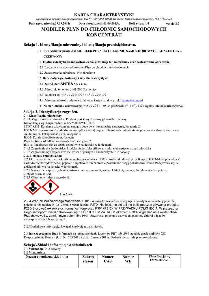 KARTA CHARAKTERYSTYKI Sporządzona zgodnie z Rozporządzeniem WE Nr 1907/2006 (REACH) oraz z Rozporządzeniem Komisji (UE) 453/2010 Data sporządzenia:09.09.2014r. Data aktualizacji: 01.06.2015r. Ilość stron: 1/5 wersja:2.0 MOBILER PŁYN DO CHŁODNIC SAMOCHODOWYCH KONCENTRAT Sekcja 1. Identyfikacja mieszaniny i identyfikacja przedsiębiorstwa. 1.1 Identyfikator produktu: MOBILER PŁYN DO CHŁODNIC SAMOCHODOWYCH KONCENTRATCZERWONY 1.2 Istotne zidentyfikowane zastosowania substancji lub mieszaniny oraz zastosowania odradzane: 1.2.1 Zastosowania zidentyfikowane: Płyn do chłodnic samochodowych 1.2.2 Zastosowania odradzane: Nie określono 1.3 Dane dotyczące dostawcy karty charakterystyki: 1.3.1Dystrybutor: AMTRA Sp. z o. o. 1.3.2 Adres: ul. Schonów 3, 41-200 Sosnowiec 1.3.3 Telefon/Fax: +48 32 2944100 / + 48 32 2944139 1.3.4 Adres email osoby odpowiedzialnej za kartę charakterystyki: [email protected] 1.4 Numer telefonu alarmowego: +48 32 294 41 30 (w godzinach 800- 1600), 112 ( ogólny telefon alarmowy)998, Sekcja 2. Identyfikacja zagrożeń. 2.1 Klasyfikacja mieszaniny: 2.1.1. Zagrożenia dla człowieka: Produkt jest klasyfikowany jako niebezpieczny. Klasyfikacja wg Rozporządzenia 1272/2008/WE (CLP) STOT RE.2- Działanie toksyczne na narządy docelowe- powtarzalne narażenie, kategoria 2 H373- Może powodować uszkodzenie narządów (nerki) poprzez długotrwałe lub narażenie powtarzalne drogą pokarmową Acute Tox.4- Toksyczność ostra, kategoria 4 H302- Działa szkodliwie po połknięciu Repr.2-Działa szkodliwe na rozrodczość, kategoria 2 H361d-Podejrzewa się, że działa szkodliwie na dziecko w łonie matki 2.1.2 Zagrożenie dla środowiska: Produkt nie jest klasyfikowany jako niebezpieczny dla środowiska 2.1.3 Zagrożenia wynikające z właściwości fizycznych i chemicznych: Nie dotyczy 2.2. Elementy oznakowania: 2.2.1 Oznaczenie literowe i określenie niebezpieczeństwa: H302- Działa szkodliwie po połknięciu H373-Może powodować uszkodzenie narządów(nerki) poprzez długotrwałe lub narażenie powtarzane drogą pokarmową H361d-Podejrzewa się, że działa szkodliwie na dziecko w łonie matki 2.2.2 Nazwy niebezpiecznych składników umieszczone na etykiecie: Glikol etylenowy, 2-etyloheksanian potasu, 2-etyloheksanian sodu 2.2.3 Określenie rodzaju zagrożenia: UWAGA 2.2.4 Warunki bezpiecznego stosowania: P101- W razie konieczności zasięgnięcia porady lekarza należy pokazać pojemnik lub etykietę P102- Chronić przed dziećmi P270- Nie jeść, nie pić ani nie palić podczas używania produktu P280-Stosować rękawice ochronne/ ochronę oczu P301+P312- W PRZYPADKU POŁKNIĘCIA: W przypadku złego samopoczucia skontaktować się z OŚRODKIEM ZATRUĆ/ lekarzem P330- Wypłukać usta wodą P404Przechowywać w zamkniętym pojemniku P501- Zawartość/ pojemnik usuwać do punktów zbiórki odpadów niebezpiecznych lub specjalnych. 2.2.4Dodatkowe informacje: Uwaga! Spożycie grozi śmiercią. 2.3 Inne zagrożenia: Brak informacji na temat spełniania kryteriów PBT lub vPvB zgodnie z załącznikiem XIII Rozporządzenia Komisji (UE) Nr 253/2011 z dnia 15 marca 2011r. Badania nie zostały przeprowadzone. Sekcja3.Skład i informacje o składnikach 3.1 Substancje: Nie dotyczy 3.2 Mieszaniny: Nazwa chemiczna składnika Zakres stężeń Numer CAS Numer WE Klasyfikacja wg 1272/2008/WE KARTA CHARAKTERYSTYKI Sporządzona zgodnie z Rozporządzeniem WE Nr 1907/2006 (REACH) oraz z Rozporządzeniem Komisji (UE) 453/2010 Data sporządzenia:09.09.2014r. Data aktualizacji: 01.06.2015r. Ilość stron: 2/5 wersja:2.0 MOBILER PŁYN DO CHŁODNIC SAMOCHODOWYCH KONCENTRAT Glikol monoetylenowy Nr rejestracji: 01-2119456816-28-xxxx 2-Etyloheksanian potasu Nr rejestracji: brak 2-Etyloheksanian sodu Nr rejestracji: brak 90%-93% 107-21-1 203-473-3 <2,7% 3164-85-0 221-625-7 Acute Tox.4, H302 STOT RE.2, H373 Repr.2, H361d <0,8% 19766-89-3 243-283-8 Repr.2, H361d SEKCJA 4. ŚRODKI PIERWSZEJ POMOCY 4.1 Opis środków pierwszej pomocy: 4.1.1 Połknięcie: Nie wywoływać wymiotów. Wypłukać usta wodą. Nigdy nie podawać niczego do ust osobie nieprzytomnej. Wezwać lekarza, pokazać opakowanie lub etykietę. 4.1.2. Zatrucie inhalacyjne: Skonsultować się z lekarzem, w razie wystąpienia niepokojących dolegliwości. Wyprowadzić poszkodowanego na świeże powietrze, zapewnić ciepło i spokój. 4.1.3. Skażenie skóry: Zdjąć skażoną odzież. Narażone partie skóry zmyć dokładnie wodą z mydłem. Skonsultować się z lekarzem w przypadku wystąpienia niepokojących objawów. 4.1.4.Skażenie oczu: Chronić niepodrażnione oko, wyjąć szkła kontaktowe. Zanieczyszczone oczy przepłukać dokładnie wodą przez kilka minut. Unikać silnego strumienia wody – ryzyko uszkodzenia rogówki. Skonsultować się z lekarzem okulistą w przypadku wystąpienia niepokojących objawów. 4.2 Najważniejsze ostre i opóźnione objawy oraz skutki narażenia: 4.2.1 Skażenie oczu: Może wystąpić podrażnienie, zaczerwienienie oraz łzawienie 4.2.2 Połknięcie: Mogą pojawić się mdłości, wymioty, ból głowy, zaburzenia równowagi i koordynacji, senność 4.4.3 Skóra: Może wystąpić zaczerwienienie, wysuszenie i pękanie skóry 4.3 Wskazania dotyczące wszelkiej natychmiastowej pomocy lekarskiej i szczególnego postępowania z poszkodowanym: Podjąć leczenie objawowe. Decyzję o sposobie postępowanie ratunkowego podejmuje lekarz po dokładnej ocenie stanu poszkodowanego. SEKCJA 5. POSTĘPOWANIE W PRZYPADKU POŻARU 5.1 Środki gaśnicze: 5.1.1 Odpowiednie środki gaśnicze: Stosować proszek gaśniczy, CO2, woda-prądy rozproszone, pianę odporną na alkohol 5.1.2 Niewłaściwe środki gaśnicze: Woda- zwarty strumień wody 5.2 Szczególne zagrożenia związane z mieszaniną: Podczas spalania mogą tworzyć się toksyczne spaliny zawierające tlenki węgla. Unikać wdychania produktów spalania, mogą stwarzać zagrożenie dla zdrowia. 5.3 Informacje dla straży pożarnej: Stosować standardowe meto