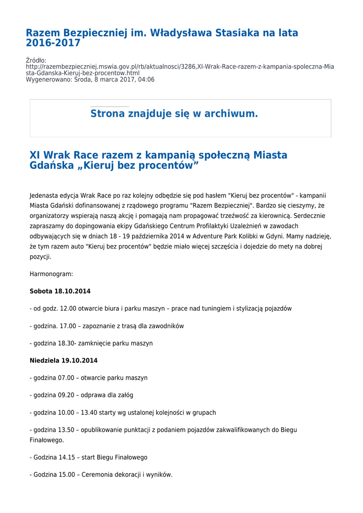 Razem Bezpieczniej im. Władysława Stasiaka na lata 2016-2017 Źródło: http://razembezpieczniej.mswia.gov.pl/rb/aktualnosci/3286,XI-Wrak-Race-razem-z-kampania-spoleczna-Mia sta-Gdanska-Kieruj-bez-procentow.html Wygenerowano: Środa, 8 marca 2017, 04:06 Strona znajduje się w archiwum. XI Wrak Race razem z kampanią społeczną Miasta Gdańska „Kieruj bez procentów” Jedenasta edycja Wrak Race po raz kolejny odbędzie się pod hasłem "Kieruj bez procentów" - kampanii Miasta Gdański dofinansowanej z rządowego programu "Razem Bezpieczniej". Bardzo się cieszymy, że organizatorzy wspierają naszą akcję i pomagają nam propagować trzeźwość za kierownicą. Serdecznie zapraszamy do dopingowania ekipy Gdańskiego Centrum Profilaktyki Uzależnień w zawodach odbywających się w dniach 18 - 19 października 2014 w Adventure Park Kolibki w Gdyni. Mamy nadzieję, że tym razem auto "Kieruj bez procentów" będzie miało więcej szczęścia i dojedzie do mety na dobrej pozycji. Harmonogram: Sobota 18.10.2014 - od godz. 12.00 otwarcie biura i parku maszyn – prace nad tuningiem i stylizacją pojazdów - godzina. 17.00 – zapoznanie z trasą dla zawodników - godzina 18.30- zamknięcie parku maszyn Niedziela 19.10.2014 - godzina 07.00 – otwarcie parku maszyn - godzina 09.20 – odprawa dla załóg - godzina 10.00 – 13.40 starty wg ustalonej kolejności w grupach - godzina 13.50 – opublikowanie punktacji z podaniem pojazdów zakwalifikowanych do Biegu Finałowego. - Godzina 14.15 – start Biegu Finałowego - Godzina 15.00 – Ceremonia dekoracji i wyników. - Godzina 15.15 – 19.00 – wyjazd pojazdów z parku maszyn Więcej na stronie www.adventurepark.pl Kampania społeczna Miasta Gdańska „Kieruj bez procentów” jest dofinansowana w ramach rządowego programu „Razem bezpieczniej” oraz przez Pomorską Radę Bezpieczeństwa Ruchu Drogowego linki do nowych filmów "Kieruj bez procentów" https://www.youtube.com/watch?v=FyNzfA8K6ng&index=1&list=PLXr2w4QGLkHTz26aIK7LkNDdGY0KM LIzg https://www.youtube.com/watch?v=n8spS2_2_F4&list=PLXr2w4QGLkHTz26aIK7LkNDdGY0KMLIzg&index =2 https://www.youtube.com/watch?v=P_WT9bEm3jk&list=PLXr2w4QGLkHTz26aIK7LkNDdGY0KMLIzg&inde x=3 https://www.youtube.com/watch?v=P3S7k4tlJLk&index=4&list=PLXr2w4QGLkHTz26aIK7LkNDdGY0KMLI zg https://www.youtube.com/watch?v=9i8DZBrfj1E&index=7&list=PLXr2w4QGLkHTz26aIK7LkNDdGY0KMLI zg https://www.youtube.com/watch?v=dWHJ9UWtHIM&index=6&list=PLXr2w4QGLkHTz26aIK7LkNDdGY0K MLIzg https://www.youtube.com/watch?v=ut1ZB9mzUfg&index=5&list=PLXr2w4QGLkHTz26aIK7LkNDdGY0KM LIzg