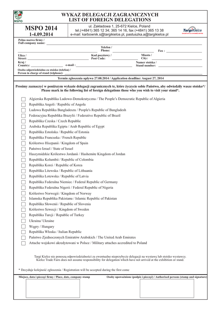 WYKAZ DELEGACJI ZAGRANICZNYCH LIST OF FOREIGN DELEGATIONS MSPO 2014 1-4.09.2014 ul. Zak³adowa 1, 25-672 Kielce, Poland tel.(+4841) 365 12 34; 365 14 16, fax (+4841) 365 13 38 e-mail: [email protected], [email protected] Pe³na nazwa firmy / Full company name: Telefon / Phone: Kod pocztowy / Post Code: Ulica / Street: Kraj / Country: e-mail : Fax : Miasto / City: Numer stoiska / Stand number: Osoba odpowiedzialna za stoisko (telefon) / Person in charge of stand (telphone): Termin zg³oszenia up³ywa 27.08.2014 / Application deadline: August 27, 2014 Prosimy zaznaczyæ w poni¿szym wykazie delegacji zagranicznych te, które ¿yczycie sobie Pañstwo, aby odwiedzi³y wasze stoisko*/ Please mark in the following list of foreign delegations those who you wish to visit your stand*. Algierska Republika Ludowo-Demokratyczna / The People’s Democratic Republic of Algieria Republika Angoli / Republic of Angola Ludowa Republika Bangladeszu / People's Republic of Bangladesh Federacyjna Republika Brazylii / Federative Republic of Brazil Republika Czeska / Czech Republic Arabska Republika Egiptu / Arab Republic of Egypt Republika Estoñska / Republic of Estonia Republika Francuska / French Republic Królestwo Hiszpanii / Kingdom of Spain Pañstwo Izrael / State of Israel Haszymidzkie Królestwo Jordanii / Hashemite Kingdom of Jordan Republika Kolumbii / Republic of Colombia Republika Korei / Republic of Korea Republika Litewska / Republic of Lithuania Republika £otewska / Republic of Latvia Republika Federalna Niemiec / Federal Republic of Germany Republika Federalna Nigerii / Federal Republic of Nigeria Królestwo Norwegii / Kingdom of Norway Islamska Republika Pakistanu / Islamic Republic of Pakistan Republika S³owenii / Republic of Slovenia Królestwo Szwecji / Kingdom of Sweden Republika Turcji / Republic of Turkey Ukraina/ Ukraine Wêgry / Hungary Republika W³oska / Italian Republic Pañstwo Zjednoczonych Emiratów Arabskich / The United Arab Emirates Attache wojskowi akredytowani w Polsce / Military attaches accredited to Poland Targi Kielce nie ponosz¹ odpowiedzialnoœci za ewentualne nieprzybycie delegacji na wystawê lub stoisko wystawcy. Kielce Trade Fairs does not assume responsibility for delegation which have not arrived at the exhibition or stand. * Decyduje kolejnoœæ zg³oszenia / Registration will be accepted during the first come Miejsce, data i pieczêæ firmy / Place, date, company stamp Osoby upowa¿nione (podpis i pieczêæ) / Authorised persons (stamp and signature)