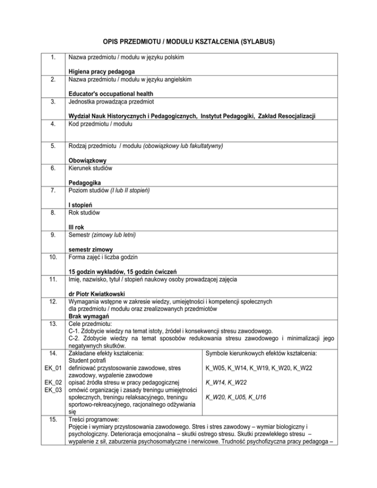 OPIS PRZEDMIOTU / MODUŁU KSZTAŁCENIA (SYLABUS) 1. Nazwa przedmiotu / modułu w języku polskim 2. Higiena pracy pedagoga Nazwa przedmiotu / modułu w języku angielskim 3. Educator's occupational health Jednostka prowadząca przedmiot 4. Wydział Nauk Historycznych i Pedagogicznych, Instytut Pedagogiki, Zakład Resocjalizacji Kod przedmiotu / modułu 5. Rodzaj przedmiotu / modułu (obowiązkowy lub fakultatywny) 6. Obowiązkowy Kierunek studiów 7. Pedagogika Poziom studiów (I lub II stopień) 8. I stopień Rok studiów 9. III rok Semestr (zimowy lub letni) 10. semestr zimowy Forma zajęć i liczba godzin 11. 15 godzin wykładów, 15 godzin ćwiczeń Imię, nazwisko, tytuł / stopień naukowy osoby prowadzącej zajęcia dr Piotr Kwiatkowski 12. Wymagania wstępne w zakresie wiedzy, umiejętności i kompetencji społecznych dla przedmiotu / modułu oraz zrealizowanych przedmiotów Brak wymagań 13. Cele przedmiotu: C-1. Zdobycie wiedzy na temat istoty, źródeł i konsekwencji stresu zawodowego. C-2. Zdobycie wiedzy na temat sposobów redukowania stresu zawodowego i minimalizacji jego negatywnych skutków. 14. Zakładane efekty kształcenia: Symbole kierunkowych efektów kształcenia: Student potrafi EK_01 definiować przystosowanie zawodowe, stres K_W05, K_W14, K_W19, K_W20, K_W22 zawodowy, wypalenie zawodowe EK_02 opisać źródła stresu w pracy pedagogicznej K_W14, K_W22 EK_03 omówić organizację i zasady treningu umiejętności społecznych, treningu relaksacyjnego, treningu K_W20, K_U05, K_U16 sportowo-rekreacyjnego, racjonalnego odżywiania się 15. Treści programowe: Pojęcie i wymiary przystosowania zawodowego. Stres i stres zawodowy – wymiar biologiczny i psychologiczny. Deterioracja emocjonalna – skutki ostrego stresu. Skutki przewlekłego stresu – wypalenie z sił, zaburzenia psychosomatyczne i nerwicowe. Trudność psychofizyczna pracy pedagoga – 17. aspekty organizacyjne, interpersonalne, intrapsychiczne. Radzenie sobie i resiliencja. Podstawy programu antystresowego – organizacja pracy i czasu wolnego, trening kompetencji zawodowej i interpersonalnej, trennig relaksacyjny, programowanie aktywności fizycznej i optymalizacja diety. Zasady ustrukturalizowanego uczenia się umiejętności. Zalecana literatura (podręczniki) G.S. Everly, R. Rosenfeld, Stres. Przyczyny, terapia, autoterapia, Warszawa 1992. R. Kretschmann, Stres w zawodzie nauczyciela, Gdańsk 2004. N.Ogińska-Bulik, Stres w zawodach usług społecznych. Źródła. Konsekwencje. Zapobieganie, Warszawa 2006. M. Sekułowicz, Wypalenie zawodowe nauczycieli pracujących z osobami z niepełnosprawnością intelektualną: przyczyny – symptomy – zapobieganie – przezwyciężanie, Wrocław 2002. Forma zaliczenia poszczególnych komponentów przedmiotu / modułu, sposób sprawdzenia osiągnięcia zamierzonych efektów kształcenia: Zaliczenie wykładu: okazanie kompletu fiszek z samodzielnej lektury, obecność na wykładzie Zaliczenie ćwiczeń na ocenę. Ocena odzwierciedla pracę studenta w ramach zajęć oraz samodzielną pracę nad literaturą przedmiotu. Kryteria oceny: Prowadzący wylicza cztery odrębne oceny cząstkowe. Ostateczna ocena jest średnią ważoną z tych czterech kryteriów wg wzoru: 0,20 x (ocena za udział w zajęciach czyli za frekwencję i aktywność) + 0,20 x (średnia z prac pisemnych lub(i) odpowiedzi ustnych z bieżącego materiału) + 0,40 x średnia z ocen ze sprawdzianów + 0,20 x (ocena za wykonanie zadań dodatkowych). Zaokrąglenie następuje do połowy stopnia wg reguł arytmetyki. Liczba sprawdzianów i domowych prac pisemnych jest ustalona na początku semestru, natomiast zadania dodatkowe są przedstawiane w trakcie kolejnych zajęć przez prowadzącego, który wyznaczając ich temat może uwzględnić propozycje studenta). 18. Język wykładowy 19. Polski Obciążenie pracą studenta Forma aktywności studenta 16. Godziny zajęć (według planu studiów) z nauczycielem: - wykład - ćwiczenia Praca własna studenta - przygotowanie zadań domowych - czytanie wskazanej literatury Suma godzin Liczba punktów ECTS *objaśnienie symboli: K (przed podkreśleniem) - kierunkowe efekty kształcenia W - kategoria wiedzy U - kategoria umiejętności K (po podkreśleniu) - kategoria kompetencji społecznych 01, 02, 03 i kolejne - numer efektu kształcenia Średnia liczba godzin na zrealizowanie aktywności 15 15 10 15 55 2