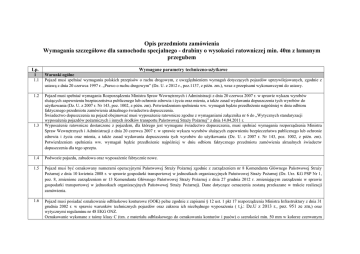 Opis przedmiotu zamówienia Wymagania szczegółowe dla samochodu specjalnego - drabiny o wysokości ratowniczej min. 40m z łamanym przegubem Lp. Wymagane parametry techniczno-użytkowe 1 1.1 Warunki ogólne Pojazd musi spełniać wymagania polskich przepisów o ruchu drogowym, z uwzględnieniem wymagań dotyczących pojazdów uprzywilejowanych, zgodnie z ustawą z dnia 20 czerwca 1997 r. „Prawo o ruchu drogowym” (Dz. U. z 2012 r., poz.1137, z późn. zm.), wraz z przepisami wykonawczymi do ustawy. 1.2 Pojazd musi spełniać wymagania Rozporządzenia Ministra Spraw Wewnętrznych i Administracji z dnia 20 czerwca 2007 r. w sprawie wykazu wyrobów służących zapewnieniu bezpieczeństwa publicznego lub ochronie zdrowia i życia oraz mienia, a także zasad wydawania dopuszczenia tych wyrobów do użytkowania (Dz. U. z 2007 r. Nr 143, poz. 1002, z późn. zm). Potwierdzeniem spełnienia ww. wymagań będzie przedłożenie najpóźniej w dniu odbioru faktycznego przedmiotu zamówienia aktualnego świadectwa dopuszczenia. Świadectwo dopuszczenia na pojazd obejmować musi wyposażenie ratownicze zgodne z wymaganiami załącznika nr 6 do „Wytycznych standaryzacji wyposażenia pojazdów pożarniczych i innych środków transportu Państwowej Straży Pożarnej” z dnia 14.04.2011 r. Wyposażenie ratownicze dostarczone z pojazdem, dla którego jest wymagane świadectwo dopuszczenia, musi spełniać wymagania rozporządzenia Ministra Spraw Wewnętrznych i Administracji z dnia 20 czerwca 2007 r. w sprawie wykazu wyrobów służących zapewnieniu bezpieczeństwa publicznego lub ochronie zdrowia i życia oraz mienia, a także zasad wydawania dopuszczenia tych wyrobów do użytkowania (Dz. U. z 2007 r. Nr 143, poz. 1002, z późn. zm). Potwierdzeniem spełnienia ww. wymagań będzie przedłożenie najpóźniej w dniu odbioru faktycznego przedmiotu zamówienia aktualnych świadectw dopuszczenia dla tego sprzętu. 1.3 1.4 Podwozie pojazdu, zabudowa oraz wyposażenie fabrycznie nowe. 1.5 Pojazd musi być oznakowany numerami operacyjnymi Państwowej Straży Pożarnej zgodnie z zarządzeniem nr 8 Komendanta Głównego Państwowej Straży Pożarnej z dnia 10 kwietnia 2008 r. w sprawie gospodarki transportowej w jednostkach organizacyjnych Państwowej Straży Pożarnej (Dz. Urz. KG PSP Nr 1, poz. 8, zmienione zarządzeniem nr 13 Komendanta Głównego Państwowej Straży Pożarnej z dnia 27 grudnia 2012 r. zmieniającym zarządzenie w sprawie gospodarki transportowej w jednostkach organizacyjnych Państwowej Straży Pożarnej). Dane dotyczące oznaczenia zostaną przekazane w trakcie realizacji zamówienia. 1.6 Pojazd musi posiadać oznakowanie odblaskowe konturowe (OOK) pełne zgodnie z zapisami § 12 ust. 1 pkt 17 rozporządzenia Ministra Infrastruktury z dnia 31 grudnia 2002 r. w sprawie warunków technicznych pojazdów oraz zakresu ich niezbędnego wyposażenia ( t.j.: Dz.U z 2013 r., poz. 951 ze zm,) oraz wytycznymi regulaminu nr 48 EKG ONZ. Oznakowanie wykonane z taśmy klasy C (tzn. z materiału odblaskowego do oznakowania konturów i pasów) o szerokości min. 50 mm w kolorze czerwonym (boczne żółtym) oznakowanej znakiem homologacji międzynarodowej. Oznakowanie powinno znajdować się możliwie najbliżej poziomych i pionowych krawędzi pojazdu. 2 2.1 2.2 2.3 2.4 2.5 2.6 2.7 2.8 2.9 2.10 2.11 2.12 2.13 2.14 2.15 Podwozie z kabiną Wymiary pojazdu w pozycji transportowej: - wysokość nie większa niż 3500 mm, - długość nie większa niż 11500 mm, - szerokość nie większa niż 2550 mm. Urządzenie sygnalizacyjno-akustyczne powinno posiadać min. 3 modulowane tony, głośnik o mocy min. 200 W (lub dwa głośniki o mocy 100 W każdy) oraz powinno umożliwiać podawanie komunikatów słownych. Sterowanie modulacją dźwiękową musi odbywać się zarówno poprzez manipulator urządzenia i włącznik sygnału dźwiękowego pojazdu. Lampy sygnalizacyjne niebieskie wykonane w technologii LED: dwie na dachu kabiny i jedna z tyłu pojazdu zamontowane symetrycznie przy górnych narożnikach zabudowy pożarniczej lub na osłonie zespołu drabiny. Dodatkowe lampy sygnalizacyjne kierunkowe niebieskie LED: dwie umieszczone z przodu pojazdu oraz po dwie na każdym boku. Dodatkowy pneumatyczny sygnał typu „air-horn”, włączany jednym z dwóch niezależnych włączników umiejscowionych w kabinie, w miejscach łatwo dostępnych odpowiednio dla kierowcy i dowódcy. Podwozie samochodu wyposażone w silnik o zapłonie samoczynnym spełniający normę czystości spalin umożliwiającą zarejestrowanie pojazdu. W przypadku stosowania dodatkowego środka w celu redukcji emisji spalin (np. AdBlue), nie może nastąpić redukcja momentu obrotowego silnika w przypadku braku tego środka. Maksymalna moc silnika – min 210 kW. Silnik samochodu przystosowany do zasilania biopaliwami lub paliwami z dodatkiem biokomponentów w ilości nie mniejszej niż 5%. Do oferty należy dołączyć deklarację o możliwości stosowania tego rodzaju paliw. W instrukcji użytkowania samochodu muszą znaleźć się zapisy o warunkach technicznych oraz czynnościach obsługowych koniecznych przy zasilaniu silnika biopaliwami lub paliwami z biokomponentami. Gwarancja na pojazd nie może wyłączać stosowania w/w paliwa. Skrzynia przekładniowa automatyczna lub mechaniczna z automatycznym sterowaniem zmianą biegów (bez pedału sprzęgła). Maksymalna prędkość min 100km/h. Układ napędowy min. 4x2, most napędowy wyposażony w blokadę mechanizmu różnicowego. Pojazd wyposażony w układ zapobiegający blokowaniu kół podczas hamowania (ABS). Pojazd wyposażony w szekle do mocowania lin do wyciągania pojazdu, zamontowane po dwie z przodu i tyłu pojazdu. Pojazd wyposażony w reflektory przeciwmgielne. Ogumienie szosowe, z bieżnikiem dostosowanym do różnych warunków atmosferycznych. Koło zapasowe - bez mocowania i miejsca do stałego przewożenia w pojeździe. Wylot spalin nie może być skierowany na stanowiska