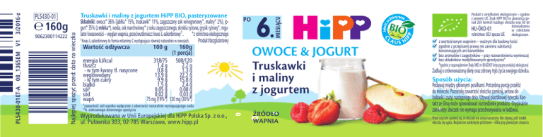 9062300114222 Składniki: owoce* 36% (jabłka* 15%, truskawki* 11%, zagęszczony sok winogronowy*, maliny* 2%), jogurt* 35% (z mleka*), woda, sok marchwiowy* z soku zagęszczonego, skrobia ryżowa, grysik ryżowy*, regulator kwasowości – węglan wapnia, przeciwutleniacz: kwas L-askorbinowy1. *z rolnictwa ekologicznego 1 Kwas L-askorbinowy to forma witaminy C występująca również naturalnie w owocach. Produkt bezglutenowy Wartość odżywcza 100 g 160g (1 porcja) energia kJ/kcal 318/75 508/120 tłuszcz 1,4 g 2,2 g - w tym kwasy tł. nasycone 0,8 g 1,3 g węglowodany 13,9 g 22,2 g - w tym cukry 9,9 g 15,8 g białko 1,5 g 2,4 g sól2 0,05 g 0,08 g sód 0,02 3g 0,03 3g wapń 75 mg (19% ) 120 mg (30% ) PO 6. MIESIĄCU 0 160g Najlepiej spożyć przed: data na wieczku PL5430 01ET A PL5430-01ET-A 08_1365EM V1 3/2016-z Truskawki i maliny z jogurtem HiPP BIO, pasteryzowane PL5430-01 OWOCE & JOGURT Truskawki i maliny z jogurtem 2 zawartość soli wynika wyłącznie z obecności naturalnie występującego sodu % zalecanego dziennego spożycia 3 Wyprodukowano w Unii Europejskiej dla HiPP Polska Sp. z o.o., ul. Puławska 303, 02-785 Warszawa, www.hipp.pl ŹRÓDŁO WAPNIA Produkt z certyfikatem ekologicznym – zgodnie z prawem UE. Znak HiPP BIO to gwarancja ponad 260 kontroli każdego słoiczka oraz 60 lat doświadczenia HU-ÖKO-01 w rolnictwie rolnictwo UE/ spoza UE ekologicznym. 12 z wartościowym wapniem – ważnym dla budowy kości 12 zgodnie z przepisami prawa nie zawiera substancji konserwujących ani barwników 12 bez aromatów i zagęstników – przy rozwarstwieniu wymieszaj 12 bez składników modyfikowanych genetycznie4 4 zgodnie z rozporządzeniem Rady (WE) nr 834/2007 dotyczącym produkcji ekologicznej Zadbaj o zrównoważoną dietę oraz zdrowy tryb życia swojego dziecka. Sposób użycia: Podawaj między głównymi posiłkami. Potrzebną porcję przełóż do miseczki. Pozostałą zawartość słoiczka zamknij, wstaw do lodówki i zużyj następnego dnia. Używaj plastikowej łyżeczki. Kontakt ze śliną może spowodować rozrzedzenie produktu. Oryginalnie zamknięty słoiczek nie wymaga przechowywania w lodówce. Przed użyciem upewnij się, że słoiczek nie został naruszony. Nie używaj, jeśli środek wieczka się ugina. Bezpieczne zamknięcie próżniowe – klika przy pierwszym otwarciu.