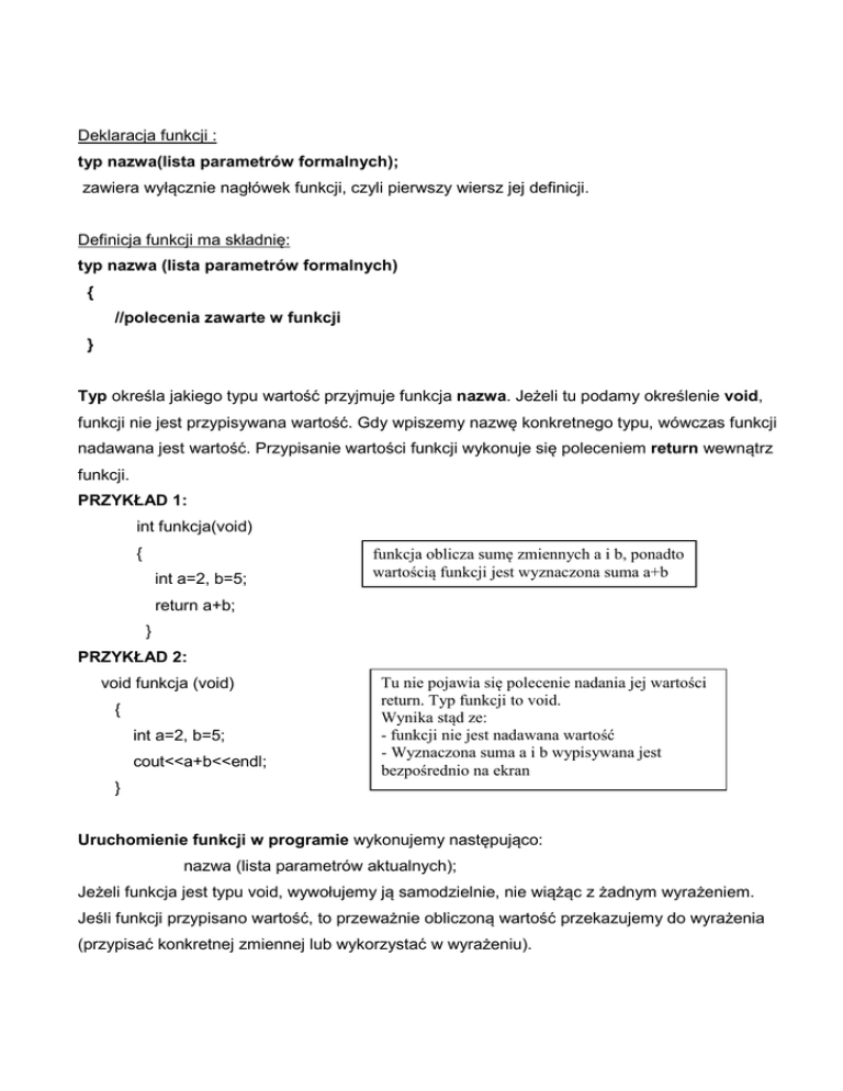 momencie deklarowania (definiowania) funkcji. Gdy już przechodzimy do jej uruchomienia, w