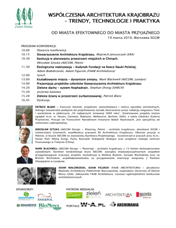 WSPÓŁCZESNA ARCHITEKTURA ARCHITEKTURA KRAJOBRAZU – TRENDY, TECHNOLOGIE I PRAKTYKA OD MIASTA EFEKTOWNEGO DO MIASTA PRZYJAZNEGO 19 marca 2010, Warszawa SGGW PROGRAM KONFERENCJI: 10.00 Otwarcie konferencji 10.15 Stowarzyszenie Architektury Krajobrazu, Krajobrazu Wojciech Januszczyk (SAK) 10.30 Ewolucja w planowaniu przestrzeni przestrzeni miejskich w Chinach, Chinach Mirosław Sztuka (AECOM, Pekin) 11.30 Ekologiczna reaktywacja - budynek Fundacji na Rzecz Nauki Polskiej, Polskiej 12.00 13.00 Adam Białobrzeski, Adam Figurski (FAAB Architektura) lunch Kształtowanie Kształtowanie miasta - dynamizm zmiany, zmiany Mark Blackwell (AECOM, Londyn) 14.00 Prezentacja projektów członków Stowarzyszenia Architektury Krajobrazu 14.20 Zielone dachy – system Nophadrain, Nophadrain Stephan Droog (SARCH) 15.50 przerwa kawowa 15.20 Zielone ściany w przestrzeni przestrzeni zurbanizowanej, zurbanizowanej Patrick Blanc 16.45 Dyskusja PATRICK BLANC – francuski botanik, projektant; pomysłodawca i twórca ogrodów wertykalnych, którego nowatorskie podejście do projektowania zostało dostrzeŜone przez redakcję magazynu Time i wyróŜnione w plebiscycie „50 najlepszych innowacji 2009 roku”. Zrealizowane projekty moŜna oglądać m.in. w: ParyŜu, Genewie, Madrycie, Melbourne, Berlinie, Delhi, a takŜe Gdańsku (Galeria Przymorze). Pracuje we Francuskim Narodowym Instytucie Badań Naukowych, jest specjalistą od roślinności subtropikalnej. MIROSŁAW SZTUKA (AECOM Design + Planning, Pekin) – architekt krajobrazu, absolwent SGGW i Uniwersytetu Greenwich; współtwórca pracowni RS Architektura Krajobrazu. Obecnie pracuje w Pekinie, w biurze AECOM na stanowisku Dyrektora Projektowego. Uczestniczył w pracach przy m.in.: Ocean Park (Hong Kong), Parku Rozrywki Dubajland (Dubaju) oraz projekcie nowego centrum finansowego w Tianjinie (Chiny). MARK BLACKWELL (AECOM Design + Planning) – architekt krajobrazu z 15-letnim doświadczeniem zawodowym; Dyrektor londyńskiego biura AECOM; zarządza międzydyscyplinarnym zespołem przygotowującym znaczące projekty rewitalizacji w Wielkiej Brytanii, Europie Wschodniej oraz na Bliskim Wschodzie; współodpowiedzialny za przygotowanie inwestycji związanej z Parkiem Olimpijskim w Londynie. ADAM BIAŁOBRZESKI, ADAM ADAM FIGURSKI (FAAB ARCHITEKTURA) – absolwenci Wydziału Architektury Politechniki Warszawskiej; stypendyści University of Detroit Mercy (USA). ZałoŜyciele FAAB Architektura. Laureaci ogólnopolskich konkursów architektonicznych. SPONSORZY: PATRONI MEDIALNI: PORTALE: Koszt uczestnictwa: - 150 PLN dla członków stowarzyszenia - 250 PLN dla osób nie będących członkami stowarzyszenia - 50 studenci - 25 studenci, członkowie stowarzyszenia Formularz zgłoszeniowy on-line na stronie: www.zielenpolska.pl