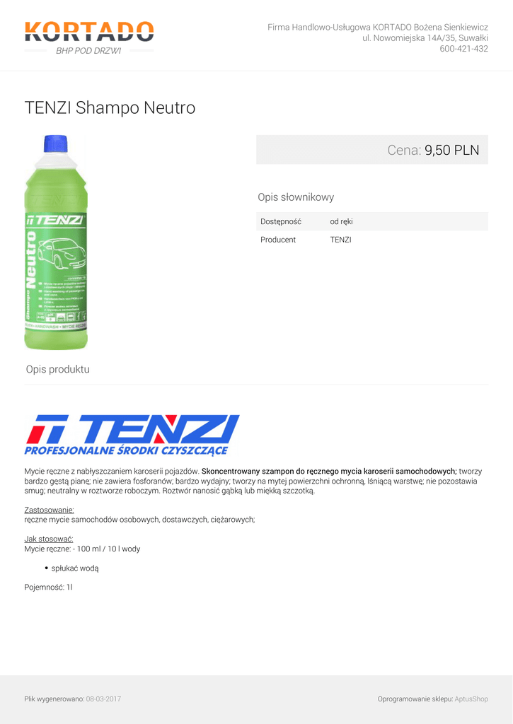 Firma Handlowo-Usługowa KORTADO Bożena Sienkiewicz ul. Nowomiejska 14A/35, Suwałki 600-421-432 TENZI Shampo Neutro Cena: 9,50 PLN Opis słownikowy Dostępność od ręki Producent TENZI Opis produktu Mycie ręczne z nabłyszczaniem karoserii pojazdów. Skoncentrowany szampon do ręcznego mycia karoserii samochodowych; tworzy bardzo gęstą pianę; nie zawiera fosforanów; bardzo wydajny; tworzy na mytej powierzchni ochronną, lśniącą warstwę; nie pozostawia smug; neutralny w roztworze roboczym. Roztwór nanosić gąbką lub miękką szczotką. Zastosowanie: ręczne mycie samochodów osobowych, dostawczych, ciężarowych; Jak stosować: Mycie ręczne: - 100 ml / 10 l wody spłukać wodą Pojemność: 1l Plik wygenerowano: 08-03-2017 Powered by TCPDF (www.tcpdf.org) Oprogramowanie sklepu: AptusShop
