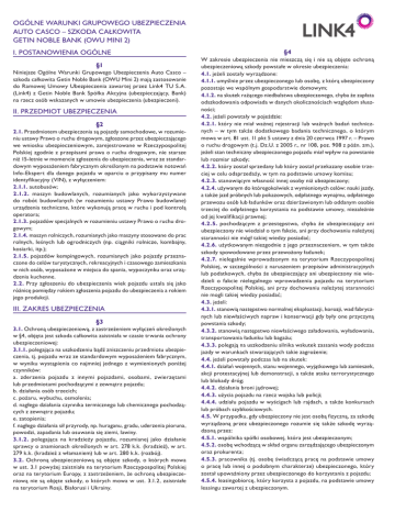 OGÓLNE WARUNKI GRUPOWEGO UBEZPIECZENIA AUTO CASCO – SZKODA CAŁKOWITA GETIN NOBLE BANK (OWU MINI 2) I. POSTANOWIENIA OGÓLNE §1 Niniejsze Ogólne Warunki Grupowego Ubezpieczenia Auto Casco – szkoda całkowita Getin Noble Bank (OWU Mini 2) mają zastosowanie do Ramowej Umowy Ubezpieczenia zawartej przez Link4 TU S.A. (Link4) z Getin Noble Bank Spółka Akcyjna (ubezpieczający, Bank) na rzecz osób wskazanych w umowie ubezpieczenia (ubezpieczeni). II. PRZEDMIOT UBEZPIECZENIA §2 2.1. Przedmiotem ubezpieczenia są pojazdy samochodowe, w rozumieniu ustawy Prawo o ruchu drogowym, zgłoszone przez ubezpieczającego we wniosku ubezpieczeniowym, zarejestrowane w Rzeczypospolitej Polskiej zgodnie z przepisami prawa o ruchu drogowym, nie starsze niż 15-letnie w momencie zgłoszenia do ubezpieczenia, wraz ze standardowym wyposażeniem fabrycznym określonym na podstawie notowań Info-Ekspert dla danego pojazdu w oparciu o przypisany mu numer identyfikacyjny (VIN), z wyłączeniem: 2.1.1. autobusów; 2.1.2. maszyn budowlanych, rozumianych jako wykorzystywane do robót budowlanych (w rozumieniu ustawy Prawo budowlane) urządzenia techniczne, które wykonują pracę w ruchu i pod kontrolą operatora; 2.1.3. pojazdów specjalnych w rozumieniu ustawy Prawo o ruchu drogowym; 2.1.4. maszyn rolniczych, rozumianych jako maszyny stosowane do prac rolnych, leśnych lub ogrodniczych (np. ciągniki rolnicze, kombajny, kosiarki, itp.); 2.1.5. pojazdów kempingowych, rozumianych jako pojazdy przeznaczone do celów turystycznych, rekreacyjnych i czasowego zamieszkania w nich osób, wyposażone w miejsca do spania, wypoczynku oraz urządzenia kuchenne. 2.2. Przy zgłoszeniu do ubezpieczenia wiek pojazdu ustala się jako różnicę pomiędzy rokiem zgłoszenia pojazdu do ubezpieczenia a rokiem jego produkcji. III. ZAKRES UBEZPIECZENIA §3 3.1. Ochroną ubezpieczeniową, z zastrzeżeniem wyłączeń określonych w §4, objęta jest szkoda całkowita zaistniała w czasie trwania ochrony ubezpieczeniowej: 3.1.1. polegająca na uszkodzeniu bądź zniszczeniu przedmiotu ubezpieczenia, tj. pojazdu wraz ze standardowym wyposażeniem fabrycznym, w wyniku wystąpienia co najmniej jednego z wymienionych poniżej czynników: a. zderzenia pojazdu z innymi pojazdami, osobami, zwierzętami lub przedmiotami pochodzącymi z zewnątrz pojazdu; b. działania osób trzecich; c. pożaru, wybuchu, osmolenia; d. nagłego działania czynnika termicznego lub chemicznego pochodzących z zewnątrz pojazdu; e. zatopienia; f. nagłego działania sił przyrody, np. huraganu, gradu, uderzenia pioruna, powodzi, zapadania lub osuwania się ziemi, lawiny. 3.1.2. polegająca na kradzieży pojazdu, rozumianej jako działanie sprawcy o znamionach określonych w art. 278 k.k. (kradzież), w art. 279 k.k. (kradzież z włamaniem) lub w art. 280 k.k. (rozbój). 3.2. Ochroną ubezpieczeniową są objęte szkody, o których mowa w ust. 3.1 powyżej zaistniałe na terytorium Rzeczypospolitej Polskiej oraz na terytorium Europy, z zastrzeżeniem, że ochroną ubezpieczeniową nie są objęte szkody, o których mowa w ust. 3.1.2, zaistniałe na terytorium Rosji, Białorusi i Ukrainy. §4 W zakresie ubezpieczenia nie mieszczą się i nie są objęte ochroną ubezpieczeniową szkody powstałe w okresie ubezpieczenia: 4.1. jeżeli zostały wyrządzone: 4.1.1. umyślnie przez ubezpieczonego lub osobę, z którą ubezpieczony pozostaje we wspólnym gospodarstwie domowym; 4.1.2. na skutek rażącego niedbalstwa ubezpieczonego, chyba że zapłata odszkodowania odpowiada w danych okolicznościach względom słuszności; 4.2. jeżeli powstały w pojeździe: 4.2.1. który nie miał ważnej rejestracji lub ważnych badań technicznych – w tym także dodatkowego badania technicznego, o którym mowa w art. 81 ust. 11 pkt 5 ustawy z dnia 20 czerwca 1997 r. – Prawo o ruchu drogowym (t.j. Dz.U. z 2005 r., nr 108, poz. 908 z późn. zm.), jeżeli stan techniczny ubezpieczonego pojazdu miał wpływ na powstanie lub rozmiar szkody; 4.2.2. który został sprzedany lub który został przekazany osobie trzeciej w celu odsprzedaży, w tym na podstawie umowy komisu; 4.2.3. stanowiącym własność innej osoby niż ubezpieczony; 4.2.4. używanym do któregokolwiek z wymienionych celów: nauki jazdy, a także jazd próbnych lub pokazowych, odpłatnego wynajmu, odpłatnego przewozu osób lub ładunków oraz dzierżawionym lub oddanym osobie trzeciej do odpłatnego korzystania na podstawie umowy, niezależnie od jej kwalifikacji prawnej; 4.2.5. pochodzącym z przestępstwa, chyba że ubezpieczający ani ubezpieczony nie wiedział o tym fakcie, ani przy dochowaniu należytej staranności nie mógł takiej wiedzy posiadać; 4.2.6. użytkowanym niezgodnie z jego przeznaczeniem, w tym także szkody spowodowane przez przewożony ładunek; 4.2.7. nielegalnie wprowadzonym na terytorium Rzeczypospolitej Polskiej, w szczególności z naruszeniem przepisów administracyjnych lub podatkowych, chyba że ubezpieczający ani ubezpieczony nie wiedzieli o fakcie nielegalnego wprowadzenia pojazdu na terytorium Rzeczypospolitej Polskiej, ani przy dochowaniu należytej staranności nie mogli takiej wiedzy posiadać; 4.3. jeżeli: 4.3.1. stanowią następstwo normalnej eksploatacji, korozji, wad fabrycznych lub niewłaściwych napraw i konserwacji gdy były one przyczyną powstania szkody; 4.3.2. stanowią następstwo niewłaściwego załadowania, wyładowania, transportowania ładunku lub bagażu; 4.3.3. polegają na uszkodzeniu silnika wskutek zassania wody podczas jazdy w warunkach stwarzających takie zagrożenie; 4.4. jeżeli powstały podczas lub na skutek: 4.4.1. działań wojennych, stanu wojennego, wyjątkowego lub zamieszek, akcji protestacyjnej lub demonstracji, a także ataku terrorystycznego lub blokady dróg; 4.4.2. działania broni jądrowej; 4.4.3. użycia pojazdu na rzecz wojska lub policji; 4.4.4. udziału pojazdu w wyścigach lub rajdach, a także konkursach lub próbach szybk