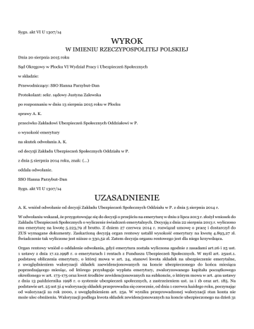 Sygn. akt VI U 1307/14 WYROK W IMIENIU RZECZYPOSPOLITEJ POLSKIEJ Dnia 20 sierpnia 2015 roku Sąd Okręgowy w Płocku VI Wydział Pracy i Ubezpieczeń Społecznych w składzie: Przewodniczący: SSO Hanna Parzybut-Dan Protokolant: sekr. sądowy Justyna Zalewska po rozpoznaniu w dniu 13 sierpnia 2015 roku w Płocku sprawy A. K. przeciwko Zakładowi Ubezpieczeń Społecznych Oddziałowi w P. o wysokość emerytury na skutek odwołania A. K. od decyzji Zakładu Ubezpieczeń Społecznych Oddziału w P. z dnia 5 sierpnia 2014 roku, znak: (...) oddala odwołanie. SSO Hanna Parzybut-Dan Sygn. akt VI U 1307/14 UZASADNIENIE A. K. wniósł odwołanie od decyzji Zakładu Ubezpieczeń Społecznych Oddziału w P. z dnia 5 sierpnia 2014 r. W odwołaniu wskazał, że przygotowując się do decyzji o przejściu na emeryturę w dniu 2 lipca 2013 r. złożył wniosek do Zakładu Ubezpieczeń Społecznych o wyliczenie świadczeń emerytalnych. Decyzją z dnia 22 sierpnia 2013 r. wyliczono mu emeryturę na kwotę 5.223,79 zł brutto. Z dniem 27 czerwca 2014 r. rozwiązał umowę o pracę i dostarczył do ZUS wymagane dokumenty. Zaskarżoną decyzją organ rentowy ustalił wysokość emerytury na kwotę 4.893,27 zł. Świadczenie tak wyliczone jest niższe o 330,52 zł. Zatem decyzja organu rentowego jest dla niego krzywdząca. Organ rentowy wniósł o oddalenie odwołania, gdyż emerytura została wyliczona zgodnie z zasadami art.26 i 25 ust. 1 ustawy z dnia 17.12.1998 r. o emeryturach i rentach z Funduszu Ubezpieczeń Społecznych. W myśl art. 25ust.1. podstawę obliczenia emerytury, o której mowa w art. 24, stanowi kwota składek na ubezpieczenie emerytalne, z uwzględnieniem waloryzacji składek zaewidencjonowanych na koncie ubezpieczonego do końca miesiąca poprzedzającego miesiąc, od którego przysługuje wypłata emerytury, zwaloryzowanego kapitału początkowego określonego w art. 173-175 oraz kwot środków zewidencjonowanych na subkoncie, o którym mowa w art. 40a ustawy z dnia 13 października 1998 r. o systemie ubezpieczeń społecznych, z zastrzeżeniem ust. 1a i 1b oraz art. 185. Na podstawie art. 25 ust 3i 4 waloryzację składek przeprowadza się corocznie, od dnia 1 czerwca każdego roku, poczynając od waloryzacji za rok 2000, z uwzględnieniem art. 25a. W wyniku przeprowadzonej waloryzacji stan konta nie może ulec obniżeniu. Waloryzacji podlega kwota składek zewidencjonowanych na koncie ubezpieczonego na dzień 31 stycznia roku, za który jest przeprowadzana waloryzacja, powiększona o kwoty z tytułu przeprowadzonych waloryzacji. Na dzień ustalania prawa do emerytury w II kwartale 2014 r. ostatnia roczna waloryzacja została przeprowadzona za 2013 r. Zatem w oparciu o artr.25 ustawy składki na koncie ubezpieczonego oraz kapitał początkowy podlegały waloryzacji wskaźnikami rocznymi.: za 1999 - 115,60%, za 2000 - 112,72 %, za 6.68 %, za 2002 - 101,90 %, za 2003 - 102,00 %, za 2004 - 103,63 %, za 2005 - 105,55 %, za 6.90 %, za 2007 - 112,85 %, za 2008 - 116,26 %, za 2009 107,22 %, za 2010 - 103,98 %, za 5,18 %, za 2012 - 104,68 %, za 2013 r. - 104,54 %.W wyniku waloryzacji wysokość emerytury wyniosła 4.893,27 zł. Sąd ustalił następujący stan faktyczny: Wnioskodawca miał ustalony kapitał początkowy decyzją z dnia 13.05.2002 r. w kwocie 256.693,80 zł. Podstawę wymiaru kapitału początkowego ustalono z 10 kolejnych lat kalendarzowych 1989 - 1998. Wskaźnik wysokości wyniósł 336,83 % i został ograniczony do 250 %, a podstawa wymiaru wyniosła 3.052,23 zł( decyzja w katach ZUS, brak numeracji kart). Na dzień 1.01.1999 r. ubezpieczony udokumentował 25 lat i 3 miesiące okresów składkowych, tj. 303 miesięcy. Stosownie do art. 185 ustawy kapitał początkowy podlegał przeliczeniu poprzez dodanie do okresów składkowych 81 miesięcy. Decyzją z dnia 18.07.2013 r. przeliczono kapitał początkowy - z zastosowaniem art. 185, który wyniósł 312.981,68 zł. Do ustalenia podstawy wymiaru emerytury przyjęto udokumentowane wynagrodzenie / podstawę wymiaru składek z okresu 10 lat kalendarzowych (1993 - 2002). Wskaźnik wysokości podstawy wymiaru wyniósł 333,89 % i został ograniczony do 250 %, a podstawa wymiaru wyniosła 7.702,10 zł [250 % % x 3.080,84 zł (kwota bazowa)]. Ubezpieczony udowodnił do dnia 25.06.2013 r. okres składkowy w wymiarze 39 lat, 4 miesiące i 29 dni, tj. 472 miesiące oraz okres nieskładkowy w wymiarze 5 miesięcy i 9 dni, tj. 5 miesięcy. Emerytura obliczona na podstawie art. 53 ustawy emerytalnej wyniosła 4.699,82 zł. Do obliczenia emerytury na podstawie art. 26 przyjęto: średnie dalsze trwanie życia - 254,5 miesięcy; zwaloryzowany kapitał początkowy 975.878,01 zł; składki zewidencjonowane z uwzględnieniem waloryzacji - 353.577,22 zł. Emerytura obliczona na podstawie art. 26 wyniosła 5.223,79 zł. Emerytura obliczona na podstawie art. 183 wyniosła 5.118,99 zł. Decyzją z dnia 22.08.2013 r. ubezpieczonemu przyznano emeryturę na podstawie art. 184 ustawy emerytalnej od dnia 1 lipca 2013 r. w wysokości obliczonej na podstawie art. 26 ustawy o emeryturach i rentach z FUS w wysokości 5.223,79 zł( k. 16-17). Wypłata emerytury podlegała zawieszeniu ze względu na kontynuowanie zatrudnienia. W dniu 30.06.2014 r. ubezpieczony złożył wniosek o podjęcie wypłaty emerytury, do którego świadectwo pracy poświadczające rozwiązanie stosunku pracy. Decyzją z dnia 5 sierpnia 2014 r. organ rentowy ustalił wysokość emerytury od 1 czerwca 2014 r. na kwotę 4.893,27 zł ( decyzja k. 16-17 akt ZUS).Do obliczenia emerytury na podstawie art. 26 przyjęto: średnie dalsze trwanie życia - 246,90 miesięcy; zwaloryzowany kapitał początkowy 339.525,96 zł, składki zewidencjonowane z uwzględnieniem waloryzacji - 868.621,21 Podstawę obliczenia emerytury stanowiła kwota zwaloryzowanych składek na koncie ubezpieczonego i zwaloryzowanego kapitału początkowego. Na dzień ustalenia prawa do emerytury w II kwartale 2014 r. o