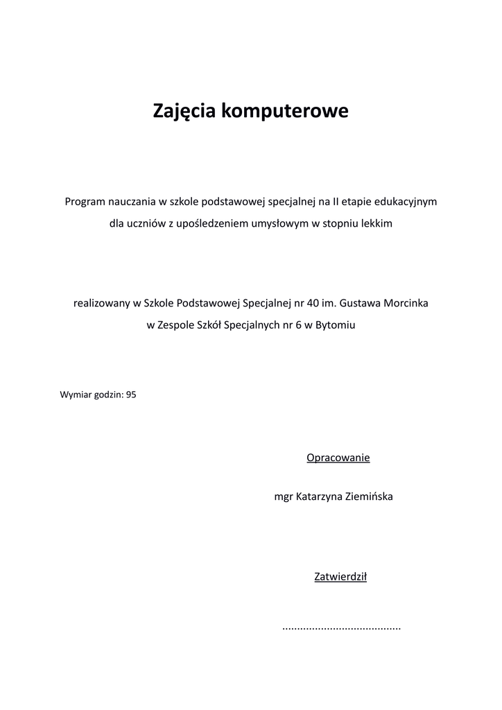 Zajęcia komputerowe Program nauczania w szkole podstawowej specjalnej na II etapie edukacyjnym dla uczniów z upośledzeniem umysłowym w stopniu lekkim realizowany w Szkole Podstawowej Specjalnej nr 40 im. Gustawa Morcinka w Zespole Szkół Specjalnych nr 6 w Bytomiu Wymiar godzin: 95 Opracowanie mgr Katarzyna Ziemińska Zatwierdził ........................................ Spis treści 1. Wstęp 3 2. Szczegółowe cele kształcenia i wychowania 4 3. Treści edukacyjne 5 4. Zaplanowane treści nauczania 8 5. Sposoby osiągania celów kształcenia i wychowania 11 6. Opis założonych osiągnięć ucznia 14 7. Propozycje kryteriów oceny i metod sprawdzania osiągnięć ucznia 15 2 1. Wstęp Najważniejszym zadaniem dzisiejszej szkoły jest zapewnienie uczniom wszechstronnego rozwoju, co powinno ułatwić im kontynuowanie nauki w gimnazjum, a także umożliwić dokonanie wyboru dalszej drogi kształcenia. Program nauczania został opracowany w oparciu o podstawę programową kształcenia ogólnego zawartą w rozporządzeniu Ministra Edukacji Narodowej z dnia 27 sierpnia 2012 r. (Dz. U. 2012 poz. 977 z późn. zm.). W programie znajdują się zagadnienia związane z wychowaniem: przestrzeganie zasad bezpiecznej i zdrowej pracy przy komputerze oraz zasad poszanowania mienia, zagrożenia wynikające z korzystania z niewłaściwych gier (wirtualna rzeczywistość, wielokrotne życie, przemoc, elementy okrucieństwa), etyczne zachowanie w Sieci (korzystanie z Internetu i poczty elektronicznej zgodnie z zasadami netykiety) czy świadome korzystanie z Internetu. Duży nacisk kładzie się na indywidualizację procesu nauczania. Konieczne jest dostosowanie wymagań do indywidualnych możliwości ucznia w szkole specjalnej. 3 2. Szczegółowe cele kształcenia i wychowania Cele kształcenia Uczeń: przestrzega podstawowe zasady bezpiecznej i higienicznej pracy przy komputerze, rozumie i wyjaśnia zagrożenia wynikające z niewłaściwego korzystania z komputera, zna różnorodność zastosowań komputerów oraz urządzeń peryferyjnych podłączanych do jednostki centralnej, zna budowę wewnętrzną jednostki centralnej oraz podstawową zasadę jej działania, prawidłowo podłącza do jednostki centralnej podstawowe, popularne urządzenia peryferyjne (drukarkę, skaner, myszkę, klawiaturę, monitor itp.), zna różne systemy operacyjne, posługuje się wybranym systemem operacyjnym w zakresie prawidłowego uruchamiania i wyłączania, a także uruchamiania programów w nim zainstalowanych oraz podstawowych operacji na plikach i folderach, porządkuje dane, posługuje się prostym programem graficznym, realizując zadania w różnych projektach, posługuje się wybranym programem do porządkowania i obróbki cyfrowych fotografii, posługuje się w podstawowym zakresie kilkoma edytorami tekstu, zarówno tym najprostszym, jak i zaawansowanym, zna wybrany program do tworzenia prezentacji i posługuje się nim, realizując pokazy w różnych projektach, wie, czym jest lokalna i globalna (internet) sieć komputerowa, zna wybrane urządzenia i pojęcia związane z siecią komputerową, opisuje przykłady wykorzystania komputera i internetu w życiu codziennym, posługuje się usługami w sieci internet do zdobywania i poszerzania wiedzy oraz do realizacji szkolnych zadań na innych przedmiotach nauczania, jak również do realizacji wybranych przez siebie zadań, zna arkusz kalkulacyjny i posługuje się nim w podstawowym zakresie, wykorzystując do zadań obliczeniowych również na innych przedmiotach nauczania, tworzy proste motywy lub steruje obiektem na ekranie za pomocą ciągu poleceń. Cele wychowania Uczeń: szanuje cudze pomysły i prace, podejmuje inicjatywy, myśli samodzielnie, broni swojego punktu widzenia, pomysłu na forum grupy, potrafi przyjąć i uwzględnić uwagi lub krytykę innych członków zespołu, 4 przestrzega zasady etyczne i prawne związane z korzystaniem z komputera i internetu, realizuje wspólnie wypracowany przez klasę/grupę pomysł, projekt. Ważnym aspektem jest przestrzeganie zasad bezpiecznej i zdrowej pracy przy komputerze oraz zasad poszanowania mienia, zagrożenia wynikające z korzystania z niewłaściwych gier (wirtualna rzeczywistość, wielokrotne życie, przemoc, elementy okrucieństwa), etyczne zachowanie w sieci (korzystanie z Internetu i poczty elektronicznej zgodnie z zasadami netykiety) czy świadome korzystanie z Internetu (niekorzystanie ze stron nieprzeznaczonych dla dzieci). Jest to zagadnienie szczególnie ważne w pracy z dziećmi ze szczególnymi potrzebami edukacyjnymi wynikającymi ze specyfiki ucznia niepełnosprawnego umysłowo. 3. Treści edukacyjne 1. Bezpieczne posługiwanie się komputerem i jego oprogramowaniem: a) omówienie wszelkich zagrożeń zdrowia związanych z pracą, nauką i zabawą na komputerze, także zasad właściwej obsługi, wyjaśnienie podstawowych zasad bezpiecznej i higienicznej pracy przy komputerze, wyjaśnienie zagrożeń wynikających z niewłaściwego korzystania z komputera, b) przedstawienie rodzajów komputerów i ich różnorodnego zastosowania, c) podział urządzeń peryferyjnych na wejściowe, wyjściowe i wejściowo-wyjściowe z wytłumaczeniem kryteriów tego podziału, d) praktyczna wiedza na temat gniazd komputera, podłączenie urządzeń peryferyjnych i uruchomienie zestawu komputerowego, e) omówienie podzespołów jednostki centralnej i ich funkcji, f) zapoznanie uczniów z takimi pojęciami, jak: system operacyjny, BIOS, plik, folder, ikona, skrót, rozszerzenie pliku, drzewo folderów, g) omówienie sposobów korzystania z pomocy dostępnej w programach komputerowych, h) zaprezentowanie form licencji programów i ich oznakowania, omówienie skutków łamania prawa autorskiego, i) zapoznanie uczniów z potrzebą wykonywania kopii zapasowych ważnych danych oraz ze sposobami ich tworzenia. 1. Komunikowanie się za pomocą komputera i technologii informacyjno-komunikacyjnych: a) omówienie poj