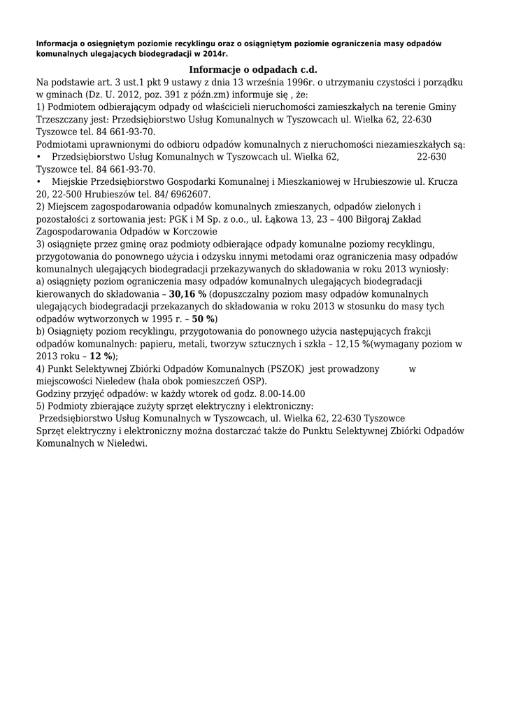 Informacja o osięgniętym poziomie recyklingu oraz o osiągniętym poziomie ograniczenia masy odpadów komunalnych ulegających biodegradacji w 2014r. Informacje o odpadach c.d. Na podstawie art. 3 ust.1 pkt 9 ustawy z dnia 13 września 1996r. o utrzymaniu czystości i porządku w gminach (Dz. U. 2012, poz. 391 z późn.zm) informuje się , że: 1) Podmiotem odbierającym odpady od właścicieli nieruchomości zamieszkałych na terenie Gminy Trzeszczany jest: Przedsiębiorstwo Usług Komunalnych w Tyszowcach ul. Wielka 62, 22-630 Tyszowce tel. 84 661-93-70. Podmiotami uprawnionymi do odbioru odpadów komunalnych z nieruchomości niezamieszkałych są: • Przedsiębiorstwo Usług Komunalnych w Tyszowcach ul. Wielka 62, 22-630 Tyszowce tel. 84 661-93-70. • Miejskie Przedsiębiorstwo Gospodarki Komunalnej i Mieszkaniowej w Hrubieszowie ul. Krucza 20, 22-500 Hrubieszów tel. 84/ 6962607. 2) Miejscem zagospodarowania odpadów komunalnych zmieszanych, odpadów zielonych i pozostałości z sortowania jest: PGK i M Sp. z o.o., ul. Łąkowa 13, 23 – 400 Biłgoraj Zakład Zagospodarowania Odpadów w Korczowie 3) osiągnięte przez gminę oraz podmioty odbierające odpady komunalne poziomy recyklingu, przygotowania do ponownego użycia i odzysku innymi metodami oraz ograniczenia masy odpadów komunalnych ulegających biodegradacji przekazywanych do składowania w roku 2013 wyniosły: a) osiągnięty poziom ograniczenia masy odpadów komunalnych ulegających biodegradacji kierowanych do składowania – 30,16 % (dopuszczalny poziom masy odpadów komunalnych ulegających biodegradacji przekazanych do składowania w roku 2013 w stosunku do masy tych odpadów wytworzonych w 1995 r. – 50 %) b) Osiągnięty poziom recyklingu, przygotowania do ponownego użycia następujących frakcji odpadów komunalnych: papieru, metali, tworzyw sztucznych i szkła – 12,15 %(wymagany poziom w 2013 roku – 12 %); 4) Punkt Selektywnej Zbiórki Odpadów Komunalnych (PSZOK) jest prowadzony w miejscowości Nieledew (hala obok pomieszczeń OSP). Godziny przyjęć odpadów: w każdy wtorek od godz. 8.00-14.00 5) Podmioty zbierające zużyty sprzęt elektryczny i elektroniczny: Przedsiębiorstwo Usług Komunalnych w Tyszowcach, ul. Wielka 62, 22-630 Tyszowce Sprzęt elektryczny i elektroniczny można dostarczać także do Punktu Selektywnej Zbiórki Odpadów Komunalnych w Nieledwi.