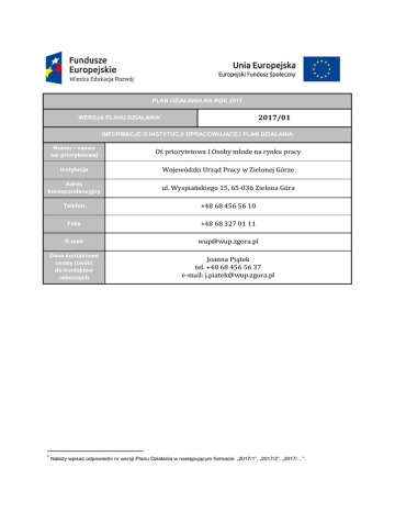 PLAN DZIAŁANIA NA ROK 2017 WERSJA PLANU DZIAŁANIA 2017/01 1 INFORMACJE O INSTYTUCJI OPRACOWUJĄCEJ PLAN DZIAŁANIA Numer i nazwa osi priorytetowej Oś priorytetowa I Osoby młode na rynku pracy Instytucja Wojewódzki Urząd Pracy w Zielonej Górze Adres korespondencyjny ul. Wyspiańskiego 15, 65-036 Zielona Góra Telefon +48 68 456 56 10 Faks +48 68 327 01 11 E-mail [email protected] Dane kontaktowe osoby (osób) do kontaktów roboczych Joanna Piątek tel. +48 68 456 56 37 e-mail: [email protected] 1 Należy wpisać odpowiedni nr wersji Planu Działania w następującym formacie: „2017/1”, „2017/2”, „2017/…”. Działanie 1.2: Wsparcie osób młodych pozostających bez pracy na regionalnym rynku pracy – projekty konkursowe DZIAŁANIE/PODDZIAŁANIE PO WER Poddziałanie 1.2.1: Wsparcie udzielane z Europejskiego Funduszu Społecznego FISZKA KONKURSU PODSTAWOWE INFORMACJE O KONKURSIE Cel szczegółowy PO WER, w ramach którego realizowane 2 będą projekty Zwiększenie możliwości zatrudnienia osób młodych do 29 roku życia bez pracy, w tym w szczególności osób, które nie uczestniczą w kształceniu i szkoleniu (tzw. młodzież NEET). Priorytet inwestycyjny 8ii Trwała integracja na rynku pracy ludzi młodych, w szczególności tych, którzy nie pracują, nie kształcą się ani nie szkolą, w tym ludzi młodych, zagrożonych wykluczeniem społecznym i ludzi młodych wywodzących się ze środowisk marginalizowanych także poprzez wdrażanie Gwarancji dla młodzieży. Lp. konkursu Planowany miesiąc rozpoczęcia naboru wniosków o 3 dofinansowanie Czy w ramach konkursu będą wybierane projekty grantowe? Planowana alokacja (PLN) 3 1 Planowany kwartał ogłoszenia konkursu 2 3 4 I X II 5 6 7 TAK III 8 NIE 9 IV 10 11 12 X 12 548 100,00 Wymagany wkład własny beneficjenta 2 W przypadku konkursów na projekty koncepcyjne w wierszu Cel szczegółowy, w ramach którego realizowane będą projekty należy opisać również zasadnicze założenia interwencji publicznej, której wsparcie zaplanowano poprzez realizację projektów, które mają zostać wybrane w ramach konkursu. W przypadku konkursów na projekty innowacyjne i współpracy ponadnarodowej w wierszu Cel szczegółowy, w ramach którego realizowane będą projekty należy uwzględnić również temat/tematy, w ramach których projekty będą wybierane. 3 Zaznaczyć właściwe pole z nr. miesiąca znakiem „X”, uwzględniając fakt, że zgodnie z art. 47 ust. 3 ustawy z dnia 11 lipca 2014 r. o zasadach realizacji programów w zakresie polityki spójności finansowanych w perspektywie finansowej 2014–2020 (Dz.U. z 2016 r. poz. 217) aktualizacja harmonogramu naborów wniosków o dofinansowanie nie może dotyczyć naboru, którego przeprowadzenie zaplanowano w terminie nie dłuższym niż 3 miesiące, licząc od dnia aktualizacji. Natomiast zgodnie z podrozdziałem 7.2 pkt 6 Wytycznych w zakresie trybu wyboru projektów na lata 2014-2020 dniem aktualizacji harmonogramu jest dzień jego publikacji na stronie internetowej IZ PO WER oraz na portalu internetowym, o którym mowa w art. 115 ust. 1 lit. b rozporządzenia ogólnego. 2 TAK X NIE Minimalny udział wkładu własnego w finansowaniu wydatków kwalifikowalnych projektu 5,00 % Wsparcie indywidualnej i kompleksowej aktywizacji zawodowo-edukacyjnej osób młodych (bezrobotnych, biernych zawodowo oraz poszukujących pracy, w tym w szczególności osób niezarejestrowanych w urzędzie pracy) poprzez: 1. Typ/typy projektów przewidziane do realizacji w ramach konkursu Instrumenty i usługi rynku pracy służące indywidualizacji wsparcia oraz pomocy w zakresie określenia ścieżki zawodowej (obligatoryjne): identyfikacja potrzeb osób młodych pozostających bez zatrudnienia oraz diagnozowanie możliwości w zakresie doskonalenia zawodowego, w tym identyfikacja stopnia oddalenia od rynku pracy osób młodych, kompleksowe i indywidualne pośrednictwo pracy w zakresie wyboru zawodu zgodnego z kwalifikacjami i kompetencjami wspieranej osoby lub poradnictwo zawodowe w zakresie planowania rozwoju kariery zawodowej, w tym podnoszenia lub uzupełniania kompetencji i kwalifikacji zawodowych. 2. Instrumenty i usługi rynku pracy skierowane do osób, które przedwcześnie opuszczają system edukacji lub osób, u których zidentyfikowano potrzebę uzupełnienia lub zdobycia nowych umiejętności i kompetencji: kontynuacja nauki dla osób młodych, u których zdiagnozowano potrzebę uzupełnienia edukacji formalnej lub potrzebę potwierdzenia kwalifikacji m.in. poprzez odpowiednie egzaminy, nabywanie, podwyższanie lub dostosowywanie kompetencji i kwalifikacji, niezbędnych na rynku pracy w kontekście zidentyfikowanych potrzeb osoby, której udzielane jest wsparcie, m.in. poprzez wysokiej jakości szkolenia. 3. Instrumenty i usługi rynku pracy służące zdobyciu doświadczenia zawodowego wymaganego przez pracodawców: nabywanie lub uzupełnianie doświadczenia zawodowego oraz praktycznych umiejętności w zakresie wykonywania danego zawodu, m.in. poprzez staże i praktyki, spełniające standardy wskazane w Europejskich Ramach Jakości Praktyk i Staży, wsparcie zatrudnienia osoby młodej u przedsiębiorcy lub innego pracodawcy, stanowiące zachętę do zatrudnienia, m.in. poprzez pokrycie kosztów subsydiowania zatrudnienia dla osób, u których zidentyfikowano adekwatność tej formy wsparcia, refundację wyposażenia lub doposażenia stanowiska pracy (wyłącznie w połączeniu z subsydiowanym zatrudnieniem). 4. Instrumenty i usługi rynku pracy służące wsparciu mobilności międzysektorowej i geograficznej (uwzględniając mobilność zawodową na europejskim rynku pracy za pośrednictwem sieci EURES): wsparcie mobilności międzysektorowej dla osób, które mają trudności ze znalezieniem zatrudnienia w sektorze lub branży, m.in. poprzez zmianę lub uzupełnienie kompetencji lub kwalifikacji pozwalających na podjęcie zatrudnienia w innym sektorze, min. poprzez p