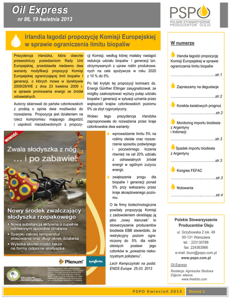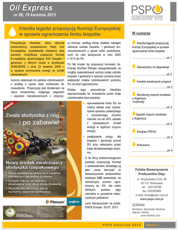 Oil Express nr 86, 19 kwietnia 2013 Irlandia łagodzi propozycję Komisji Europejskiej w sprawie ograniczenia limitu biopaliw Prezydencja irlandzka, która obecnie przewodniczy posiedzeniom Rady Unii Europejskiej, przedstawiła niedawno dwa warianty modyfikacji propozycji Komisji Europejskiej ograniczającej limit biopaliw I generacji, o których mowa w dyrektywie 2009/28/WE z dnia 23 kwietnia 2009 r. w sprawie promowania energii ze źródeł odnawialnych. cji Komisji, według której miałaby nastąpić redukcja udziału biopaliw I generacji tzn. otrzymywanych z upraw roślin produkowanych na cele spoŜywcze w roku 2020 z 10 % do 5%. Po fali krytyki tej propozycji komisarz ds. Energii Günther Ettinger zasygnalizował, ze mógłby zaakceptować wyŜszy pułap udziału biopaliw I generacji w sytuacji uznania przez Autorzy skierowali do państw członkowskich większość krajów członkowskich poziomu z prośbą o opinie dwie moŜliwości do 5% za zbyt rygorystyczny. rozwaŜenia. Propozycja jest działaniem na Wobec tego prezydencja irlandzka rzecz kompromisu mającego złagodzić zaproponowała do rozwaŜenia przez kraje i uspokoić niezadowolonych z propozyczłonkowskie dwa warianty: wprowadzenie limitu 5% na rośliny oleiste oraz rozszerzenie sposobu podwójnego i poczwórnego liczenia równieŜ na cel 20% udziału z odnawialnych źródeł energii w ogólnym zuŜyciu energii, zwiększenie progu dla biopaliw I generacji ponad 5% przy wskazaniu przez kraje akceptowanego poziomu. O ile firmy biotechnologiczne powitały propozycję Komisji z zadowoleniem określając ją jako „nowy kierunek” to stowarzyszenie producentów biodiesla EBB stwierdziło, Ŝe restrykcyjny poziom ograniczony do 5% dla roślin oleistych postawi jego członków w „powaŜnie niekorzystnym połoŜeniu”. Lech Kempczyński na podst. ENDS Europe 25.03. 2013 W numerze Irlandia łagodzi propozycję Komisji Europejskiej w sprawie ograniczenia limitu biopaliw …………..…………….….......str.1 Zapraszamy na degustacje …………..…………….….......str.2 Korekta światowych prognoz ………………..……...………..str.2 Monitoring importu biodiesla z Argentyny i Indonezji …………..…………….….......str.3 Spadek importu biodiesla z Argentyny ……………....……...………...str.3 Kongres FEFAC ………………..……...………..str.3 Notowania ………………..……...………..str.4 Polskie Stowarzyszenie Producentów Oleju ul. Grzybowska 2 lok. 49 00-131 Warszawa tel. : 223130788 fax: 224363966 e-mail: [email protected] www.pspo.com.pl Oil Express Redakcja: Agnieszka Słodowa Zdjęcia: własne, www.freefoto.com PSPO Kwiecień 2013 Strona 1 Oil Express Zapraszamy na degustacje Zapraszamy serdecznie dziś od 14.00 i jutro od 9.00 (19 i 20 kwietnia) na degustacje sałatki z olejem rzepakowym, które odbędą się w hipermarketach Tesco. Gdańsk, ul. Cienista 30 Gorzów Wielkopolski, ul. Górczyńska 19 Kalisz, al. Wojska Polskiego 2 Kraków, ul. Kapelanka 54 W trakcie akcji promocyjnej przeprowadzanej w ramach kampanii "Pokochaj olej rzepakowy" zostanie takŜe rozdystrybuowana broszura z przepisami objaśniającej teŜ właściwości oleju. Łódź Bałuty, ul. Pojezierska 93 Lista marketów Tesco biorących udział w akcji podczas tego weekendu: Puławy, ul. Dęblińska 18D Bielsko-Biała, ul. Warszawska 180 Wrocław, ul. Czekoladowa 11 Bydgoszcz, ul. Toruńska 101 Lublin, ul. Orkana 4 Opole, ul. Ozimska 72 Poznań, ul. Mrągowska 4 Szczecin, ul. Milczańska 31F Warszawa, ul. Fieldorfa 37 Warszawa, AL. Ken 14 Agnieszka Słodowa Korekta światowych prognoz Na skutek poprawy prognoz globalnej produkcji soi, rzepaku oraz słonecznika USDA dokonało korekty globalnych zbiorów oleistych w sezonie 2012/13. Zgodnie z nowymi szacunkami produkcja oleistych będzie na poziomie około 468,8 mln ton, tj. o 2 mln ton więcej niŜ zakładano miesiąc wcześniej. Wzrosły prognozy zbiorów soi dla Paragwaju (o 0,6 mln ton do 8,4 mln ton dzięki większym plonom), Urugwaju (dzięki większym plonom na większym niŜ zakładano areale) oraz południowej Brazylii. Bilans soi na świecie 2012/2013 (mln ton) Zapasy Zapasy Produkcja Import Przerób SpoŜycie Eksport począt. końcowe Brazylia 12,97 83,50 0,21 35,55 38,70 36,75 21,23 USA 4,61 82,06 0,54 44,50 47,08 36,74 3,39 Argentyna 18,10 51,50 0,00 35,20 36,85 10,35 22,40 Chiny 15,92 12,60 61,00 65,65 76,83 0,30 12,39 UE27 0,70 0,95 11,80 11,95 12,85 0,06 0,54 Japonia 0,15 0,22 2,75 1,89 2,92 0,00 0,20 Meksyk 0,08 0,20 3,35 3,57 3,79 0,00 0,04 Świat 55,13 269,63 96,48 230,35 259,75 97,86 62,63 Źródło: WASDE Ponadto, USDA zwiększyło prognozy Spodziewany mniejszy eksport produkcji rzepaku w UE27 oraz produkcji z Argentyny, Brazylii i Paragwaju nie słonecznika w Chinach. zostanie zrekompensowany wzrostem Światowy handel oleistymi w 2012/13 eksportu Urugwaju i USA. Zredukowany szacowany jest na poziomie 114,4 mln został takŜe chiński import soi ton. W porównaniu do wcześniejszych o 2 mln ton do 61 mln ton ze względu prognoz został on zmniejszony o 1,4 mln na mniejszy niŜ zakładano import w pierwszej połowie roku kalendarzoton głównie przez redukcję wielkości wego. Zwiększone zaś zostały prognozy handlu soją. importu dla Egiptu, UE27, Meksyku i Wietnamu. Światowe zapasy końcowe soi zostały oszacowane na poziomie 62,6 mln ton. Pełny raport dostępny jest na stronie: www.usda.gov/oce/commodity/ wasde/latest.pdf Agnieszka Słodowa na podst. USDA, FAMMU/FAPA PSPO Kwiecień 2013 Strona 2 Oil Express Monitoring importu biodiesla z Argentyny i Indonezji Komisja rozporządzeniem WE/330/2013 z 10 kwietnia 2013 roku podjęła decyzję o rejestracji przywozu biodiesla pochodzącego z Argentyny i Indonezji. Komisja posiada wystarczające dowody, iŜ przywóz produktu objętego postępowaniem w tych państwach jest subsydiowany. Wniosek do Komisji o wszczęcie śledztwa złoŜyła organizacja euroDecyzja o monitoro