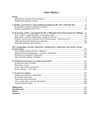 SPIS TREŚCI Wstęp .............................................................................................................................................. 7 Świadomość zjawiska przestrzenności....................................................................................... 9 Między przestrzenią a czasem .................................................................................................. 14 I. Rzeźba a przestrzeń w sztuce polskiej przełomu lat 50. i 60.: rodowód i idee ................... 27 Rzeźba jako narzędzie badania przestrzeni .............................................................................. 27 Rzeźba na przełomie lat 50. i 60 .............................................................................................. 60 II. Koncepcje rzeźby w początkach lat 60. a I Biennale Form Przestrzennych w Elblągu... 83 Nowa rzeźba w opinii krytyków i teoretyków sztuki ............................................................... 83 Rola rzeźby w polityce kulturalnej a działania twórców.......................................................... 95 Podstawy teoretyczne: Biennale Form Przestrzennych - Konfrontacje 65 ............................ 115 I Biennale Form Przestrzennych: realizacje ........................................................................... 126 Znaczenie Biennale: głosy krytyki ......................................................................................... 139 III. I Sympozjum Artystów Plastyków i Naukowców w Puławach: nowe formy wyrazu artystycznego ............................................................................................................................. 153 Nowe relacje między dziełem a odbiorcą............................................................................... 153 Założenia ideowe Sympozjum - wystawa i seminarium ........................................................ 166 Realizacje uczestników Sympozjum ...................................................................................... 179 Głosy krytyki, dyskusje, działania ......................................................................................... 204 IV. Rzeźba przestrzenna czy sztuka przestrzeni? .................................................................. 214 Wydarzenia audio-wizualne .................................................................................................. 214 Przestrzeń i wyraz .................................................................................................................. 229 Formy aktywizujące przestrzeń .............................................................................................. 242 Koniec dekady — rok 1968 ................................................................................................... 253 V. Przestrzeń i miejsce .............................................................................................................. 274 Definicja przestrzeni rzeźbiarskiej ......................................................................................... 274 Kreowanie przestrzeni ............................................................................................................ 277 Etapy kreowania przestrzeni .................................................................................................. 288 Nowa rzeźba jako wyzwanie dla krytyki ............................................................................... 289 Uwagi podsumowujące .......................................................................................................... 302 Bibliografia ................................................................................................................................ 319 Spis ilustracji.............................................................................................................................. 392 Indeks ......................................................................................................................................... 396 Summary .................................................................................................................................... 408