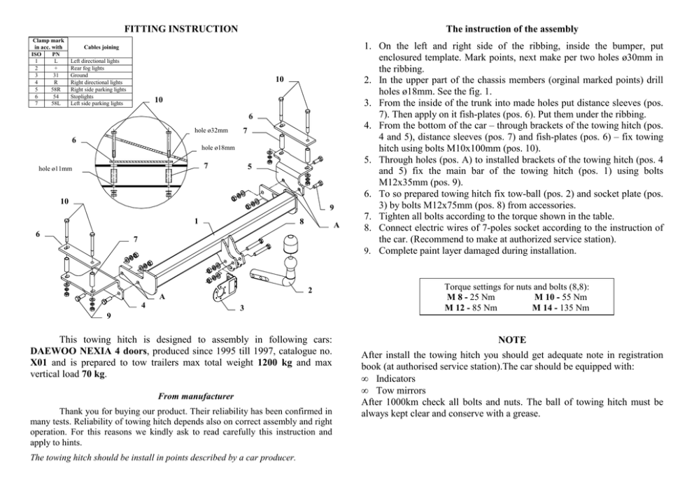 FITTING INSTRUCTION Clamp mark in acc. with ISO PN 1 L 2 + 3 31 4 R 5 58R 6 54 7 58L The instruction of the assembly Cables joining Left directional lights Rear fog lights Ground Right directional lights Right side parking lights Stoplights Left side parking lights 10 10 6 hole ø32mm 7 6 hole ø18mm 7 hole ø11mm 5 10 9 1 6 8 A 7 2 A 4 3 1. On the left and right side of the ribbing, inside the bumper, put enclosured template. Mark points, next make per two holes ø30mm in the ribbing. 2. In the upper part of the chassis members (orginal marked points) drill holes ø18mm. See the fig. 1. 3. From the inside of the trunk into made holes put distance sleeves (pos. 7). Then apply on it fish-plates (pos. 6). Put them under the ribbing. 4. From the bottom of the car – through brackets of the towing hitch (pos. 4 and 5), distance sleeves (pos. 7) and fish-plates (pos. 6) – fix towing hitch using bolts M10x100mm (pos. 10). 5. Through holes (pos. A) to installed brackets of the towing hitch (pos. 4 and 5) fix the main bar of the towing hitch (pos. 1) using bolts M12x35mm (pos. 9). 6. To so prepared towing hitch fix tow-ball (pos. 2) and socket plate (pos. 3) by bolts M12x75mm (pos. 8) from accessories. 7. Tighten all bolts according to the torque shown in the table. 8. Connect electric wires of 7-poles socket according to the instruction of the car. (Recommend to make at authorized service station). 9. Complete paint layer damaged during installation. Torque settings for nuts and bolts (8,8): M 8 - 25 Nm M 10 - 55 Nm M 12 - 85 Nm M 14 - 135 Nm 9 This towing hitch is designed to assembly in following cars: DAEWOO NEXIA 4 doors, produced since 1995 till 1997, catalogue no. X01 and is prepared to tow trailers max total weight 1200 kg and max vertical load 70 kg. From manufacturer Thank you for buying our product. Their reliability has been confirmed in many tests. Reliability of towing hitch depends also on correct assembly and right operation. For this reasons we kindly ask to read carefully this instruction and apply to hints. The towing hitch should be install in points described by a car producer. NOTE After install the towing hitch you should get adequate note in registration book (at authorised service station).The car should be equipped with: • Indicators • Tow mirrors After 1000km check all bolts and nuts. The ball of towing hitch must be always kept clear and conserve with a grease. PPUH AUTO-HAK S.J. Towing hitch accessories: Produkcja Haków Holowniczych Henryk & Zbigniew Nejman 76-200 SŁUPSK ul. Słoneczna 16K tel/fax (059) 8-414-414; 8-414-413 e-mail: [email protected] www. autohak.com.pl Towing hitch (without electrical set) Class: A50-X Cat. no. X01 Technical data: D-value: 6,82 kN maximum trailer weight: 1200 kg maximum vertical cup load: 70 kg Designed for: Manufacturer: DAEWOO Model: NEXIA Type: 4 doors produced since 1995 till 1997 Approval number according to Directive 94/20/EC: e20*94/20*0327*00 Foreword This towing hitch is designed according to rules of safety traffic regulations. The towing hitch is a safety component and can be install only by qualified personnel. Any alteration or conversion of the towing hitch is prohibited and would lead to cancellation of design certification. Remove insulating compound and underseal from vehicle (if present) in the area of the matting surfaces of the towing hitch. The vehicle manufacturer’s specifications regarding trailer load and max. vertical cup load are decisive for driving and values for the towing hitch cannot be exceeded. D-value formula: Max trailer weight [kg] x Max vehicle weight [kg] Max trailer weight [kg] + Max vehicle weight [kg] X 9,81 = 1000 D [kN] Oznaczenie zacisku wg ISO PN 1 L 2 + 3 31 4 R 5 58R 6 54 7 58L INSTRUKCJA montaŜu i eksploatacji zaczepu kulowego Łączenie przewodów Kierunkowskazy lewe Tylne światła przeciwmgłowe Masa Kierunkowskazy prawe Światła pozycyjne prawe Światła hamowania Światła pozycyjne lewe Kolejność czynności przy montaŜu 10 10 6 otwór ø32mm 7 6 otwór ø18mm 7 otwór ø11mm 5 10 9 1 6 8 A 7 2 A 4 3 9 Zaczep kulowy przeznaczony jest do zamontowania w samochodzie: DAEWOO NEXIA 4 drz., produkowanym od 1995r. do 1997r., numer katalogowy X01 i słuŜy do ciągnięcia przyczep o masie całkowitej 1200 kg i nacisku na kulę max 70 kg. OD PRODUCENTA Dziękujemy za wybór produkowanego przez naszą firmę zaczepu kulowego. Jego niezawodność została potwierdzona licznymi testami oraz opiniami zadowolonych klientów. JednakŜe niezawodność zaczepów kulowych jest zaleŜna równieŜ od prawidłowego montaŜu oraz prawidłowej eksploatacji. Z tego powodu prosimy Państwa o staranne przeczytanie niniejszej instrukcji montaŜu oraz przestrzeganie zawartych wskazówek. Zaczep naleŜy zamontować w miejscach do tego celu przeznaczonych przez producenta samochodu. 1. Wewnątrz bagaŜnika po lewej i prawej stronie uŜebrowania przyłoŜyć załączony szablon i odtrasować punkty, a następnie wykonać po dwa otwory o średnicy ø30mm w uŜebrowaniu. 2. W górnej części podłuŜnic w miejscach fabrycznie napunktowanych wykonać otwory ø18mm (patrz rysunek). 3. Od wewnątrz bagaŜnika w wykonane otwory włoŜyć tulejki dystansowe (poz. 7), a następnie przyłoŜyć na nie, pod uŜebrowanie, nakładki (poz. 6 - patrz rysunek). 4. Od spodu samochodu poprzez wsporniki zaczepu (poz. 4 i 5), tulejki dystansowe (poz. 7) i nakładki (poz. 6) skręcić śrubami M10x100mm (poz. 10). 5. Do zamontowanych wsporników zaczepu (poz. 4 i 5) przykręcić śrubami M12x35mm (poz. 9) poprzez otwory (poz. A) belkę główną zaczepu (poz. 1). 6. Do tak przygotowanego zaczepu przykręcić część kulistą (poz. 2) wraz z blachą pod gniazdo (poz. 3) śrubami M12x75mm (poz. 8) z wyposaŜenia. 7. Dokręcić wszystkie śruby z momentem jak pokazano w tabeli. 8. Podłączyć przewody gniazdka 7 - bieg. do instalacji elektrycznej zgodnie z instrukcją fabryczną samochodu (zaleca się wykonanie w AS