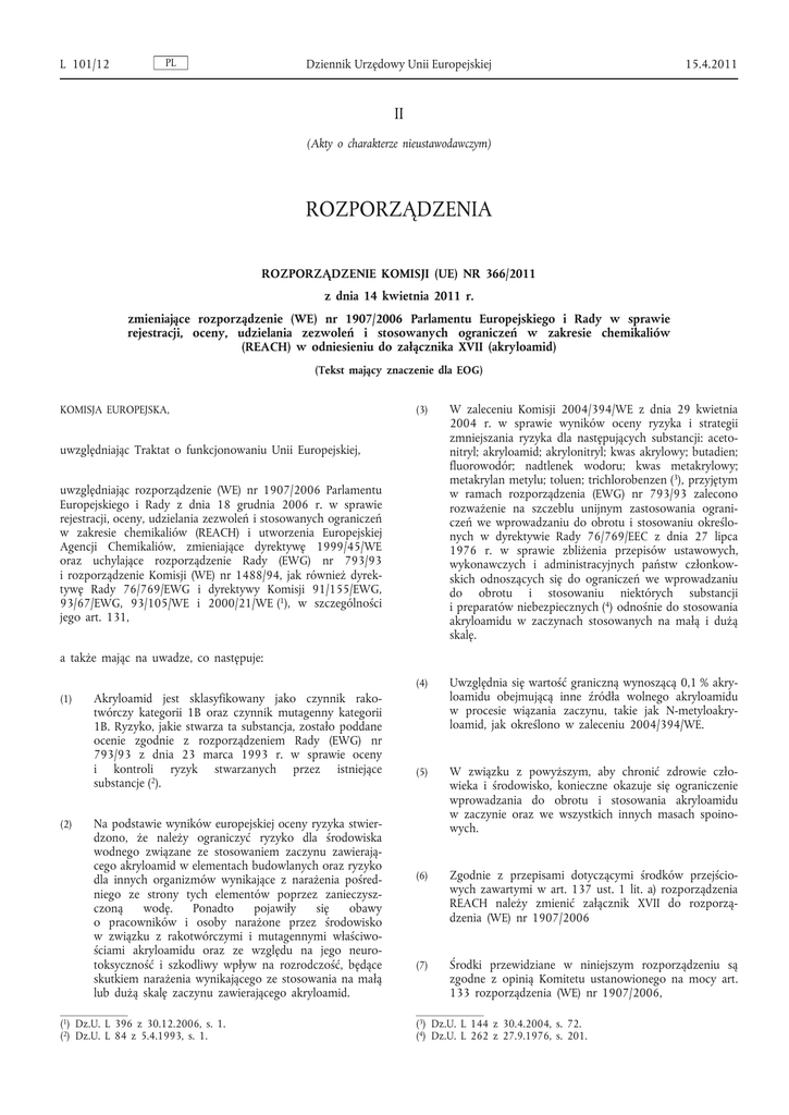 L 101/12 PL Dziennik Urzędowy Unii Europejskiej 15.4.2011 II (Akty o charakterze nieustawodawczym) ROZPORZĄDZENIA ROZPORZĄDZENIE KOMISJI (UE) NR 366/2011 z dnia 14 kwietnia 2011 r. zmieniające rozporządzenie (WE) nr 1907/2006 Parlamentu Europejskiego i Rady w sprawie rejestracji, oceny, udzielania zezwoleń i stosowanych ograniczeń w zakresie chemikaliów (REACH) w odniesieniu do załącznika XVII (akryloamid) (Tekst mający znaczenie dla EOG) KOMISJA EUROPEJSKA, (3) W zaleceniu Komisji 2004/394/WE z dnia 29 kwietnia 2004 r. w sprawie wyników oceny ryzyka i strategii zmniejszania ryzyka dla następujących substancji: aceto nitryl; akryloamid; akrylonitryl; kwas akrylowy; butadien; fluorowodór; nadtlenek wodoru; kwas metakrylowy; metakrylan metylu; toluen; trichlorobenzen (3), przyjętym w ramach rozporządzenia (EWG) nr 793/93 zalecono rozważenie na szczeblu unijnym zastosowania ograni czeń we wprowadzaniu do obrotu i stosowaniu określo nych w dyrektywie Rady 76/769/EEC z dnia 27 lipca 1976 r. w sprawie zbliżenia przepisów ustawowych, wykonawczych i administracyjnych państw członkow skich odnoszących się do ograniczeń we wprowadzaniu do obrotu i stosowaniu niektórych substancji i preparatów niebezpiecznych (4) odnośnie do stosowania akryloamidu w zaczynach stosowanych na małą i dużą skalę. (4) Uwzględnia się wartość graniczną wynoszącą 0,1 % akry loamidu obejmującą inne źródła wolnego akryloamidu w procesie wiązania zaczynu, takie jak N-metyloakry loamid, jak określono w zaleceniu 2004/394/WE. (5) W związku z powyższym, aby chronić zdrowie czło wieka i środowisko, konieczne okazuje się ograniczenie wprowadzania do obrotu i stosowania akryloamidu w zaczynie oraz we wszystkich innych masach spoino wych. (6) Zgodnie z przepisami dotyczącymi środków przejścio wych zawartymi w art. 137 ust. 1 lit. a) rozporządzenia REACH należy zmienić załącznik XVII do rozporzą dzenia (WE) nr 1907/2006 (7) Środki przewidziane w niniejszym rozporządzeniu są zgodne z opinią Komitetu ustanowionego na mocy art. 133 rozporządzenia (WE) nr 1907/2006, uwzględniając Traktat o funkcjonowaniu Unii Europejskiej, uwzględniając rozporządzenie (WE) nr 1907/2006 Parlamentu Europejskiego i Rady z dnia 18 grudnia 2006 r. w sprawie rejestracji, oceny, udzielania zezwoleń i stosowanych ograniczeń w zakresie chemikaliów (REACH) i utworzenia Europejskiej Agencji Chemikaliów, zmieniające dyrektywę 1999/45/WE oraz uchylające rozporządzenie Rady (EWG) nr 793/93 i rozporządzenie Komisji (WE) nr 1488/94, jak również dyrek tywę Rady 76/769/EWG i dyrektywy Komisji 91/155/EWG, 93/67/EWG, 93/105/WE i 2000/21/WE (1), w szczególności jego art. 131, a także mając na uwadze, co następuje: (1) (2) Akryloamid jest sklasyfikowany jako czynnik rako twórczy kategorii 1B oraz czynnik mutagenny kategorii 1B. Ryzyko, jakie stwarza ta substancja, zostało poddane ocenie zgodnie z rozporządzeniem Rady (EWG) nr 793/93 z dnia 23 marca 1993 r. w sprawie oceny i kontroli ryzyk stwarzanych przez istniejące substancje (2). Na podstawie wyników europejskiej oceny ryzyka stwier dzono, że należy ograniczyć ryzyko dla środowiska wodnego związane ze stosowaniem zaczynu zawierają cego akryloamid w elementach budowlanych oraz ryzyko dla innych organizmów wynikające z narażenia pośred niego ze strony tych elementów poprzez zanieczysz czoną wodę. Ponadto pojawiły się obawy o pracowników i osoby narażone przez środowisko w związku z rakotwórczymi i mutagennymi właściwo ściami akryloamidu oraz ze względu na jego neurotoksyczność i szkodliwy wpływ na rozrodczość, będące skutkiem narażenia wynikającego ze stosowania na małą lub dużą skalę zaczynu zawierającego akryloamid. (1) Dz.U. L 396 z 30.12.2006, s. 1. (2) Dz.U. L 84 z 5.4.1993, s. 1. (3) Dz.U. L 144 z 30.4.2004, s. 72. (4) Dz.U. L 262 z 27.9.1976, s. 201. 15.4.2011 PL Dziennik Urzędowy Unii Europejskiej PRZYJMUJE NINIEJSZE ROZPORZĄDZENIE: Artykuł 1 W załączniku XVII do rozporządzenia (WE) nr 1907/2006 wprowadza się zmiany zgodnie z załącznikiem do niniejszego rozporządzenia. Artykuł 2 Niniejsze rozporządzenie wchodzi w życie dwudziestego dnia po jego opublikowaniu w Dzienniku Urzę dowym Unii Europejskiej. Niniejsze rozporządzenie wiąże w całości i jest bezpośrednio stosowane we wszystkich państwach członkowskich. Sporządzono w Brukseli dnia 14 kwietnia 2011 r. W imieniu Komisji José Manuel BARROSO Przewodniczący ZAŁĄCZNIK W tabeli II załącznika XVII do rozporządzenia (WE) nr 1907/2006 dodaje się pozycję nr 60 w brzmieniu: „60. Akryloamid Nr CAS 79-06-1 Nie jest wprowadzany do obrotu lub stosowany jako substancja lub składnik mieszanin w stężeniu równym lub większym od 0,1 % masowo w masach spoinowych po dniu 5 listopada 2012 r.” L 101/13