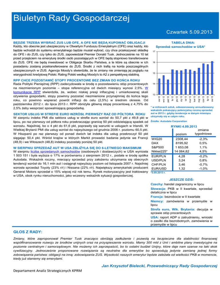 Biuletyn Rady Gospodarczej Czwartek 5.09.2013 SEKTOR USŁUG W STREFIE EURO WZRÓSŁ PIERWSZY RAZ OD PÓŁTORA ROKU W sierpniu indeks PMI dla sektora usług w strefie euro wzrósł do 50,7 pkt z 49,8 pkt w lipcu, po raz pierwszy od półtora roku przekraczając granicę 50 pkt oddzielającą spadek od wzrostu. Najsilniej, bo o 4 pkt do 61,6 pkt, poprawiły się warunki w usługach w Irlandii. W Wielkiej Brytanii PMI dla usług wzrósł do najwyższego od grudnia 2006 r. poziomu 60,5 pkt. W Hiszpanii po raz pierwszy od ponad dwóch lat indeks dla usług przekroczył 50 pkt sięgając 50,4 pkt. Wśród krajów w których Markit prowadzi badanie jedynie we Francji (48,9) i we Włoszech (48,8) indeksy pozostały poniżej 50 pkt. W SIERPNIU SPRZEDAŻ AUT W USA ZBLIŻYŁA SIĘ DO 6-LETNIEGO MAKSIMUM W sierpniu liczba sprzedanych samochodów (osobowych i dostawczych) w USA wyniosła 1 503 151 i była wyższa o 17% w porównaniu z sierpniem 2012 r., podała w środę spółka Autodata. Wskaźnik roczny, mierzący sprzedaż przy założeniu utrzymania się obecnych tendencji wzrósł do 16,1 mln aut i osiągnął najwyższy poziom od listopada 2007 r. Najsilniej wzrosła sprzedaż Toyoty (23% r/r) i Nissana (22% r/r). Największy amerykański producent General Motors sprzedał o 15% więcej niż rok temu. Rynek motoryzacyjny jest traktowany w USA, obok rynku nieruchomości, jako wczesny wskaźnik sytuacji gospodarczej. 17 16 15 14 lip 13 sie 13 cze 13 kwi 13 maj 13 lut 13 mar 13 sty 13 lis 12 gru 12 paź 12 13 sie 12 RPP CHCE POZOSTAWIĆ STOPY PROCENTOWE BEZ ZMIAN DO KOŃCA ROKU Rada Polityki Pieniężnej (RPP) zadecydowała w środę o pozostawieniu stóp procentowych na niezmienionym poziomie – stopa referencyjna od dwóch miesięcy wynosi 2,5%. W komunikacie RPP stwierdziła, że, wobec niskiej presji inflacyjnej i umiarkowanej skali ożywienia gospodarki, stopy powinny pozostać niezmienione przynajmniej do końca tego roku, co powinno wspierać powrót inflacji do celu (2,5%) w średnim okresie. Od października 2012 r. do lipca 2013 r. RPP obniżyła główną stopę procentową z 4,75% do 2,5% żeby wesprzeć spowalniającą gospodarkę. TABELA DNIA: Sprzedaż samochodów w USA* wrz 12 BĘDZIE TRZEBA WYBRAĆ ZUS LUB OFE, A OFE NIE BĘDĄ KUPOWAĆ OBLIGACJI Każdy, kto obecnie jest ubezpieczony w Otwartym Funduszu Emerytalnym (OFE) oraz każdy, kto będzie wchodził do systemu emerytalnego będzie musiał wybrać, czy chce przekazywać składkę do OFE i do ZUS, czy tylko do ZUS, zapowiedział Premier Donald Tusk. Jednocześnie na 10 lat przed przejściem na emeryturę środki osób pozostających w OFE będą stopniowo transferowane do ZUS. OFE nie będą inwestować w Obligacje Skarbu Państwa, a te które są obecnie w ich posiadaniu zostaną przetransferowane do ZUS. Środki z nich trafią na konta poszczególnych ubezpieczonych w ZUS. Agencja Moody’s stwierdziła, że te zmiany nie zmieniają jej poglądu na wiarygodność kredytową Polski. Rating Polski według Moody's to A2 z perspektywą stabilną. * w milionach sztuk, odsezonowany annualizowany wskaźnik pokazujący potencjalną roczną sprzedaż aut w 2013 r. gdyby tendencje w danym miesiącu utrzymały się w całym roku. Źródło: Autodata Corporation RYNKI 4.09.2013 poziom zmiana tygodniowa WIG20 DAX S&P500 Nikkei225* 2308,44 8195,92 1 653,08 14 064,82 -2,3% 0,5% 1,1% 4,5% EUR/PLN USD/PLN CHF/PLN EUR/USD 4,28 3,24 3,46 1,32 -0,2% 0,8% -0,7% -1,0% *5.09.2013 r. JESZCZE DZIŚ: Czechy: handel zagraniczny w lipcu Słowacja: PKB w II kwartale, sprzedaż detaliczna w lipcu Francja: bezrobocie w II kwartale Niemcy: zamówienia w przemyśle w lipcu Strefa euro, Wlk. Brytania: decyzja w sprawie stóp procentowych USA: raport ADP o zatrudnieniu, wnioski o zasiłki dla bezrobotnych, zamówienia w przemyśle w lipcu GŁOS Z RADY: Zmiany, które zaproponował Premier Tusk znacząco obniżają zadłużenie i pozwolą na bezpieczne dla stabilności finansowej współfinansowanie rozwoju ze środków unijnych oraz na przyspieszenie wzrostu. Mamy 300 mld z Unii i ambitne plany inwestycyjne na poziomie centralnym i samorządowym. Nie możemy ich zaprzepaścić, bo to ostatni budżet Unijny, które daje nam szanse na taki skok cywilizacyjny. Jednocześnie proponowane rozwiązania są neutralne dla emerytów bo spowodują jedynie zamianę jednej formy zobowiązania państwa: obligacji na inną: zobowiązania ZUS. Wysokość naszych emerytur będzie zależała od wielkości PKB w momencie, kiedy już staniemy się emerytami. Jan Krzysztof Bielecki, Przewodniczący Rady Gospodarczej Departament Analiz Strategicznych KPRM Departament Analiz Strategicznych KPRM 5,50 Rentowność 10-letnich obligacji złotowych 15 000 4,50 4,00 3,50 3,00 11 000 10 000 9 000 8 000 wrz 13 12 000 wrz 13 13 000 sie 13 14 000 sie 13 NIKKEI225 lip 13 16 000 lip 13 1,24 cze 13 1,26 cze 13 1,28 maj 13 1 500 maj 13 1,30 kwi 13 1 550 kwi 13 1,32 mar 13 1 700 mar 13 1 750 lut 13 1,34 wrz 13 sie 13 lip 13 cze 13 maj 13 kwi 13 mar 13 lut 13 sty 13 gru 12 lis 12 paź 12 wrz 12 wrz 13 sie 13 lip 13 cze 13 maj 13 kwi 13 wrz 13 sie 13 lip 13 cze 13 maj 13 kwi 13 mar 13 lut 13 sty 13 gru 12 lis 12 paź 12 wrz 12 wrz 13 sie 13 lip 13 cze 13 maj 13 kwi 13 mar 13 lut 13 sty 13 gru 12 lis 12 EUR/PLN lut 13 1,36 sty 13 EUR/USD sty 13 6 800 gru 12 3,25 gru 12 7 100 mar 13 3,45 lis 12 3,30 lut 13 3,50 lis 12 7 400 sty 13 CHF/PLN paź 12 3,35 gru 12 3,55 paź 12 7 700 lis 12 paź 12 wrz 12 4,00 wrz 12 wrz 13 sie 13 lip 13 cze 13 maj 13 kwi 13 3,40 paź 12 wrz 12 4,20 wrz 12 wrz 13 sie 13 lip 13 cze 13 maj 13 kwi 13 5,00 mar 13 lut 13 sty 13 gru 12 lis 12 paź 12 wrz 12 1,38 mar 13 lut 13 sty 13 gru 12 lis 12 paź 12 wrz 12 4,40 2 700 2 600 WIG20 4,30 2 500 2 400 4,10 2 300 2 200 2 100 8 600 8 300 DAX 8 000 S&P500 1 650 1 600 1 450 1 400 1 350 1 300