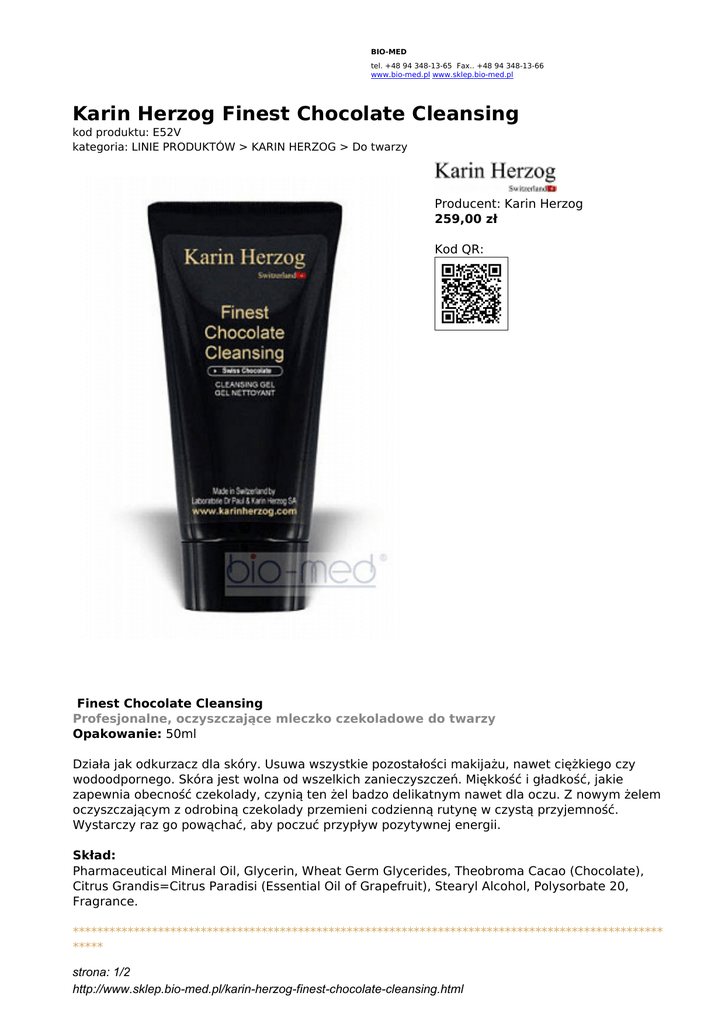 BIO-MED tel. +48 94 348-13-65 Fax.. +48 94 348-13-66 www.bio-med.pl www.sklep.bio-med.pl Karin Herzog Finest Chocolate Cleansing kod produktu: E52V kategoria: LINIE PRODUKTÓW > KARIN HERZOG > Do twarzy Producent: Karin Herzog 259,00 zł Kod QR: Finest Chocolate Cleansing Profesjonalne, oczyszczające mleczko czekoladowe do twarzy Opakowanie: 50ml Działa jak odkurzacz dla skóry. Usuwa wszystkie pozostałości makijażu, nawet ciężkiego czy wodoodpornego. Skóra jest wolna od wszelkich zanieczyszczeń. Miękkość i gładkość, jakie zapewnia obecność czekolady, czynią ten żel badzo delikatnym nawet dla oczu. Z nowym żelem oczyszczającym z odrobiną czekolady przemieni codzienną rutynę w czystą przyjemność. Wystarczy raz go powąchać, aby poczuć przypływ pozytywnej energii. Skład: Pharmaceutical Mineral Oil, Glycerin, Wheat Germ Glycerides, Theobroma Cacao (Chocolate), Citrus Grandis=Citrus Paradisi (Essential Oil of Grapefruit), Stearyl Alcohol, Polysorbate 20, Fragrance. ************************************************************************************************* ***** strona: 1/2 http://www.sklep.bio-med.pl/karin-herzog-finest-chocolate-cleansing.html DLACZEGO LINIA KOSMETYKÓW KARIN HERZOG JEST TAKA WYJĄTKOWA? Tlen działa antybakteryjnie, usuwa toksyny. Jest antyseptyczy i przeciwzapalny. Kontroluje wytwarzanie sebum i wspomaga wytwarzanie kolagenu, przez co następuje normalizacja skóry i jej rewitalizacja. Wspomaga działanie takich substancji jak: witamina A, H, glukoza, olejek różany, awokado, rumianek, kakao i innych składników wchodzących w skład produktów KH. Tlen jest znakomitym nośnikiem tych substancji. Umożliwia ich wniknięcie w głębiej położone warstwy skóry, ponieważ będąc w postaci płynnej w kremie uwalnia się w kontakcie ze skórą do postaci gazu. Następnie zwiększa swoją objętość ponad 20 razy i wytwarza ciśnienie pozwalające mu wniknąć do skóry właściwej. STOSOWANIE KOSMETYKÓW Z TLENEM KARIN HERZOG Nie powinno się łączyć produktów z tlenem KH z innymi markami kosmetyków. Tlen może spowodować niepożądane reakcje na skórze i wnieść nieznane substancje z innych kosmetyków do głębszych warstw skóry. Jeśli masz np. swoje ulubione mleczko lub tonik zmyj je wodą przed nałożeniem kremu z tlenem. Kosmetyki tlenowe KH zawierają ustabilizowany tlen (Hydrogen Peroxide). Dlatego mają delikatne działanie wybielające. Należy unikać kontaktu z brwiami i rzęsami. Zalecamy nałożenie kremu z tlenem na pędzelek i rozprowadzenie na wybrane części ciała bez wmasowywania w skórę. Ponieważ skóra rąk wchłonie więcej tlenu. Zrobi to szybciej niż np. skóra na twarzy. Efektywne działanie kremu ograniczy się wówczas do skóry dłoni, zamiast działać tam gdzie tego chcemy. Ze względu na tlen, który jest aktywnym czynnikiem, kosmetyki KH można zaliczyć do tzw. grupy kosmeceutyków. Produkty KH nie są testowane na zwierzętach i nie zawierają ekstraktów zwierzęcych. Testy produktów KH zostały przeprowadzone in vitro lub na wolontariuszach. Kosmetyki z tlenem KH nie zawierają konserwantów. strona: 2/2 http://www.sklep.bio-med.pl/karin-herzog-finest-chocolate-cleansing.html