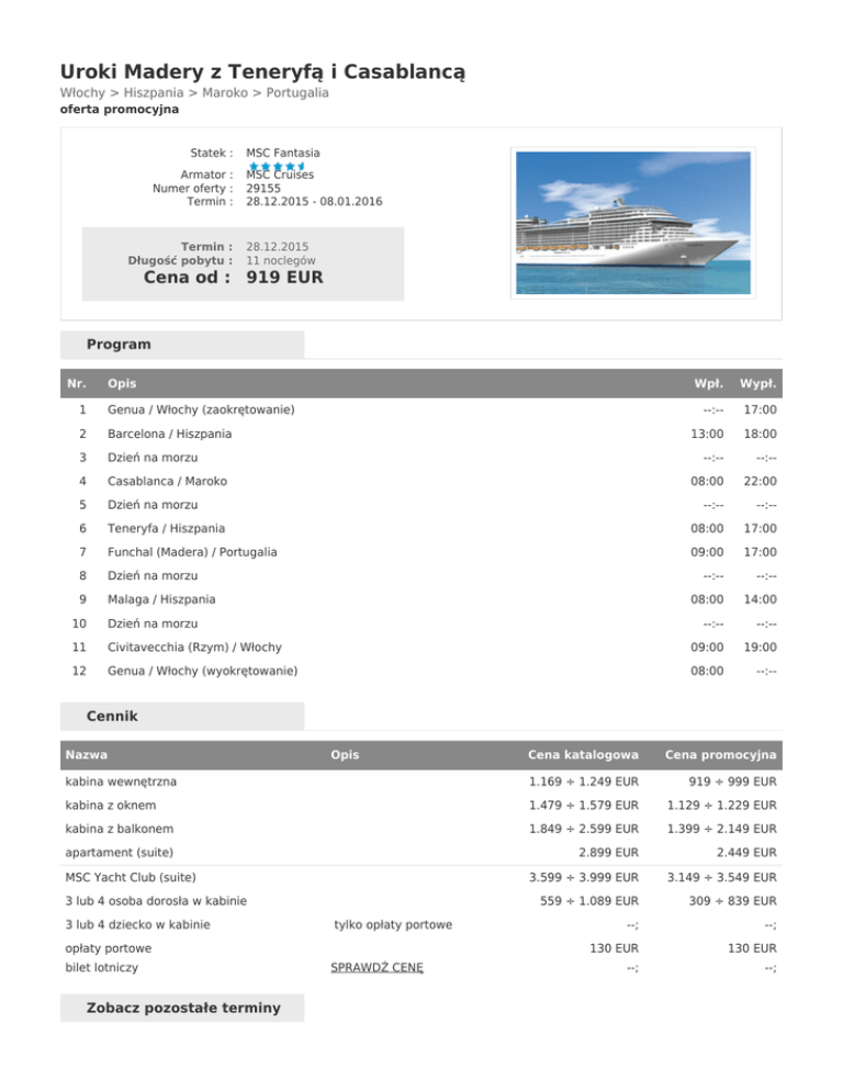Uroki Madery z Teneryfą i Casablancą Włochy > Hiszpania > Maroko > Portugalia oferta promocyjna Statek : Armator : Numer oferty : Termin : Termin : Długość pobytu : MSC Fantasia MSC Cruises 29155 28.12.2015 - 08.01.2016 28.12.2015 11 noclegów Cena od : 919 EUR Program Nr. Opis Wpł. Wypł. --:-- 17:00 13:00 18:00 --:-- --:-- 08:00 22:00 --:-- --:-- 1 Genua / Włochy (zaokrętowanie) 2 Barcelona / Hiszpania 3 Dzień na morzu 4 Casablanca / Maroko 5 Dzień na morzu 6 Teneryfa / Hiszpania 08:00 17:00 7 Funchal (Madera) / Portugalia 09:00 17:00 8 Dzień na morzu --:-- --:-- 9 Malaga / Hiszpania 08:00 14:00 --:-- --:-- 10 Dzień na morzu 11 Civitavecchia (Rzym) / Włochy 09:00 19:00 12 Genua / Włochy (wyokrętowanie) 08:00 --:-- Cennik Nazwa Opis Cena katalogowa Cena promocyjna kabina wewnętrzna 1.169 ÷ 1.249 EUR 919 ÷ 999 EUR kabina z oknem 1.479 ÷ 1.579 EUR 1.129 ÷ 1.229 EUR kabina z balkonem 1.849 ÷ 2.599 EUR 1.399 ÷ 2.149 EUR apartament (suite) 2.899 EUR 2.449 EUR 3.599 ÷ 3.999 EUR 3.149 ÷ 3.549 EUR 559 ÷ 1.089 EUR 309 ÷ 839 EUR --; --; 130 EUR 130 EUR --; --; MSC Yacht Club (suite) 3 lub 4 osoba dorosła w kabinie 3 lub 4 dziecko w kabinie tylko opłaty portowe opłaty portowe bilet lotniczy Zobacz pozostałe terminy SPRAWDŹ CENĘ 06.12.2015 28.12.2015 19.01.2016 10.02.2016 03.03.2016 05.04.2016 Informacje dodatkowe Cena obejmuje: ● ● ● ● ● ● ● zakwaterowanie w kabinie wybranej kategorii; serwis bagażowy i kabinowy; wyżywienie - 3 główne posiłki; przekąski między posiłkami; bufet lub przekąski o północy; korzystanie z basenu i innych urządzeń sportowo-rekreacyjnych; udział we wszystkich imprezach organizowanych na statku. Cena nie obejmuje: ● ● ● ● ● ● ● ● opłat portowych; kosztów dojazdu do portu; ewentualnych noclegów w hotelu przed/po rejsie i transferów (na zapytanie); wycieczek fakultatywnych; korzystania z punktów usługowych (pralnia, fotograf, salon piękności i odnowy biologicznej, internet); napojów do obiadów i kolacji, drinków; napiwków obowiązkowych dla obsługi statku (ok. 8,5€/dzień/osoba dorosła; 4,25€/dzień/dziecko); ubezpieczenia KL, NW i bagażu. ALL INCLUSIVE (opcja): Istnieje możliwość wykupienia pakietu ALL INCLUSIVE obejmującego wybrane napoje alkoholowe i bezalkoholowe dostępne bez ograniczeń we wszystkich barach. Cena pakietu: ● ● 26€/dzień/osoba dorosła; 12€/dzień/dziecko. Warunkiem skorzystania z pakietu all inclusive jest wykupienie pakietu przez wszystkich pasażerów podróżujących w jednej kabinie na czas całego rejsu. Uwagi: Kabiny 3/4 osobowe nie są dostępne we wszystkich kategoriach, a ich liczba jest ograniczona - sprzedaż tylko po potwierdzeniu; ceny wycieczek fakultatywnych, propozycje dojazdu do portu, hoteli przed/po rejsie na zapytanie. Na pokładzie statku obowiązuje bezgotówkowy system opłat. Należność reguluje się ostatniego dnia rejsu gotówką (wpłata depozytu ok. 250€/kabina pierwszego dnia rejsu) lub kartą kredytową (VISA, Mastercard, American Express) na podstawie zbiorczego rachunku. Karty kredytowe należy zarejestrować zaraz po zaokrętowaniu.
