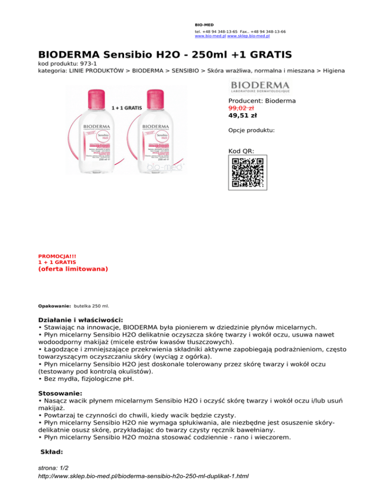 BIO-MED tel. +48 94 348-13-65 Fax.. +48 94 348-13-66 www.bio-med.pl www.sklep.bio-med.pl BIODERMA Sensibio H2O - 250ml +1 GRATIS kod produktu: 973-1 kategoria: LINIE PRODUKTÓW > BIODERMA > SENSIBIO > Skóra wrażliwa, normalna i mieszana > Higiena Producent: Bioderma 99,02 zł 49,51 zł Opcje produktu: Kod QR: PROMOCJA!!! 1 + 1 GRATIS (oferta limitowana) Opakowanie: butelka 250 ml. Działanie i właściwości: • Stawiając na innowacje, BIODERMA była pionierem w dziedzinie płynów micelarnych. • Płyn micelarny Sensibio H2O delikatnie oczyszcza skórę twarzy i wokół oczu, usuwa nawet wodoodporny makijaż (micele estrów kwasów tłuszczowych). • Łagodzące i zmniejszające przekrwienia składniki aktywne zapobiegają podrażnieniom, często towarzyszącym oczyszczaniu skóry (wyciąg z ogórka). • Płyn micelarny Sensibio H2O jest doskonale tolerowany przez skórę twarzy i wokół oczu (testowany pod kontrolą okulistów). • Bez mydła, fizjologiczne pH. Stosowanie: • Nasącz wacik płynem micelarnym Sensibio H2O i oczyść skórę twarzy i wokół oczu i/lub usuń makijaż. • Powtarzaj te czynności do chwili, kiedy wacik będzie czysty. • Płyn micelarny Sensibio H2O nie wymaga spłukiwania, ale niezbędne jest osuszenie skórydelikatnie osusz skórę, przykładając do twarzy czysty ręcznik bawełniany. • Płyn micelarny Sensibio H2O można stosować codziennie - rano i wieczorem. Skład: strona: 1/2 http://www.sklep.bio-med.pl/bioderma-sensibio-h2o-250-ml-duplikat-1.html WATER (AQUA), PEG-6 CAPRYLIC/CAPRIC GLYCERIDES, PROPYLENE GLYCOL, CUCUMIS SATIVUS (CUCUMBER) FRUIT EXTRACT, MANNITOL, XYLITOL, RHAMNOSE, FRUCTOOLIGOSACCHARIDES, DISODIUM EDTA, CETRIMONIUM BROMIDE strona: 2/2 http://www.sklep.bio-med.pl/bioderma-sensibio-h2o-250-ml-duplikat-1.html