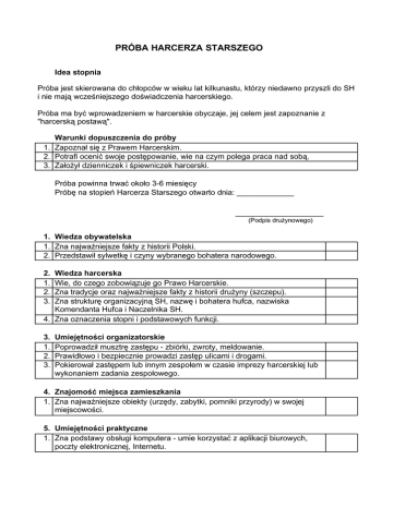 PRÓBA HARCERZA STARSZEGO Idea stopnia Próba jest skierowana do chłopców w wieku lat kilkunastu, którzy niedawno przyszli do SH i nie mają wcześniejszego doświadczenia harcerskiego. Próba ma być wprowadzeniem w harcerskie obyczaje, jej celem jest zapoznanie z "harcerską postawą". Warunki dopuszczenia do próby 1. Zapoznał się z Prawem Harcerskim. 2. Potrafi ocenić swoje postępowanie, wie na czym polega praca nad sobą. 3. Założył dzienniczek i śpiewniczek harcerski. Próba powinna trwać około 3-6 miesięcy Próbę na stopień Harcerza Starszego otwarto dnia: _____________ ____________________ (Podpis drużynowego) 1. Wiedza obywatelska 1. Zna najważniejsze fakty z historii Polski. 2. Przedstawił sylwetkę i czyny wybranego bohatera narodowego. 2. 1. 2. 3. Wiedza harcerska Wie, do czego zobowiązuje go Prawo Harcerskie. Zna tradycje oraz najważniejsze fakty z historii drużyny (szczepu). Zna strukturę organizacyjną SH, nazwę i bohatera hufca, nazwiska Komendanta Hufca i Naczelnika SH. 4. Zna oznaczenia stopni i podstawowych funkcji. 3. 1. 2. 3. Umiejętności organizatorskie Poprowadził musztrę zastępu - zbiórki, zwroty, meldowanie. Prawidłowo i bezpiecznie prowadzi zastęp ulicami i drogami. Pokierował zastępem lub innym zespołem w czasie imprezy harcerskiej lub wykonaniem zadania zespołowego. 4. Znajomość miejsca zamieszkania 1. Zna najważniejsze obiekty (urzędy, zabytki, pomniki przyrody) w swojej miejscowości. 5. Umiejętności praktyczne 1. Zna podstawy obsługi komputera - umie korzystać z aplikacji biurowych, poczty elektronicznej, Internetu. 2. Sprawnie wykonuje drobne naprawy, wymienił żarówkę, bezpiecznik, naprawił lampę, naoliwił zamek, konserwował rower itp. 3. Realizując swoje zainteresowania wykonał potrzebny mu przedmiot. 6. Sprawność 1. Podczas próby poprawił umiejętności w wybranej dyscyplinie sportowej (np. biegach, pływaniu itp.). 2. Wziął udział w grze terenowej. 7. Wycieczkowanie 1. Zna zasady zachowania na szlaku. 2. Zaplanował wycieczkę zastępu. Skompletował ekwipunek i prowiant zastępu na wycieczkę dwudniową. 8. Przyroda 1. Rozpoznaje rośliny jadalne, lecznicze i trujące (np. owoce, grzyby, zioła itp.). 9. Łączność 1. Potrafi nawiązać łączność przy użyciu CB radia, radia UKF lub telefonu polowego. Umie wezwać pomoc przy użyciu telefonu komórkowego. 2. Ułożył prosty szyfr i wykorzystał go w trakcie pracy harcerskiej. 10. Terenoznawstwo 1. Posługuje się busolą, wyznaczył azymut w terenie, przejdzie wyznaczony odcinek wg azymutu. 2. Wyznaczył strony świata wg punktów w terenie. 11. Pionierka 1. Rozpalił ognisko w trudnych warunkach (np. po deszczu, 3 zapałkami itp.) 2. Stosuje 6 węzłów (skrócił i zakończył linkę, połączył linką elementy drewniane, przywiązał linę do palika). 12. Samarytanka 1. Skompletował apteczkę polową zastępu, potrafi z niej skorzystać. 2. Rozumie szkodliwość tytoniu, alkoholu i narkotyków dla zdrowia. 13. 1. 2. 3. Praca nad sobą Potrafi organizować swój czas. Jest oszczędny i gospodarny - wziął udział w akcji zarobkowej. Zdobył min. jedną sprawność 2-go stopnia. Komentarze i wytyczne 1. "Próba Harcerza Starszego" skierowana jest do nowych harcerzy. Nie dopuszczamy otwierania powyższych prób przez harcerzy zdobywających wcześniej stopnie wg standardowych regulaminów. 2. Stopień może być zdobywany przy Kapitułach Stopni bądź pod kierunkiem Drużynowych - w zależności od sytuacji kadrowej środowiska. 3. Próba jest skierowana do chłopców w wieku od 14-15 lat. Decyzję o otwarciu próby, szczególnie dla chłopców z pierwszej klasy gimnazjum podejmuje Drużynowy - w zależności od wieku i wyszkolenia harcerzy w Drużynie. W razie wątpliwości zalecamy konsultacje z Hufcową Kapitułą Stopnia Ćwika. 4. Rekomendujemy, aby Próba Harcerza Starszego była rozpisywana, ale dopuszczamy również wariant bez rozpisywania - zakładając, że nowemu harcerzowi dopiero wkraczającymi w "harcerskość" będzie łatwiej wymyślać zadania do poszczególnych wymagań podczas realizacji próby. 5. Dopuszczamy modyfikacje przedstawionego regulaminu mające na celu lepsze dostosowanie wymagań do potrzeb zdobywającego. Wszelkie zmiany winny być każdorazowo zatwierdzane przez prowadzących próby - Drużynowego bądź właściwą Kapitułę Stopni. Próba Harcerza Starszego została zatwierdzona przez Naczelnictwo SH dnia 11.05.2007
