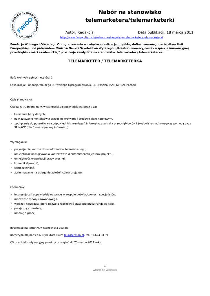 Nabór na stanowisko telemarketera/telemarketerki Autor: Redakcja Data publikacji: 18 marca 2011 http://www.fwioo.pl/article/nabor-na-stanowisko-telemarketeratelemarketerki Fundacja Wolnego i Otwartego Oprogramowania w związku z realizacją projektu, dofinansowanego ze środków Unii Europejskiej, pod patronatem Ministra Nauki i Szkolnictwa Wyższego: „Kreator innowacyjności - wsparcie innowacyjnej przedsiębiorczości akademickiej" poszukuje kandydata na stanowisko: telemarketer / telemarketerka. TELEMARKETER / TELEMARKETERKA Ilość wolnych pełnych etatów: 2 Lokalizacja: Fundacja Wolnego i Otwartego Oprogramowania, ul. Staszica 25/8, 60-524 Poznań Opis stanowiska: Osoba zatrudniona na w/w stanowisku odpowiedzialna będzie za: • tworzenie bazy danych, • nawiązywanie kontaktów z przedsiębiorstwami i środowiskiem naukowym, • zachęcanie do poszukiwania odpowiednich rozwiązań informatycznych dla przedsiębiorców i środowiska naukowego za pomocą bazy SPINACZ (platforma wymiany informacji). Wymagania: • przynajmniej roczne doświadczenie w telemarketingu, • umiejętność nawiązywania kontaktów z klientami/beneficjentami projektu, • umiejętność organizacji pracy własnej, • komunikatywność, • samodzielność, • zorientowanie na osiąganie założeń celów projektu. Oferujemy: • interesującą i odpowiedzialna pracę w zespole doświadczonych specjalistów, • możliwość rozwoju zawodowego, • wiedzę i narzędzia, które pozwolą realizować stawiane przez Fundację cele, • przyjazną atmosferę, • umowę o pracę. Informacji na temat w/w stanowiska udziela: Katarzyna Klejnons p.o. Dyrektora Biura [email protected], tel. 61-624 34 74 CV oraz List motywacyjny prosimy przesyłać do 25 marca 2011 roku. 1 WERSJA DO WYDRUKU