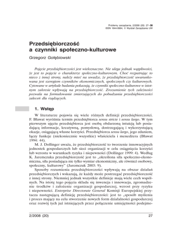 Problemy zarządzania, 2/2008 (20): 27����� ���� –��� �� 38 ISSN 1644-9584, © Wydział Zarządzania UW Przedsiębiorczość a czynniki społeczno-kulturowe Grzegorz Gołębiowski Pojęcie przedsiębiorczości jest wieloznaczne. Nie ulega jednak wątpliwości, że jest to pojęcie o charakterze społeczno-kulturowym. Choć rozpatrując to nieco z innej strony, należy mieć na uwadze, że przedsiębiorczość uwarunkowana jest szeregiem czynników ekonomicznych, społecznych czy kulturowych. Cytowane w artykule badania pokazują, że czynniki społeczno-kulturowe w istotnym zakresie wpływają na przedsiębiorczość. Zrozumienie tych zależności pozwala na formułowanie zmierzających do pobudzania przedsiębiorczości zaleceń dla rządzących. 1. Wstęp W literaturze pojawia się wiele różnych definicji przedsiębiorczości. F. Bławat wyróżnia termin przedsiębiorca sensu stricte i sensu largo. W tym pierwszym ujęciu przedsiębiorca jest osobą obdarzoną intuicją lub posiadającą informacje, kreatywną, pomysłową, dostrzegającą i wykorzystującą okazje, osiągającą własne korzyści. Przedsiębiorca sensu largo, jego zdaniem, łączy funkcje (niekoniecznie wszystkie) właściciela i menedżera (Bławat 1994: 44). M. J. Dollinger uważa, że przedsiębiorczość to tworzenie innowacyjnych jednostek gospodarczych lub sieci organizacji w celu osiągnięcia korzyści lub wzrostu w warunkach ryzyka i niepewności (Dollinger 1999: 4). Według K. Jaremczuka przedsiębiorczość jest to „określona siła społeczno-ekonomiczna, siła posiadająca nie tylko wymiar ekonomiczny, ale również osobowy, społeczny, kulturowy” (Jaremczuk 2003: 9). Sposoby rozumienia przedsiębiorczości wpływają na obszar działań przedsiębiorczych i wskazują, że każdy może postrzegać przedsiębiorczość z innej strony. Niemniej jednak wszystkie definicje mają wiele cech wspólnych. Na istotę tego pojęcia składa się inwencja i innowacja, zgromadzenie środków i założenie organizacji gospodarczej, wzrost przy ryzyku i niepewności. Enterprise Directorate General Komisji Europejskiej przytacza następującą definicję przedsiębiorczości: jest to „sposób myślenia i proces mający na celu stworzenie nowych form działalności gospodarczej oraz rozwój tych już istniejących przez połączenie umiejętności podejmo2/2008 (20) 27